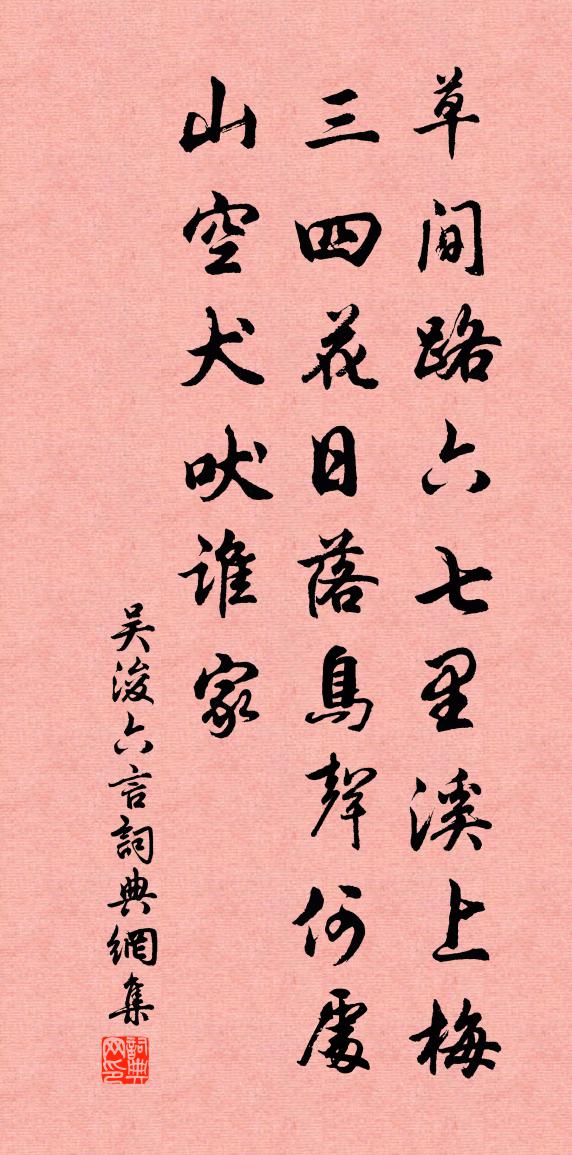 詩詞名句歷史字典書法欣賞書法字典國語詞典說文解字康熙字典古漢語字典標 題 作 者 詩 句 六言作者:吳浚 朝代:宋代六言原文草間路六七里,溪上梅三四花。日落鳥聲何處,山空犬吠誰家。詩詞問答問:六言的作者是誰?答:吳浚問:六言寫於哪個朝代?答:宋代吳浚六言書法欣賞六言書法作品詩詞推薦曉起楊萬里〔宋代〕霜挾清寒凍 * ,袖中十指怯頭巾。金篦落地拾不得,卻是穿窗曉日痕。聞開元寺開筍園寄章上人皮日休〔唐代〕園鎖開聲駭鹿群,滿林鮮籜水犀文。森森競泫林梢雨,木雙木雙爭穿石上雲。並出亦如鵝管合,各生還似犬牙分。辛卯年雪韓愈〔唐代〕元和六年春,寒氣不肯歸。河南二月末,雪花一尺圍。崩騰相排拶,龍鳳交橫飛。波濤何飄揚,天風吹幡旂。白帝牡丹張又新〔唐代〕牡丹一朵值千金,將謂從來色最深。今日滿欄開似雪,一生辜負看花心。和用明梅十三絕胡寅〔宋代〕綠萼全勝紅萼好,新枝爭亞舊枝長。賞心未減春風蝶,傍蕊穿花栩栩狂。八月八日發潭州後得絕句四十首趙蕃〔宋代〕老去真成病不禁,炎蒸三日瘧如侵。江山舊識思新面,佳處真成略枕衾。次韻邦直見答二首蘇轍〔宋代〕真能一醉逃煩暑,定勝三杯御臘寒。自有詩書供永日,莫將絲竹亂風灘。舞雩何處歸春莫,叩角誰人怨夜漫。聞道偶書黃庚〔宋代〕頻年蹤跡墮江湖,三徑荒苔憶舊廬。身老方知生計拙,家貧漸覺故人疏。松薪拾去朝炊黍,漁火分來夜讀書。怨鶴鴛鴦湖棹歌 之二十朱彝尊〔清代〕徐園青李核何纖,未比僧廬味更甜。聽說西施曾一搯,至今顆顆爪痕添。平江守禱晴即應時近元夕矣寄呈五絕句仲並〔宋代〕東風吹斷雨如繩,一夜仍開曲沼冰。便試元宵強半月,孰知天意欲催燈。送蔣德常宰鄱陽樓鑰〔宋代〕棋社頗寥落,聚舍多差參。矧如夫君賢,貴重雙南金。豈可無此君,周旋相與深。一別歸未久,征鞍又駸駸。老我詩一首蔡襄〔宋代〕紫綬金章被寵榮,筆床茶灶伴參苓。只知江海能行道,未識朝廷舊有名。笑我病去相榮□,圭刀小試即春生。瘡痍四老堂詩仲並〔宋代〕便勝從來三戟門,良金如友玉如昆。天邊鴻雁空千里,堂上壎箎共一樽。自昔披榛扶社稷,幾人衣錦向邱園。商山想車音/兀令賀鑄〔宋代〕盤馬樓前風日好。雪銷塵掃。樓上宮妝早。認簾箔微開,一面嫣妍笑。攜手別院重廊,窈窕花房小。任碧羅窗曉。壺中天(壽婦人又良人登科·七月初二)佚名〔宋代〕秋來兩日,因個甚、鳥鵲侵晨傳喜。卻是常娥親姊妹,降作人間佳麗。黛柳長青,官梅穩親,鏡里春明媚。花顏難頌證道歌證道歌釋印肅〔宋代〕摘葉尋枝我不能,和根拔出示眾生。只這菩提本無樹,撩天映岳碧層層。劉忠定書簡帖贊岳珂〔宋代〕公心如鐵,萬仞壁立。聲名百年,翰墨十襲。絕景獨睨,奔塵莫及。曰誰為之,目不妄入。野蠶李復〔宋代〕野蠶緣桑自成繭,群兒采繭殘桑枝。明年家蠶黑蟻出,四中桑死蠶忍飢。野繭更彩不滿筥,家蟻歲生無盡時。翁乎魏鴻禧敘別二首袁甫〔宋代〕別有金丹簡且真,不煩火候不勞神。自知自信融融樂,無慮無營盎盎春。天地游心元廣大,風雲入句更精神。我將永明樂 六謝朓〔南北朝〕出車長洲苑。選族朝夕川。絡絡結雲騎。奕奕泛戈船。名句推薦合意客來心不厭,知音人聽話偏長。馮夢龍《警世通言·卷一》 何處可為別,長安青綺門。李白《送裴十八圖南歸嵩山二首》 怒猊抉石,渴驥奔泉宋祁、歐陽修、范鎮、呂夏卿等《新唐書·列傳·卷八十五》 人主之患,在於信人,信人,則制於人。韓非及後人《韓非子·備內》 魂來楓葉青,魂返關塞蒙杜甫《夢李白二首·其一》 與人不求備,檢身若不及佚名《尚書·商書·伊訓》 始於文而卒於武,天地之道也。佚名《黃帝四經·經法·論約》 始憐幽竹山窗下,不改清陰待我歸。錢起《晚春歸山居題窗前竹 / 暮春歸故山草堂詩》 獨立揚新令,千營共一呼。盧綸《和張僕射塞下曲·其一》 足國之道:節用裕民,而善臧其餘。荀子《荀子·富國》