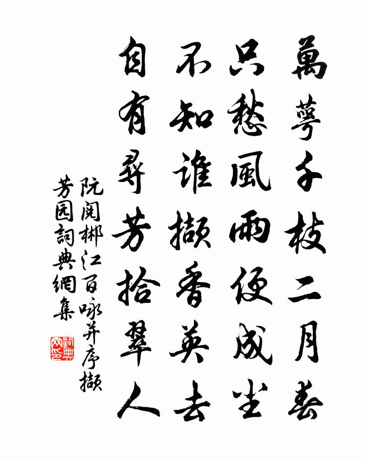 詩詞名句歷史字典書法欣賞書法字典國語詞典說文解字康熙字典古漢語字典標 題 作 者 詩 句 郴江百詠並序擷芳園作者:阮閱 朝代:宋代郴江百詠並序擷芳園原文萬萼千枝二月春,只愁風雨便成塵。不知誰擷香英去,自有尋芳拾翠人。詩詞問答問:郴江百詠並序擷芳園的作者是誰?答:阮閱問:郴江百詠並序擷芳園寫於哪個朝代?答:宋代阮閱郴江百詠並序擷芳園書法欣賞郴江百詠並序擷芳園書法作品詩詞推薦題城南書院三十四詠張栻〔宋代〕暮從別野跨驢歸,風雨蕭蕭泥濺衣。出門回首且按轡,細聽泉聲和式微。題李衛公詩二首溫庭筠〔唐代〕蒿棘深春衛國門,九年於此盜乾坤。兩行密疏傾天下,一夜陰謀達至尊。肉視具僚忘匕箸,氣吞同列削寒溫。當時游北山王安石〔宋代〕攬轡出東城,登臨目暫明。煙雲藏古意,猿鶴弄秋聲。客坐苔紋滑,僧眠樾蔭清。賞心殊未已,山日下西榮。和子由記園中草木十一首蘇軾〔宋代〕官舍有叢竹,結根問囚廳。下為人所徑,土密不容釘。殷勤戒吏卒,插棘護中庭。遶砌忽墳裂,走鞭瘦伶竮。我常野望董嗣杲〔宋代〕過午浮陰掩石台,疾風掠草散狂埃。江豚吹皺空江浪,遠見淮雲卷雨來。和立齋歲寒歌五章王柏〔宋代〕羌人生之秉貞兮孰無陽秋,惟澹而無欲兮斯能無求。宜此心之冰堅兮凜北風之正遒,歲寒之常兮足以自修。滿替在眼即景賦二首董嗣杲〔宋代〕野分霜信薄,溪落雨痕乾。僻邑催冬早,遙林積暝寒。雞棲隱壞壁,鶴老戀空關。燭下哀箏發,樓頭送漏殘。和友人論詩二首汪炎昶〔宋代〕原自風騷濬,相從李杜尋。煙雲裁骨制,月露洗胸襟。所施殊高下,論功聲淺深。億饒材力贍,政要苦留心。一剪梅侯善淵〔元代〕出俗輕枝翠嫩長。不比松筠,獨耐風霜。歲寒心以表嘉祥。小蕾初生,壓盡群芳。勿遣娉婷越粉牆。盡任桓伊,品眉嫵(一名百宜嬌戲張仲遠)姜夔〔宋代〕看垂楊連苑,杜若侵沙,愁損未歸眼。信馬青樓去,重簾下,娉婷人妙飛燕。翠尊共款。聽艷歌、郎意先感。便攜木蘭花/玉樓春葉夢得〔宋代〕花殘卻是春留戀。幾日餘香吹酒面。濕煙不隔柳條青,小雨池塘初有燕。波光縱使明如練。可奈落紅紛似霰。解將自蘇州至望亭驛有作(一作李嘉祐詩)郭良驥〔唐代〕南浦菰蒲繞白蘋,東吳黎庶逐黃巾。野棠自發空流水,江燕初歸不見人。遠岫依依如送客,平田渺渺獨傷春。那堪孫賁知衢州去疑冢以其所得雙石作堂乞詩張舜民〔宋代〕芝蘭雖好忌當門,何況庭前惡土墩。畚鍤才興雙劍出,狐狸盡去老松蹲。百年守冢真堪笑,一日開軒亦可尊。安得踏莎行(五月十三日月甚佳)張孝祥〔宋代〕藕葉池塘,榕陰庭院。年時好月今宵見。雲鬢玉臂共清寒,冰綃霧縠誰裁剪。撲粉口綿,侵塵寶扇。遙知掩抑成淒滿庭芳佚名〔宋代〕星宿呈祥,溪山鍾秀,凜然生此真賢。冰清玉潤,還稱歲寒天。正是梅梢醞雪,探江南,春信先傳。庭軒爽,涓涓魯郡東石門送杜二甫李白〔唐代〕醉別復幾日,登臨遍池台。何時石門路,重有金樽開。秋波落泗水,海色明徂徠。飛蓬各自遠,且盡手中杯。寄題密州蘇學士快哉亭太史雲此城之西北送客文同〔宋代〕出城送客客未來,主人到此先徘徊。地臨濰水極清曠,每為送客雙眼開。客來既坐歌管作,紅袖勸酒無停杯。主人客情王冕〔元代〕幾日不啟戶,庭前青草多。故緣詩思澀,不奈客情何。貧賤家無定,英雄劍懶磨。江山千萬里,回首一長歌。次韻再作歐陽修〔宋代〕吾年向世味薄,所好未衰惟飲茶。建溪苦遠雖不到,自少嘗見閩人夸。每嗤江浙凡茗草,叢生狼藉惟藏蛇。豈如含蔡處士鄭谷〔唐代〕無著復無求,平生不解愁。鬻蔬貧潔淨,中酒病風流。旨趣陶山相,詩篇沈隱侯。小齋江色里,籬柱系漁舟。名句推薦玉在櫝中求善價,釵於奩內待時飛。曹雪芹《紅樓夢·第一回》 四寸之管無當,必不滿也。授官、予爵、出祿不以功,是無當也。商鞅《商君書·靳令》 曉月墜,宿雲微,無語枕頻欹。李煜《喜遷鶯·曉月墜》 三日柴門擁不開,階平庭滿白皚皚。柳宗元《酬王二十舍人雪中見寄》 繞池閒步看魚游,正值兒童弄釣舟。白居易《觀游魚》 渭北春天樹,江東日暮雲。杜甫《春日憶李白》 茶之筍者,竽爛石沃土,長四、五寸,若薇蕨始抽,凌露采焉。陸羽《茶經·三之造》 家山何在,雪後園林,水邊樓閣。辛棄疾《瑞鶴仙·賦梅》 耕夫召募愛樓船,春草青青萬項田;張繼《閭門即事》 不怕風狂雨驟,恰才稱,煮酒箋花。李清照《轉調滿庭芳·芳草池塘》