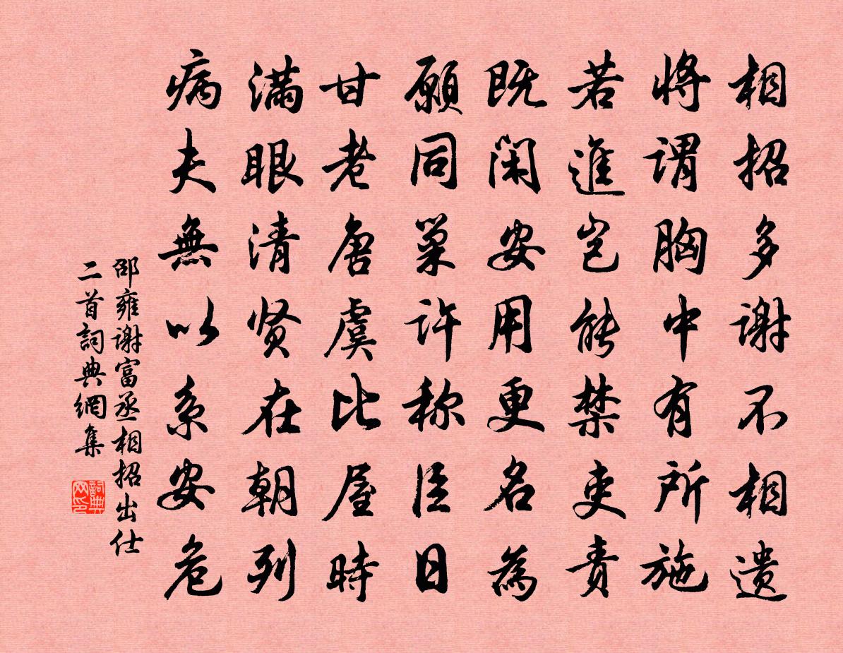 詩詞名句歷史字典書法欣賞書法字典國語詞典說文解字康熙字典古漢語字典標 題 作 者 詩 句 謝富丞相招出仕二首作者:邵雍 朝代:宋代謝富丞相招出仕二首原文相招多謝不相遺,將謂胸中有所施。若進豈能禁吏責,既閒安用更名為。願同巢許稱臣日,甘老唐虞比屋時。滿眼清賢在朝列,病夫無以系安危。詩詞問答問:謝富丞相招出仕二首的作者是誰?答:邵雍問:謝富丞相招出仕二首寫於哪個朝代?答:宋代邵雍謝富丞相招出仕二首書法欣賞謝富丞相招出仕二首書法作品詩詞推薦慶侍郎趙孟僖〔宋代〕渭川此際載非熊,紫詔行頒玉殿樂。正好促裝趨北闕,元正端的拜三公。贈彥清洪皓〔宋代〕好生惡殺號蒼天,天憫斯民欲息肩。自是大邦後不戢,在於南國使無{左亻右替日換心}。論功弗用矜三捷,寺勝行路難戴叔倫〔唐代〕出門行路難,富貴安可期。淮陰不免惡少辱,阮生亦作窮途悲。顛倒英雄古來有,封侯卻屬屠沽兒。長安車馬隨輕詠史下高堂隆陳普〔宋代〕負土衣冠亂滿園,不知曹德是軒轅。土山白盡忠臣發,何似初來莫妄言。追和戊寅歲上元蘇軾〔宋代〕賓鴻社燕巧相違,白鶴峰頭白板扉。石建方欣洗牏廁,姜龐不解嘆蕭蝛。一龕京口嗟春夢,萬炬錢塘憶夜歸。合宿華嚴院劉燾〔宋代〕夜宿霧山霧,晨茹芝山芝。年來嗜好衰,但與青山宜。登臨意未愜,出戶車已脂。王事有期程,愛山豈余私。崎嶇寄題新昌簿廳綠陰亭沈繼祖〔宋代〕洛上追收黃耳信,林間聞創綠陰亭。千章古樹虛簾接,四月清風羽扇停。兄弟頭顱時感嘆,江湖歲月久飄零。對床木闌花慢邢叔亨〔元代〕蒲縣泰山古廟,崇強似梵王宮。去踏翠沾靴,採薇滿擔,一袖香風。朝中大官佐政,輕衣蓋體坐肥驄。讒*面諛時和王子賢兄陳宓〔宋代〕芒鞋未辦足先輕,擬踏白雲深處行。何日痴兒了公事,卻將泉石課詩程。武學蔡博乾輓詩項安世〔宋代〕天子昔好武,儒臣皆諱文。誰能有勝具,不肯建奇勳。半世觀行己,千年勸事君。底須登大耋,金印負前聞。離宛丘舟中作宋祁〔宋代〕孑孑歸檣五兩斜,浮雲盡處是京華。不隨東魯人浮海,正似新豐犬識家。笏首新荷尋珥筆,腰間故印解垂緺。多年登北山熊石兒〔明代〕何苦入塵網,山高可嘯天。采芝時一得,弄日莫能先。徑僻無凡客,雲深有大仙。武陵人不遠,坐待此峰巔。次韻章禹直開元寺觀畫壁兼簡李德素黃庭堅〔宋代〕丹青古藏壁,風雨飽侵食。拂塵開藻鑒,志士淚沾臆。靈山遠飛來,不可以智測。龍神湛回向,擁衛立劍戟。依稀劍李嶠〔唐代〕我有昆吾劍,求趨夫子庭。白虹時切玉,紫氣夜乾星。鍔上芙蓉動,匣中霜雪明。倚天持報國,畫地取雄名。聲聲令/勝勝令章楶〔宋代〕簾移碎影,香褪衣襟。舊家庭院嫩苔侵。東風過盡,暮雲鎖,綠窗深。怕對人、閒枕剩衾。樓底輕陰。春信斷,怯定花阻風五首李曾伯〔宋代〕綠柳橋頭舊酒爐,幾番艤棹勞篙夫。恍疑風撤青簾去,敲盡荊扉閉不酤。病起觀盆魚強至〔宋代〕戢戢駢頭戲,悠悠掉尾行。莫言盆盎窄,猶勝網羅橫。競觸浮萍亂,時吹細浪生。嗟予遭病縛,羨汝遂微情。鴛鴦湖棹歌 之五十六朱彝尊〔清代〕屋上鳩鳴穀雨開,橫塘游女蕩舟回。桃花落後蠶齊浴,竹筍抽時燕便來。題興道院藍光軒葉翥〔宋代〕出郭才咫尺,便覺山意幽。招提立絕頂,寶塔凌空浮。小軒足娛客,下有清溪流。翠岫供遠眺,直欲明雙眸。平蕪自詠陸游〔宋代〕常記當年入洛初,華燈百萬擲樗蒲。平生意薄刀筆吏,投老身為山澤臞。已罷向空書咄咄,尚能擊缶和嗚嗚。今朝名句推薦不仁而富,謂之不幸。牆隙而高,其崩必疾也。范曄《後漢書·列傳·方術列傳上》 全則必缺,極則必反,盈則必虧。呂不韋《呂氏春秋·論·不苟論》 行人悵望王孫去,買斷金釵十二愁。俞紫芝《詠草》 燕支長寒雪作花,蛾眉憔悴沒胡沙。李白《王昭君二首》 對飲食,勿揀擇。食適可,勿過則。李毓秀《弟子規·謹》 夜雨剪春韭,新炊間黃粱。杜甫《贈衛八處士》 堂前撲棗任西鄰,無食無兒一婦人。杜甫《又呈吳郎》 林暗草驚風,將軍夜引弓。盧綸《和張僕射塞下曲·其二》 正身直行,眾邪自息。劉安及其門客《淮南子·繆稱訓》 年年春日異鄉悲,杜曲黃鶯可得知。韋莊《江外思鄉》