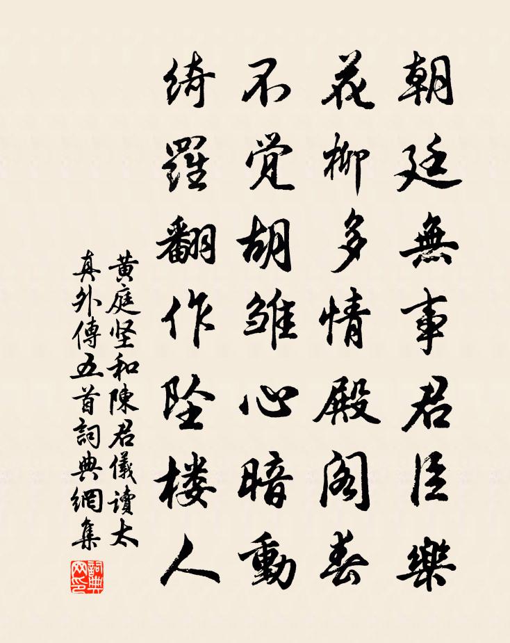 詩詞名句歷史字典書法欣賞書法字典國語詞典說文解字康熙字典古漢語字典標 題 作 者 詩 句 和陳君儀讀太真外傳五首作者:黃庭堅 朝代:宋代和陳君儀讀太真外傳五首原文朝廷無事君臣樂,花柳多情殿閣春。不覺胡雛心暗動,綺羅翻作墜樓人。詩詞問答問:和陳君儀讀太真外傳五首的作者是誰?答:黃庭堅問:和陳君儀讀太真外傳五首寫於哪個朝代?答:宋代問:黃庭堅的名句有哪些?答:黃庭堅名句大全黃庭堅和陳君儀讀太真外傳五首書法欣賞和陳君儀讀太真外傳五首書法作品詩詞推薦和王師中胡宏〔宋代〕誰驚河凍履秋霜,今日金湯古壞牆。未見主人來北道,但聞群盜去南塘。憂時我不嗟留滯,訪道公能適莽蒼。絳帳夏日宿西禪院潘閬〔宋代〕此地絕炎蒸,深疑到不能。夜涼如有雨,院靜若無僧。枕潤連雲石,窗明照佛燈。浮生多賤骨,時日恐難勝。酷吏列傳序司馬遷〔兩漢〕孔子曰:“導之以政,齊之以刑,民免而無恥。導之以德,齊之以禮,有恥且格。”老氏稱:“上德不德,是以有題跋黃魯直讀書岩字二十言李壁〔宋代〕筆法推黃子,鐘王共一機。試摹三大字,歸榜舊岩扉。點絳唇史浩〔宋代〕翠幄園林,火雲方綻南薰起。玉輪天外。夜色涼如水。況有清歌,勸我尊浮蟻。拚沈醉。萬花叢里。一枕朦朧睡。勸農謝諤〔宋代〕莫入州衙與縣衙,勸君勤理舊生涯。池塘多放聊添稅,田地深耕足養家。教子教孫須教義,栽桑栽柘勝栽花。閒非聞開江相國宋(一作宋相公申錫)下世二首杜牧〔唐代〕權門陰進奪移才,驛騎如星墮峽來。晁氏有恩忠作禍,賈生無罪直為災。貞魂誤向崇山沒,冤氣疑從湘水回。畢竟鞦韆二首李覯〔宋代〕風靜高標埋暗霧,月明孤影落澄波。狂心擬逐游童上,無奈春醪足困何。玉樓春·和吳見山韻吳文英〔宋代〕闌乾獨倚天涯客。心影暗凋風葉寂。千山秋入雨中青,一雁暮隨雲去急。霜花強弄春顏色。相吊年光澆大白。海煙春日溪上示南正四首宋祁〔宋代〕春雲拂拂柳搖搖,盡日相望似見招。此意只應人未會,自持杯酒上溪橋。絕句歐陽鈇〔宋代〕戀樹殘紅濕不飛,楊花雪落木生衣。年來百念成灰冷,無語送春春自歸。梅花李流謙〔宋代〕道人一味著幽禪,誰遣天花到眼邊。亂插銅瓶看盡日,向人終是好因緣。【正宮】醉太平_寒食珠簾外王元鼎〔元代〕寒食珠簾外燕飛,喬木上鶯啼,鶯鶯燕燕正寒食,想人生有幾。有花無酒難成配,無花有酒難成對。今日有花有酒祇役駱口驛喜蕭侍御書至兼睹新詩吟諷通宵因寄八韻白居易〔唐代〕日暮心無憀,吏役正營營。忽驚芳信至,復與新詩並。是時天無雲,山館有月明。月下讀數偏,風前吟一聲。一吟夢覺釋文珦〔宋代〕七十五聲更漏,一千餘里鄉心。夢裡分明歸去,覺來無處追尋。題彌勒院章孝參〔宋代〕橋通流水綠溶溶,殿閣穹然鎮象龍。半壁石橋通雪竇,一龕麗室占雷峰。掛岩屋似六和塔,入路門如九里松。遙想水亭寫興釋文珦〔宋代〕為愛幽亭枕碧流,乘閒於此對沙鷗。荷傾宿雨明珠碎,蒲颭輕風翠帶柔。列岫周遭疑雉堞,斷霞零落似汀洲。無人初春有感寄歙州邢員外杜牧〔唐代〕雪漲前溪水,啼聲已繞灘。梅衰未減態,春嫩不禁寒。跡去夢一覺,年來事百般。聞君亦多感,何處倚闌乾?開東園路北至山腳因治路傍隙地雜植花草陸游〔宋代〕病眼逢人每嬾開,正須此地洗氛埃。數枝梅向林梢出,一脈泉從嶺背來。藤杖有時緣石磴,風爐隨處置茶杯。殘軀題王尉半竹方岳〔宋代〕吾始過西齋,破於玉川屋。中有山澤癯,雪燈共夜讀。秋聲入雨聽,手攜牆下竹。攜鋤斸荒苔,寧甘食無肉。今春名句推薦相見易得好,久住難為人。佚名《增廣賢文·上集》 料黛眉重鎖隋堤,芳心還動梁苑。盧祖皋《宴清都·初春》 黃埃散漫風蕭索,雲棧縈紆登劍閣。白居易《長恨歌》 勸君更盡一杯酒,西出陽關無故人。王維《渭城曲 / 送元二使安西》 催促年光,舊來流水知何處。廖世美《燭影搖紅·題安陸浮雲樓》 壽酒還嘗藥,晨餐不薦魚。錢起《送外甥懷素上人歸鄉侍奉》 且欲近尋彭澤宰,陶然共醉菊花杯。崔曙《九日登望仙台呈劉明府容》 夜中不能寐,起坐彈鳴琴。阮籍《詠懷八十二首·其一》 昨夜風兼雨,簾幃颯颯秋聲。李煜《烏夜啼·昨夜風兼雨》 遙憐故園菊,應傍戰場開。岑參《行軍九日思長安故園》