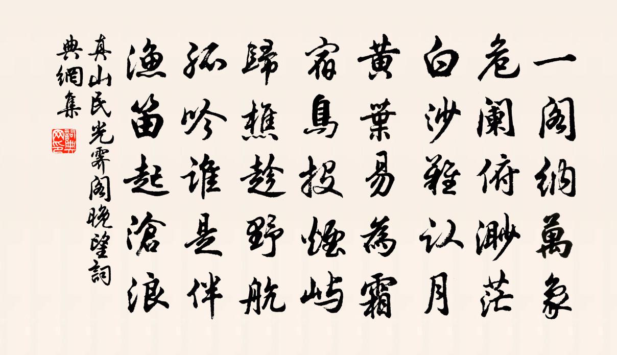 詩詞名句歷史字典書法欣賞書法字典國語詞典說文解字康熙字典古漢語字典標 題 作 者 詩 句 光霽閣晚望作者:真山民 朝代:宋代光霽閣晚望原文一閣納萬象,危闌俯渺茫。白沙難認月,黃葉易為霜。宿鳥投煙嶼,歸樵趁野航。孤吟誰是伴,漁笛起滄浪。詩詞問答問:光霽閣晚望的作者是誰?答:真山民問:光霽閣晚望寫於哪個朝代?答:宋代真山民光霽閣晚望書法欣賞光霽閣晚望書法作品詩詞推薦好事近(毫州秩滿歸江南別諸僚舊)曾肇〔宋代〕歲晚鳳山陰,看盡楚天冰雪。不待牡丹時候,又使人輕別。如今歸去老江南,扁舟載風月。不似畫梁雙燕,有重來雨中偶成陳峴〔宋代〕雨聲春不絕,綠漲與池平。久摘花猶好,新鋤草又生。閉門惟我獨,終日斷人行。對酒還憂病,裁詩強遣情。十月十五日同黃大博出城李流謙〔宋代〕休沐來尋九里松,故因晴日覺晴容。寒余淺水紅衣盡,淡抹輕煙紫翠重。倦向山僧談白葉,歸從逋客醉黃封。塵埃羅巨濟辟學之西序為軒以奉板輿之樂余名之曰朱翌〔宋代〕龜息六用藏,禽戲兩翼張。俯仰何自苦,要與宇宙長。深山具灶火,煮沙烹硫黃。此又此下策,中乾外徒強。我有動植姜特立〔宋代〕動植湊東風,天機各自濃。花粘蜂股重,絮戀柳腰慵。丙戌元日二首方回〔宋代〕歙山嚴瀨寄荊扉,想見同時雪正飛。柳動梅殘驚歲換,兒寒女瘦望予歸。百年偏許詩名在,雙鬢能知世事非。社友誠明吟邵雍〔宋代〕孔子生知非假習,孟軻先覺亦須脩。誠明本屬吾事,自是今人好外求。和程德裕頌五首黃庭堅〔宋代〕貧子還家作富兒,糞箕苕帚未曾遺。人人慾問草書意,懷素從來自不知。八詠詩 登台望秋月沈約〔南北朝〕望秋月。秋月光如練。照曜三爵台。徘徊九華殿。九華瑇瑁梁。華榱與璧璫。以茲雕麗色。持照明月光。凝華入黼今是行呈劉以道盛世忠〔宋代〕少年湖海誤加鞭,久戍歸歟暫息肩。時有故山來夢裡,更無愁緒到吟邊。晨餐全仰數畦菜,歲計尤逋二頃田。閒倚和居厚弟韻劉克莊〔宋代〕端嘉已羨谷鶯遷,不覺龍飛又幾年。坡老嘗稱少公勝,伯淳曾道二哥賢。騰箋內舉雖如此,秉筆中書豈必然。歲晚題孔道士雲庵趙庚夫〔宋代〕道人居玉笥,手辟小蓬萊。門寂山相對,庵空雲自來。茶煙朝宛轉,丹氣夜昭回。欲助梨花夢,攜鋤獨種梅。掃花游(和秋崖見壽。秋崖時謁選,留詞去)劉辰翁〔宋代〕春台路古,想店月潭雲,雞鳴關候。巾車爾久。記湘纍降日,留詞勸酒。不是行邊,待與持杯論斗。算吾壽。已待次韻師契詩中及賑貸事趙蕃〔宋代〕督賦停勾赤,開倉體詔黃。舊唯優附郭,近乃略諸鄉。天意終深恤,人謀豈盡長。要須梅雨歇,快放麥風涼。秋思寄子由黃庭堅〔宋代〕黃落山川知晚秋,小蟲催女獻功裘。老松閱世臥雲壑,挽著滄江無萬牛。河中望鳥灘作貽呂四郎中儲光羲〔唐代〕河流有深曲,舟子莫能知。弭棹臨沙嶼,微吟西日馳。平明春色霽,兩岸好風吹。去去川途盡,悠悠親友離。漢宮萍鄉病渴樂雷發〔宋代〕犬子無從典鷫鸘,荒村忍渴望瀟湘。楚王萍實甜如蜜,不許詩人取次嘗。宿靈泉無我軒懷次山蒲瀛〔宋代〕幽軒著無我,居此合何人。聞道東山隱,當時此地親。心源將止水,世事甚浮雲。今日當遺蹟,空餘淡墨春。方廣聖燈張栻〔宋代〕陰壑傳聞炯夜燈,幾人高合費追尋。山間光景只常事,堪笑塵寰萬種心。平沙雁落王之道〔宋代〕雨余湖水吞遙空,前山宿霧開溟濛。坐看雁陣落沙觜,欲下復起摩蒼穹。寒蘆飛花秋色老,亂撲客衣紛不掃。肅肅名句推薦丹陽城南秋海陰,丹陽城北楚雲深。王昌齡《芙蓉樓送辛漸二首》 滿園花菊鬱金黃,中有孤叢色似霜。白居易《重陽席上賦白菊》 自有多情處,明月掛南樓。米芾《水調歌頭·中秋》 傷心橋下春波綠,曾是驚鴻照影來。陸游《沈園二首》 人情已厭南中苦,鴻雁那從北地來。王勃《蜀中九日 / 九日登高》 聽其言,跡其行,察其所能而慎予官。墨子《墨子·09章 尚賢(中)》 亂離何處見,訊息苦難真。吳偉業《遇舊友》 月照城頭烏半飛,霜淒萬樹風入衣。李頎《琴歌》 盤飧市遠無兼味,樽酒家貧只舊醅。杜甫《客至》 不用思量今古,俯仰昔人非。蘇軾《八聲甘州·寄參寥子》