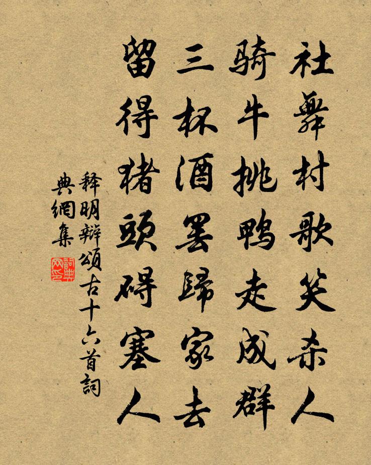 詩詞名句歷史字典書法欣賞書法字典國語詞典說文解字康熙字典古漢語字典標 題 作 者 詩 句 頌古十六首作者:釋明辯 朝代:宋代頌古十六首原文社舞村歌笑殺1/1人,騎牛挑鴨走成群。三杯酒罷歸家去,留得豬頭礙塞人。詩詞問答問:頌古十六首的作者是誰?答:釋明辯問:頌古十六首寫於哪個朝代?答:宋代釋明辯頌古十六首書法欣賞頌古十六首書法作品詩詞推薦別家杜牧〔唐代〕初歲嬌兒未識爺,別爺不拜手吒叉。拊頭一別三千里,何日迎門卻到家?道州城北樓觀李花呂溫〔唐代〕夜疑關山月,曉似沙場雪。曾使西域來,幽情望超越。將念浩無際,欲言忘所說。豈是花感人,自憐抱孤節。菩薩蠻佚名〔宋代〕金風簌簌驚黃葉。高樓影轉銀蟾匝。夢斷繡簾垂。月明烏鵲飛。新愁知幾許。欲似絲千縷。雁已不堪聞。砧聲何處楊日華宰錢塘楊億〔宋代〕洛社負才名,吾宗占寧馨。聞詩趨魯室,襲慶墜鱣庭。力學窺堂奧,孤飛徹杳冥。一枝攀綠桂,百里應華星。漢網和安成彭清老五首彭龜年〔宋代〕里中諸老皆公識,破戒相過問故人。顧我那能來重客,知公不薄少年新。讀方元善落花詩有感舒岳祥〔宋代〕為渠銷瘦為渠愁,減卻風流剩卻羞。得雨如投碧玉井,隨風似墮綠球樓。醫頰髓空無處覓,返魂香斷為誰留。此詩和武相公感韋令公舊池孔雀白居易〔唐代〕索莫少顏色,池邊無主禽。難收帶泥翅,易結著人心。頂毳落殘碧,尾花銷暗金。放歸飛不得,雲海故巢深。送別魏校書借參預李先生韻程公許〔宋代〕搔首暮雲碧,懷人酒淺斟。斟鍾心不動,九鼎力能任。夜雨青綾直,人風紫禁深。愛群須引煩,一念帝來臨。冬日放言二十一首張耒〔宋代〕靈通古叢林,他日休吾車。出門循古城,荒圃畦寒蔬。手種堂下花,頗已數尺余。何人攬其華,故人應念予。月色張鎡〔宋代〕月色夜逾淨,虛庭當我前。風裳幾白玉,何煩佩褊褼。曼倩去已久,誰同醉陶然。空懷依隱心,三叫芙蕖邊。次韻謝余知郡和予識山會飲韻方回〔宋代〕衣冠奇古舊儒風,湖海襟期臭味同。七字不妨容我和,一樽酒欠與君中。春光是處饒生意,山色何曾礙太穿。九疊望仰山憶玄泰上人李鹹用〔唐代〕晴嵐凝片碧,知在此中禪。見面定何日,無書已一年。高秋關靜夢,良夜入新篇。仰德心如是,清風不我傳。依韻和酬子直重陽送酒陳襄〔宋代〕君有雲泉酒,詩來寄我嘗。色過金菊淡,味帶木蘭香。北固山城秀,東園水榭涼。無因陪落帽,孤酌負重陽。過千頃寺訪谷隱老胡仲參〔宋代〕別久交情淡,重來似舊時。人生雲聚散,世事月盈虧。茶具權行酒,禪床借看詩。漫天多雪意,預約探梅期。次韻徐庭珍春日雜言十首陳棣〔宋代〕卉木爭供眾妙薰,春工試手為裁成。紛紛落蕊鶯邊雨,寂寂遊絲燕外晴。戲贈彥深黃庭堅〔宋代〕李髯家徒立四壁,未嘗一飯能留客。春寒茅屋交相風,倚牆捫虱讀熊策。老妻甘貧能養姑,寧剪髻鬟不典熊。大兒縱游淮南張祜〔唐代〕十里長街市井連,月明橋上看神仙。人生只合揚州死,禪智山光好墓田。和楊節推見贈蘇洵〔宋代〕與君多乖睽,邂逅同泛峽。宋子雖世舊,談笑頃不接。二君皆宦遊,疇昔共科甲。唯我老且閒,獨得離圈柙。少年桂州西山登高上陸大夫戎昱〔唐代〕登高上山上,高處更堪愁。野菊他鄉酒,蘆花滿眼秋。風煙連楚郡,兄弟客荊州。早晚朝天去,親隨定遠侯。蝶戀花秦觀〔宋代〕今歲元宵明月好。想見家山,車馬應填道。路遠夢魂飛不到。清光千里空相照。花滿紅樓珠箔繞。當日風流,更許名句推薦一聲畫角譙門,豐庭新月黃昏,雪裡山前水濱。白樸《天淨沙·冬》 湖上春來似畫圖,亂峰圍繞水平鋪。白居易《春題湖上》 四百年來成一夢,堪愁。王安石《南鄉子·自古帝王州》 羅襟濕未乾,又是淒涼雪。張淑芳《滿路花·冬》 秋鬢含霜白,衰顏倚酒紅。尹式《別宋常侍》 子規啼,不如歸,道是春歸人未歸。關漢卿《大德歌·春》 千淘萬漉雖辛苦,吹盡狂沙始到金。劉禹錫《浪淘沙九首》 不責人小過,不發人陰私,不念人舊惡洪應明《菜根譚·概論》 物格而後知至,知至而後意誠,意誠而後心正,心正而後身修,身修而後家齊,家齊而後國治,國治而後天下平。曾子《禮記·大學》 世事浮云何足問,不如高臥且加餐。王維《酌酒與裴迪》