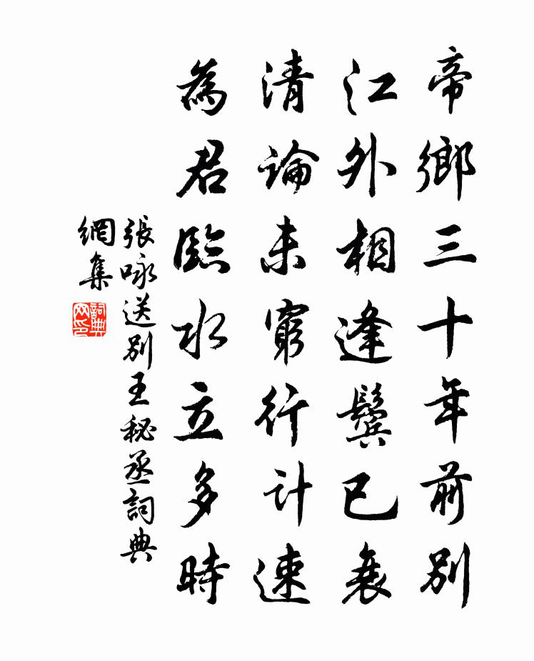詩詞名句歷史字典書法欣賞書法字典國語詞典說文解字康熙字典古漢語字典標 題 作 者 詩 句 送別王秘丞作者:張詠 朝代:宋代送別王秘丞原文帝鄉三十年前別,江外相逢鬢已衰。清論未窮行計速。為君臨水立多時。詩詞問答問:送別王秘丞的作者是誰?答:張詠問:送別王秘丞寫於哪個朝代?答:宋代張詠送別王秘丞書法欣賞送別王秘丞書法作品詩詞推薦岩桂史繩祖〔宋代〕四出花中畢,三開格外芳。名高評月品,韻勝霸秋香。水調歌頭(席上為葉仲洽賦)辛棄疾〔宋代〕高馬勿捶面,千里事難量。長魚變化雲雨,無使寸鱗傷。一壑一丘吾事,一斗一石皆醉,風月幾千場。須作蝟毛磔壽楊讑父真德秀〔宋代〕迅雷地中藏,當此沍寒日。積陰排層空,初陽露微茁。而日天地心,於此見機括。良猶勢方升,猶木吐牙卉。培壅轉調二郎神(三和)劉克莊〔宋代〕一筇兩屨,導從比、在京差省。更不草白麻,不批黃敕,稍覺心清力省。幸有善和書堪讀,何必然藜芸省。且閣起孝閔帝覺徐鈞〔宋代〕生長朱門十五春,廢興無奈屬權臣。當時枉作開基主,翻被虛名誤卻身。司馬君實端明獨樂園蘇轍〔宋代〕子嗟丘中親藝麻,邵平東陵親種瓜。公今歸去事農圃,亦種洛陽千本花。修篁繞屋韻寒玉,平泉入畦紆臥蛇。錦屏南海幕和段先輩送韋侍御赴闕黃滔〔唐代〕樹色川光入暮秋,使車西發不勝愁。璧連標格驚分散,雪課篇章互唱酬。魏闕別當飛羽翼,燕 * 且占風流。滿園次前韻寄潤父黃庭堅〔宋代〕昏昏迷簿領,勿勿貴晷景。嘗盡身百憂,迄無田二頃。喜從吾宗游,九里河潤永。呼兒跪酒樽,戒婦饌湯餅。老夫山居閒思羅與之〔宋代〕雲散山月吐,星稀山月高。相羊負露底,望月誦離騷。雉子斑 ( 一作設辟邪伎鼓吹雉子斑曲辭 )李白〔唐代〕辟邪伎作鼓吹驚,雉子班之奏曲成,喔咿振迅欲飛鳴。扇錦翼,雄風生。雙雌同飲啄,趫悍誰能爭。乍向草中耿介游潘墺魏都冶墓庵舒岳祥〔宋代〕弄日微陰駕筍輿,柴桑五子共攜扶。雲門鐘鼓先朝賜,丞相門庭近日殊。綠樹兩行溪貫串,青巒百摺路縈紆。惟余長相思·其二李白〔唐代〕日 * 盡花含煙,月明欲素愁不眠。趙瑟初停鳳凰柱,蜀琴欲奏鴛鴦弦。此曲有意無人傳,願隨春風寄燕然。憶君句戚明瑞〔宋代〕舊夢不堪游螘國,生涯只合在漁舟。雨夜陸游〔宋代〕歲晚茆茨劣自容,齒搖將脫髮將童。心游萬里關河外,身臥一窗風雨中。醫不可招惟忍病,書猶能讀足忘窮。夜闌時人為劉畢語佚名〔唐代〕劉郎中松樹孤標,畢庶子松根絕妙。老農十首曾協〔宋代〕飽食豐年酒不空,水村山崦老於農。囷倉在眼心無事,鄰里經過樂歲窮。次韻元肅兄見喜知荊州二首鄭獬〔宋代〕西風原上鶺鴒鳴,喜見朱旗畫獸獰。塵袖漸拋秦地遠,雲帆聊作楚江行。人家掩映寒塘水,秋物鮮明綠樹橙。欲表秋晚登古城李百藥〔唐代〕日落征途遠,悵然臨古城。頹墉寒雀集,荒堞晚烏驚。蕭森灌木上,迢遞孤煙生。霞景煥余照,露氣澄晚清。秋風寄田郎姜夔〔宋代〕楚楚田郎亦大奇,少年風味我曾知。春城寒食誰相伴,夜月犁花有所思。剪燭屢呼金鑒落,倚窗閒品玉參差。含情途中作杜牧〔唐代〕綠樹南陽道,千峰勢遠隨。碧溪風澹態,芳樹雨余姿。野渡雲初暖,征人袖半垂。殘花不一醉,行樂是何時?名句推薦欲知方寸,共有幾許清愁,芭蕉不展丁香結。賀鑄《石州引·薄雨初寒》 有天命者任自為之,不汝禁也。脫脫《宋史·本紀·卷三》 天與三台座,人當萬里城。張九齡《奉和聖制送尚書燕國公赴朔方》 欲把相思說似誰,淺情人不知。晏幾道《長相思·長相思》 萋萋芳草憶王孫。柳外樓高空斷魂。李重元《憶王孫·春詞》 上之為政,得下之情則治,不得下之情則亂。墨子《墨子·13章 尚同(下)》 漢家君臣歡宴終,高議雲台論戰功。王維《少年行四首》 下馬飲君酒,問君何所之?王維《送別》 暮從碧山下,山月隨人歸。李白《下終南山過斛斯山人宿置酒》 黃蘆岸白蘋渡口,綠柳堤紅蓼灘頭白樸《沉醉東風·漁夫》