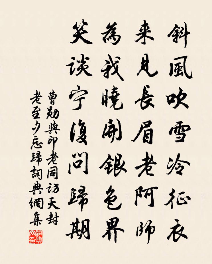 詩詞名句歷史字典書法欣賞書法字典國語詞典說文解字康熙字典古漢語字典標 題 作 者 詩 句 與印老同訪天封老至夕忘歸作者:曹勛 朝代:宋代與印老同訪天封老至夕忘歸原文斜風吹雪冷征衣,來見長眉老阿師。為我曉開銀色1~1界,笑談寧復問歸期。詩詞問答問:與印老同訪天封老至夕忘歸的作者是誰?答:曹勛問:與印老同訪天封老至夕忘歸寫於哪個朝代?答:宋代曹勛與印老同訪天封老至夕忘歸書法欣賞與印老同訪天封老至夕忘歸書法作品詩詞推薦寄題喻叔奇國傅郎中園亭二十六詠橫枝楊萬里〔宋代〕冰為仙骨水為肌,意淡香幽秪自知。青女素娥非耐冷,一生耐冷是橫枝。瑞鶴仙·梅陸叡〔宋代〕濕雲粘雁影。望征路愁迷,離緒難整。千金買光景。但疏鍾催曉,亂鴉啼暝。花悰暗省。許多情、相逢夢境。便行浣溪沙沈與求〔宋代〕花信催春入帝關。玉霙爭臘去留間。不禁風力又吹殘。客舍不眠清夜冷,縈愁一縷裊旃檀。空庭月落斗欄乾。又次韻二首廖行之〔宋代〕年來那復不時須,斗酒珍藏敢罪孥。安我饋漿窮逆旅,有誰攜榼訪幽居。粗粱何擇皆庚癸,題品寧當辨酪酥。自笑游石門澗白居易〔唐代〕石門無舊徑,披榛訪遺蹟。時逢山水秋,清輝如古昔。常聞慧遠輩,題詩此岩壁。雲覆莓苔封,蒼然無處覓。蕭疏游灞陵山嚴維〔唐代〕入山未盡意,勝跡聊獨尋。方士去在昔,藥堂留至今。四隅白雲閒,一路清溪深。芳秀愜春目,高閒宜遠心。潭分次韻呂之壽見憶丘葵〔宋代〕日暮客送客,此情悲復悲。棲棲吾老矣,寂寂子何之。跬步便相憶,論心未有期。江湖成底事,空使素衣緇。平江顏侍郎輓詩周必大〔宋代〕吳門自古俊髦多,中外推公政事科。議禮不妨豐酒課,治繁猶暇講禪那。榻前屢記宣除目,川上遙憐逐逝波。底用戲作絕句以唐人句終之陸游〔宋代〕雨細穿梅塢,風和上柳橋。山居無曆日,今日是何朝?效孔文舉贈柳聖功三首黃庭堅〔宋代〕妙言玉質金相,學問日月悠長。良賈故要深藏,屈體下心堂堂,灰頭土面輝光。送友人宰湘陰李端〔唐代〕從宦舟行遠,浮湘又入閩。蒹葭無朔雁,檉栝有蠻神。傳吏閒調象,山精暗訟人。唯須千樹橘,暫救李衡貧。煙波亭避暑周弼〔宋代〕澄江橫匹練,月洗黃羅扇。捲盡白雲衣,常星撒沙見。天低欲就人,夜色凝深澱。欻吸動微光,時絣斗間線。涼亭歲晏無聊收叔氏訊吳潛〔宋代〕豢成凋郡力難任,雪上加霜兩鬢侵。四五更頭猿鶴夢,數千里外鶺鴒心。老來倍覺光陰促,休去方知意味深。陶白衡陽道間李曾伯〔宋代〕滿林松竹翠交加,路過衡陽得幾家。門傍粉牆人寂寂,一陂春水數株花。登東陽沈隱侯八詠樓崔融〔唐代〕旦登西北樓,樓峻石墉厚。宛生長定□,俯壓三江口。排階銜鳥衡,交疏過牛斗。左右會稽鎮,出入具區藪。越岩郭從范示及張安國諸公酬唱輒次嚴韻張元乾〔宋代〕登樓乘暇日,喚客共澆愁。春去花猶發。陰濃雨未休。和詩真冷澹,得句總風流。能遣西鄰老,殊無陋巷憂。感寓四首戴復古〔宋代〕夜雨挾西風,摵摵撼庭樹。浮生堪幾秋,青鬢忽已素。鉛刀刲九牛,策蹇望長路。所操莽無奇,自好徒自誤。改弦題汪伯時家藏顏魯公書裴將軍帖袁說友〔宋代〕詩成一見英雄手,筆落能令風雨驚。萬古言言有餘烈,從今詞翰豈虛名。買蘭方岳〔宋代〕幾人曾識離騷面,說與蘭花枉自開。卻是樵夫生鼻孔,擔頭帶得入城來。題峴山圖戴表元〔宋代〕山頭種石懸蒼雲,山下急流風卷紋。何年荒碑當嶺立,龜趺圭首猶鱗皴。神龍驅毫鬼輸墨,羊公精神荊楚色。想當名句推薦燕子飛來窺畫棟,玉鉤垂下簾旌。歐陽修《臨江仙·柳外輕雷池上雨》 吃一分虧,受無量福。馮夢龍《警世通言·卷三》 田家占氣候,共說此年豐。孟浩然《田家元日》 莫買沃洲山,時人已知處。劉長卿《送方外上人/送上人》 事諸父,如事父。事諸兄,如事兄。李毓秀《弟子規·出則弟》 孝悌有聞,人倫之本,德行敦厚,立身之基。魏徵《隋書·帝紀·卷三》 治亂之藥石,刑罰為重;興平之梁肉,德教為先。程登吉《幼學瓊林·卷四·訟獄》 渭城朝雨浥輕塵,客舍青青柳色新。王維《渭城曲 / 送元二使安西》 清風明月苦相思,盪子從戎十載餘。王維《伊州歌》 過雨西風,數葉井梧愁舞。吳文英《荔枝香近·七夕》