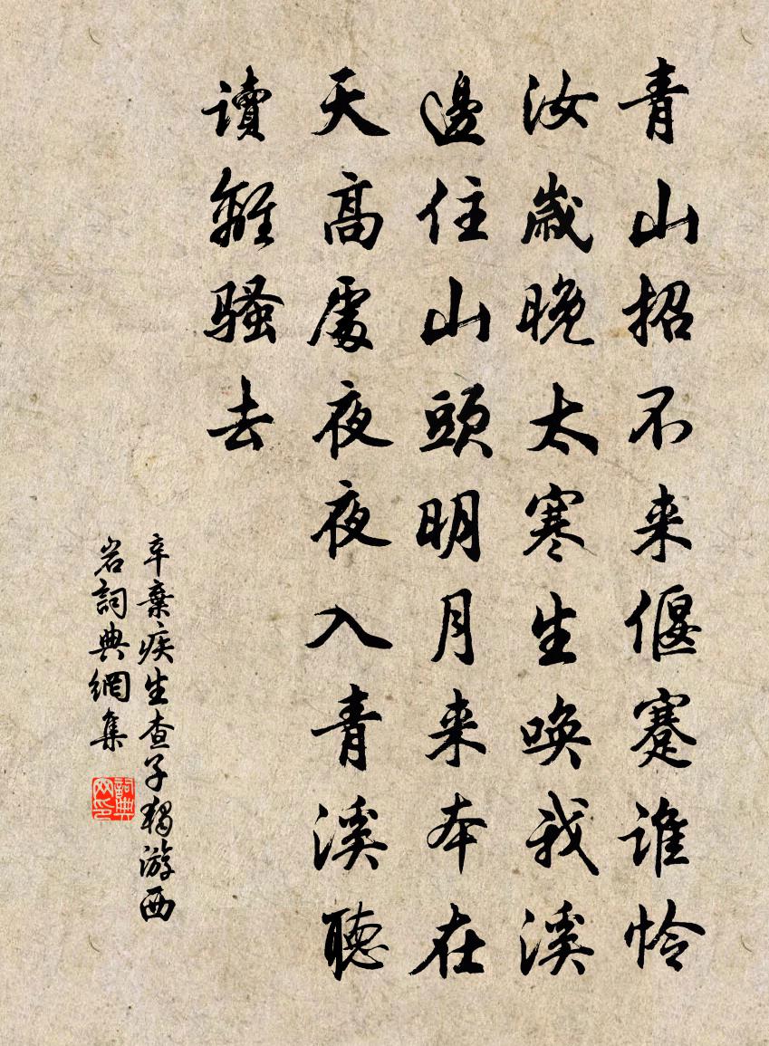 上片借山來自寫,又能將山品與人品相融。首句落筆就奇,接句含蓄曲折。“偃蹇”一詞用來形容西岩的狀貌很恰當,也可以引申為詞人的驕傲和傲慢。一筆兩意,巧妙之極。而以“誰憐汝”這一問,更寫出詞人的自憐憐山,自傷傷山。此處的山與人,已在感情上合二為一。“歲晚”一句,也是既寫山,又寫人。如是寫山,指山逢寒冬;如是寫人,則指人的老大。這樣雙綰之後,“太寒生”就成了詞人的心理自感,和對於山的移情了。既然山被詞人賦予了這樣充分的靈性甚至可說是人性,那么,上片末句衝出青山“喚我溪邊住”的語句,就不再突兀麗矯情。兩位歲寒之友因品格相似而思謀相伴,簡直再合情理不過。