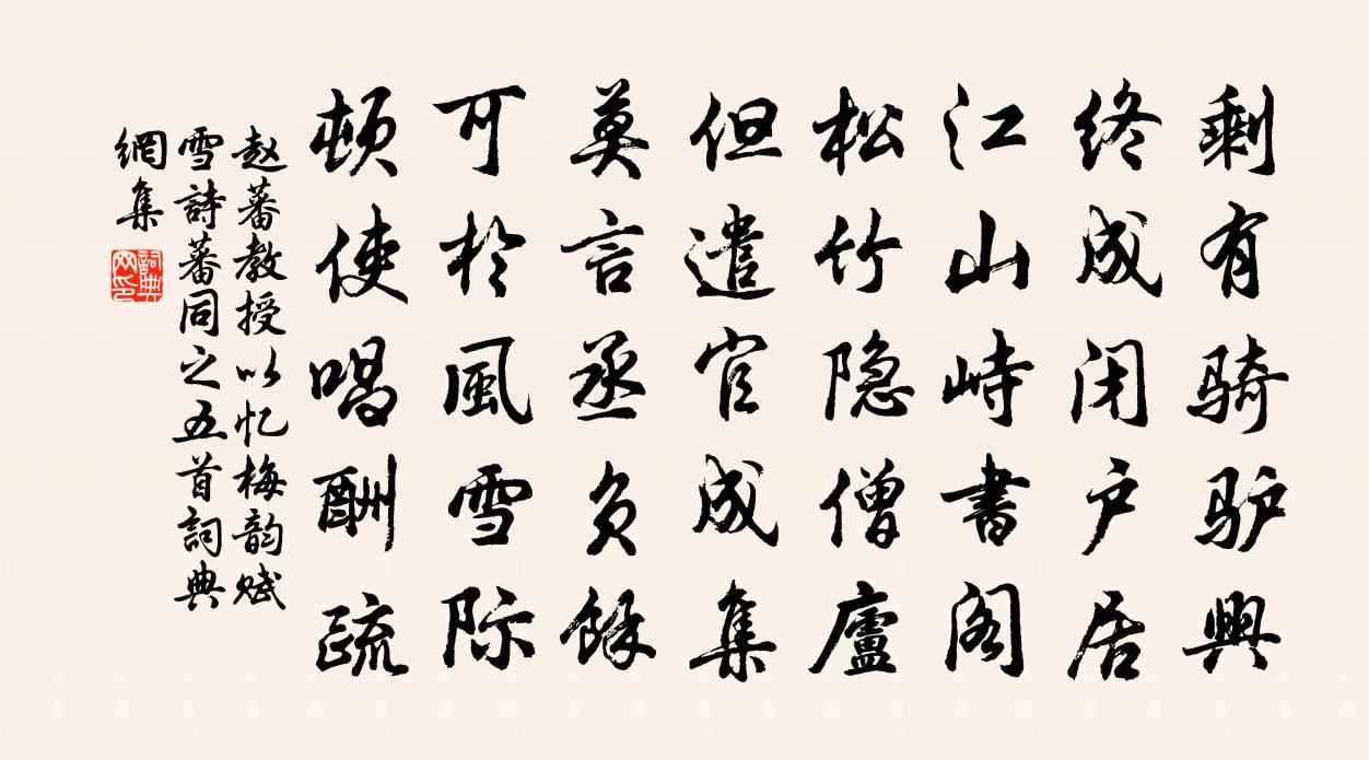 詩詞名句歷史字典書法欣賞書法字典國語詞典說文解字康熙字典古漢語字典標 題 作 者 詩 句 教授以憶梅韻賦雪詩蕃同之五首作者:趙蕃 朝代:宋代原文剩有騎驢興,終成閉戶居。江山峙書閣,松竹隱僧廬。但遣官成集,莫言丞負余。可於風雪際,頓使唱酬疏。詩詞問答問:《教授以憶梅韻賦雪詩蕃同之五首》的作者是誰?答:趙蕃問:該詩寫於哪個朝代?答:宋代書法欣賞教授以憶梅韻賦雪詩蕃同之五首書法作品詩詞推薦何秀才郊園五首司馬光〔宋代〕蒼蒼竹林暝,鬱郁鬆氣寒。縱橫興來筆,欹側醉中冠。再用韻鄧深〔宋代〕葛巾藜杖款重關,不獨風流識謝安。蘭玉滿庭驚醉眼,雲煙落紙照衰顏。也知鴻雁行應起,莫管鳧鷗盟漸寒。自笑吊石曼卿梅堯臣〔宋代〕前時京師來,對馬嘗相揖。埃塵正滿衢,笑語曾未及。雖然恨莫親,往往聞風什。星斗交垂光,昭昭不可挹。獨喔送何水部蒙出牧袁州戚維〔宋代〕又領親民任,星車別紫微。隼旟新命重,鶴髮故人稀。雲樹看如畫,風帆去似飛。鄉中諸父老,榮羨錦衣歸。過北邙山劉滄〔唐代〕散漫黃埃滿北原,折碑橫路碾苔痕。空山夜月來松影,荒冢春風變木根。漠漠兔絲羅古廟,翩翩丹旐過孤村。白楊霜葉飛方千里〔宋代〕塞雲垂地,堤煙重,燕鴻初度江表。露荷風柳向人疏,台榭還清悄。恨脈脈、離情怨曉。相思魂夢銀屏小。奈倦客【中呂】普天樂_西湖即事蕊張可久〔元代〕西湖即事蕊珠宮,蓬萊洞,青松影里,紅藕香中。千機雲錦重,一片銀河凍。縹緲佳人雙飛鳳,紫簫寒月滿長空。和流螢趙希逢〔宋代〕林塘腐草化為螢,星散飛來暗復明。拾向書窗輝眼目,當將檠火對南城。和傅山父喜雨韻二首李曾伯〔宋代〕驕陽赫赫正當空,化作甘霖覆手中。洗滌四郊無點翳,作興群槁有新功。惟方寸地能精格,信咫尺天隨感通。毋以松下縱筆陸游〔宋代〕髯龍夭矯欲飛去,百尺蒼藤羅絡之。應笑此翁才不進,故將老氣起吾詩。淋疾,復作醫,雲忌文字勞心,曉起自警楊萬里〔宋代〕半似枯禪半似痴,也無何慮與何思。偶看清曉雙雙蝶,飛遍黃花一一枝。荒耽詩句枉勞心,懺悔鶯花罷苦吟。也不黃田人家別墅繚山種海棠為賦二絕劉克莊〔宋代〕萬紅扶路笑相迎,彷佛前身石曼卿。若向花中論富貴,芙蓉城劣海棠城。又用胡尉韻方岳〔宋代〕便覺尋春負一籌,老懷無復少年游。茶桑天似鵝黃酒,楊柳花飛狐白裘。試問獨醒觀眾醉,何如一笑失千憂。不知綠槐陰唐士恥〔宋代〕槐陰似尼父,軼軌追前蹤。絕塵非學步,所產夐無雙。今此于越東,鍾孕亦鴻龐。朅來於越西,掌教開群迷。群迷偈頌四首釋鹹傑〔宋代〕山河大地不是幻,日月星辰不是幻。明暗色空不是幻,四聖六凡不是幻。山僧說底不是幻,諸人聽底不是幻。秋蕊香(生日)史浩〔宋代〕玉露ED68ED68,秋色似畫,東堂宴席初開。紅萸泛壽斝,紫菊上妝檯。倚欄見、新雁已南來。落霞孤鶩徘今日何夕曾豐〔宋代〕今夕何夕,袢暑其蒸。於後之旦,維槿始榮。有綽其聲,我後中興。我公協成,有功有能。我後顯旌,不伐不矜。句張釜〔宋代〕鳥度水中天。和東川王相公新漲驛池八韻劉禹錫〔唐代〕今日池塘上,初移造物權。苞蔵成別島,沿濁致清漣。變化生言下,蓬瀛落眼前。泛觴驚翠羽,開幕對紅蓮。遠寫喜遷鶯(塞上詞)李綱〔宋代〕邊城寒早。對漠漠暮秋,霜風菸草。戰□長閒,刁斗無聲,空使荷戈人老。隴頭立馬極目,萬里長城古道。感懷處名句推薦陰晴圓缺都休說,且喜人間好時節。徐有貞《中秋月·中秋月》 北風利如劍,布絮不蔽身。白居易《村居苦寒》 子路,人告之以有過則喜。禹聞善言則拜。孟子《孟子·公孫丑章句上·第八節》 山光忽西落,池月漸東上。孟浩然《夏日南亭懷辛大》 芳草句,碧雲辭,低徊閒自思。佟世南《阮郎歸·杏花疏雨灑香堤》 竹喧歸浣女,蓮動下漁舟。王維《山居秋暝》 關山四面絕,故鄉幾千里。劉昶《斷句》 全則必缺,極則必反,盈則必虧。呂不韋《呂氏春秋·論·不苟論》 只言啼鳥堪求侶,無那春風欲送行。高適《夜別韋司士》 藍橋何處覓雲英。只有多情流水、伴人行。蘇軾《南歌子·寓意》