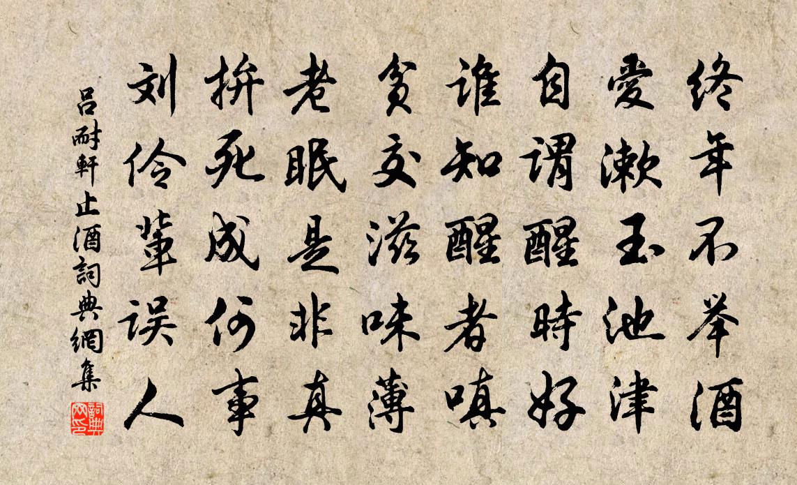 詩詞名句歷史字典書法欣賞書法字典國語詞典說文解字康熙字典古漢語字典標 題 作 者 詩 句 止酒作者:呂耐軒 朝代:宋代止酒原文終年不舉酒,愛漱玉池津。自謂醒時好,誰知醒者嗔。貧交滋味薄,老眠是非真。拚死成何事,劉伶輩誤人。詩詞問答問:止酒的作者是誰?答:呂耐軒問:止酒寫於哪個朝代?答:宋代呂耐軒止酒書法欣賞止酒書法作品詩詞推薦夢過城東謁洛陽尉楊應之邵雍〔宋代〕夜來清夢過城東,溪水分流徑路通。全似乘查上天漢,但無嚴子驗行蹤。滿江紅 贈吳又玄,吳又玄得其伯父子云太博胡炳文〔元代〕貴賤,累多奇中,作此贈之一畫先天,誰知得、已涵玄九。這易玄機括,子云傳授。杜宇一聲春欲曉,牡丹幾朵花挽木奉議陳傅良〔宋代〕寵數頻年及,俞音萬口傳。豐碑來少梅,大軸落台躔。教子宜如此,聞風亦凜然。送車今塞道,拱木看參天。菩薩蠻(十之七)鄧肅〔宋代〕腰肢欲趁楊花去。歌聲能遏行雲住。杯酒醉東風。羈愁一洗空。謫仙清飲露。意在飛瓊侶。未醉即求歸。新詞句欲奉和聖制送李尚書入蜀張九齡〔唐代〕眷言感忠義,何有間山川。徇節今如此,離情空復然。皇心在勤恤,德澤委昭宣。周月成功後,明年或勞還。藍溪期蕭道士採藥不至盧綸〔唐代〕春風生百藥,幾處術苗香。人遠花空落,溪深日復長。病多知藥性,老近憶仙方。清節何由見,三山桂自芳。柳枝詞十首徐鉉〔唐代〕凝碧池頭蘸翠漣,鳳皇樓畔簇晴煙。新詞欲詠知難詠,說與雙成入管弦。次韻王適東軒即事三首蘇轍〔宋代〕北園春草徑微微,未用頻教剪棘茨。蜂陣紛紛初養蜜,鶯巢淺淺欲生兒。客情流水兼山遠,歸夢遊絲向日遲。懶病蔬食陸游〔宋代〕牆陰春薺老,筍蕨正登盤。野饁元無婦,村醅不屬官。何由取熊掌?倖免買豬肝。猶勝煩秦相,綈袍閔一寒。和通齋密窩韻二首王柏〔宋代〕密密窩中克己私,人心才動最惟危。誠身有道須明善,暗室之中莫自欺。凜凜知風知顯處,兢兢不睹不聞時。聖師題柳溫庭筠〔唐代〕楊柳千條拂面絲,綠煙金穗不勝吹。香隨靜婉歌塵起,影伴嬌嬈舞袖垂。羌管一聲何處曲,流鶯百囀最高枝。千門丞相大資葉公輓詞喻良能〔宋代〕德望堂堂重,威名凜凜寒。三年袞衣粲,四海寸心丹。綠野悲裴度,蒼生憶謝安。白頭賓客在,慚痛淚闌乾。寄題程元成紛事山居三詠攬有亭楊萬里〔宋代〕葵心一岫卓南涯,秀野諸峰走北來。中起新亭雙奄有,盡驅景物四邊回。木居士作煨塵嘆,孤竹君真梁棟材。知有夏日雜題陸游〔宋代〕身閒欲出無如嬾,酒薄雖傾不敵愁。殘暑從今無一月,剩儲詩思待新秋。經費征君舊居齊己〔唐代〕高眠當新地,雲鳥未為孤。天子征不起,閒人親得無。猿猱狂欲墜,水石怪難圖。寂寞荒齋外,松杉相倚枯。客枕不寐二首陳造〔宋代〕嗢喔鄰雞幾番鳴,琤撞江浪欲無聲。擁衾寧復還家夢,望殺東窗未肯明。感皇恩 送子國中丞赴燕,時予在真定憲司座王惲〔元代〕燈火夜闌珊,故人相對。忘盡南窗引書睡。情談**,時帶少年風味。門前霜月炯、停吟*。湖海相望,金蘭交契探春令(早春)趙長卿〔宋代〕笙歌間錯華筵啟。喜新春新歲。菜傳縴手青絲細。和氣入、東風裡。幡兒勝兒都姑媂。戴得更忔戲。願新春已後,次韻叔父台源歌黃庭堅〔宋代〕吾家叔度天與閒,晚喜著書如漆園。台平舊基水發源,但聞淙淙下林巒。一朝斬木見萬象,吞若雲夢胸中寬。漱滌瑞鷓鴣王哲〔元代〕我咱別有赤窮窮。物物俱無事事通。清里清來全寂闃,閒中閒至住虛空。能邀*照堪親日,會捉輕飈便害風。此際名句推薦水光瀲灩晴方好,山色空濛雨亦奇。蘇軾《飲湖上初晴後雨二首·其二》 宿草春風又,新阡去歲無。楊萬里《寒食上冢》 立身之道何窮,只得一敬字,便事事皆整。王永彬《圍爐夜話·第一六三則》 一片閒愁,想丹青難貌柳永《尾犯·夜雨滴空階》 東風吹雨過青山,卻望千門草色閒。盧綸《長安春望》 採桑秦氏女,織錦竇家妻。薛道衡《昔昔鹽》 未知生,焉知死?孔子弟子《論語·先進篇》 美人如花隔雲端。李白《長相思三首》 兩岸月橋花半吐。紅透肌香,暗把遊人誤。真德秀《蝶戀花·兩岸月橋花半吐》 人間夢隔西風,算天上、年華一瞬。吳文英《惜秋華·七夕》