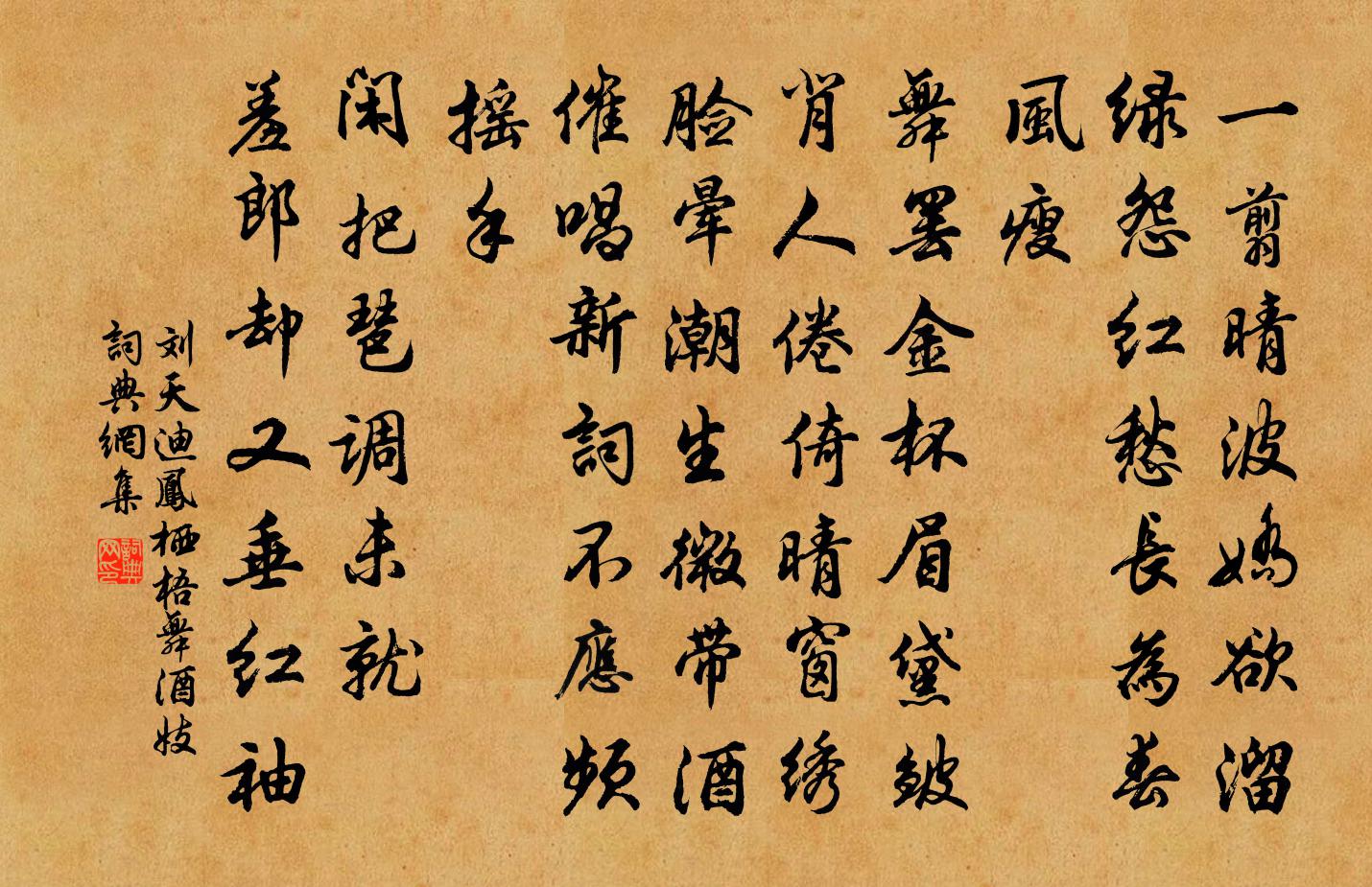 詩詞名句歷史字典書法欣賞書法字典國語詞典說文解字康熙字典古漢語字典標 題 作 者 詩 句 鳳棲梧(舞酒妓)作者:劉天迪 朝代:宋代鳳棲梧(舞酒妓)原文一翦晴波嬌欲溜。綠怨紅愁,長為春風瘦。舞罷金杯眉黛皺。背人倦倚晴窗繡。臉暈潮生微帶酒。催唱新詞,不應頻搖手。閒把琶調未就。羞郎卻又垂紅袖。詩詞問答問:鳳棲梧(舞酒妓)的作者是誰?答:劉天迪問:鳳棲梧(舞酒妓)寫於哪個朝代?答:宋代問:鳳棲梧(舞酒妓)是什麼體裁?答:詞劉天迪鳳棲梧(舞酒妓)書法欣賞鳳棲梧(舞酒妓)書法作品詩詞推薦國小識愧陳著〔宋代〕工夫靠里方為學,時習奚分幼壯年。何幸席閒提掇緊,最明新處是陳篇。宿巫山下李白〔唐代〕昨夜巫山下,猿聲夢裡長。桃花飛綠水,三月下瞿塘。雨色風吹去,南行拂楚王。高丘懷宋玉,訪古一沾裳。尋天目徐君皎然〔唐代〕常見仙翁變姓名,豈知松子號初平。逢人不道往來處,賣藥還將雞犬行。獨鶴天邊俱得性,浮雲世上共無情。三花天爵山張舜民〔宋代〕耕者志於食,否則餒繼之。學者志於道,一為好爵縻。本自不營利,間或與利期。朝日入而處,暮日仰而思。浮雲寓嘆陸游〔宋代〕孤生拙料事,諸老誤知人。世故幾翻覆,此身常賤貧。有書藏禹穴,無地靜胡塵。衰病今年劇,呻吟欲過旬。澹軒李處權〔宋代〕野鶴元同性,晴山正滿門。那知有城市,初不異丘樊。水靜嫌風撓,花開畏蝶喧。應當如是觀,客至亦忘言。臨江仙·暮春趙長卿〔宋代〕過盡征鴻來盡燕,故園訊息茫然。一春憔悴有誰憐。懷家寒食夜,中酒落花天。見說江頭春浪渺,殷勤欲送歸船。偈頌七十六首釋師觀〔宋代〕問訊燒香,閒行靜坐。與麽分明,是個什麽。念奴嬌(約友中秋遊長橋,魏倅·邦式不預,作念奴嬌)朱敦儒〔宋代〕素秋天氣,是登山臨水,昔人悲處。我遇清時無個事,好約鶯遷鴻翥。旋整蘭舟,多攜芳醞,笑里輕帆舉。松江纜句張釜〔宋代〕得句不妨時策勛。晚泊長沙示秦處度范元實用寄明略和父韻五首黃庭堅〔宋代〕秦郎水江漢,范郎器鼎鼐。逝者不可尋,猶喜二子在。相逢唾珠玉,貧病問薪菜。豫愁帆風船,目極別所愛。燭影搖紅孫惟信〔宋代〕一朵鞓紅,寶釵壓髻東風溜。年時也是牡丹時,相見花邊酒。初試夾紗半袖。與花枝、盈盈斗秀。對花臨景,為景仲秋過盧北山子俞嘗新醞作陳藻〔宋代〕白秫新收釀得紅,洗鍋吹火煮油蔥。莫嫌傾出清和濁,勝是嘗來辣且濃。宿龜石寺舒岳祥〔宋代〕出深無橫吏,客至氣和平。野寺鳴鐘罷,安眠到五更。昭潭十愛梅摯〔宋代〕我愛昭州路,優遊不險崎。九疑通舜野,八桂繞秦祠。亭堠相望處,漁樵有讓時。政無牙虎鬥,莫信義山詩。偈頌一百零二首釋慧遠〔宋代〕今朝九月初一,敗葉凋零滿室。缽盂高掛懸崖,拄杖依前靠壁。幾許溪山風月,且無遮個訊息。諸祖不解提擲,久南園雜詠清風亭陳宓〔宋代〕薰爐驅俗氛,茗碗破塵慮。披襟六月涼,乘此欲歸去。好事近 春寒繼劉君卿韻三首王惲〔元代〕斗柄轉春城,向暖小桃開徹。不似今年正月,過深冬時節。故將新巧發陰機,春事未容說。且就驅雲風帚,埽西山小園何應龍〔宋代〕地占方方十丈寬,已栽花木四時看。客來莫笑生涯薄,窗外新添竹數竿。句王隨〔宋代〕地僻無來客,庭閒自落花。名句推薦而今識盡愁滋味,欲說還休。辛棄疾《醜奴兒·書博山道中壁》 不似天涯,捲起楊花似雪花。蘇軾《減字木蘭花·立春》 坐愁群芳歇,白露凋華滋。李白《秋思》 夜長爭得薄情知,春初早被相思染。姜夔《踏莎行·自沔東來》 贈君明月滿前溪,直到西湖畔。毛滂《燭影搖紅·送會宗》 春風一夜吹鄉夢,又逐春風到洛城。武元衡《春興》 有福傷財,無福傷己。佚名《增廣賢文·上集》 老來多健忘,唯不忘相思。白居易《偶作寄朗之》 河水洋洋,北流活活詩經《碩人》 佇倚危樓風細細。望極春愁,黯黯生天際。柳永《蝶戀花·佇倚危樓風細細》