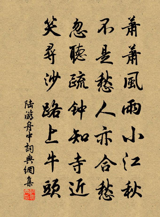 詩詞名句歷史字典書法欣賞書法字典國語詞典說文解字康熙字典古漢語字典標 題 作 者 詩 句 舟中作者:陸游 朝代:宋代舟中原文蕭蕭風雨小江秋,不是愁人亦合愁。忽聽疏鍾知寺近,笑尋沙路上牛頭。詩詞問答問:舟中的作者是誰?答:陸游問:舟中寫於哪個朝代?答:宋代問:陸游的名句有哪些?答:陸游名句大全陸游舟中書法欣賞舟中書法作品詩詞推薦挽白雲趙宗丞釋斯植〔宋代〕天上樓成日,人間獨喪君。料知生死事,還與去來分。夜月江村路,春風嶺樹雲。交余多感概,那忍見遺文。贈沈錄事江水曹二大使詩沈約〔南北朝〕帝格文祖。握瑞持衡。慶踰高邑。兆屬大橫。王道無外。幹路昭亨。近臣展事。上介倅行。【雙調】青玉案佚名〔元代〕插宮花飲御酒同歡樂,功勞薄上寫上也么哥,萬載標名麒麟閣。封妻蔭子,進祿加官,想人生一世了。人日聚星堂燕集探韻得豐字歐陽修〔宋代〕污池以其下,眾流之所鍾。尺水無長瀾,蛟龍豈其容。顧予誠鄙薄,群俊枉高蹤。得一不為少,雖多肯辭豈。譬如行住坐臥三十二頌釋印肅〔宋代〕扁鵲盧醫速退邊,大家飽吃普庵圓。解冤釋結消諸病,感應無方不用錢。偈頌一百二十三首釋崇岳〔宋代〕年年此日潑惡水,個事從悉達多起。自雲遍界獨稱尊,後代兒孫誰管你。對雪憶往歲錢塘西湖訪林逋三首梅堯臣〔宋代〕旋燒枯栗衣猶濕,去愛峰前有徑開。日暮更寒歸欲懶,無端撩亂入船來。言懷別同志左偃〔唐代〕漸老將誰托,勞生每自慚。何當重攜手,風雨滿江南。季夏逢朝客於濆〔唐代〕滻水桃李熟,杜曲芙蓉老。九天休沐歸,腰玉垂楊道。避路回綺羅,迎風嘶騕褭。豈知山谷中,日日吹瑤草。楓橋胡珵〔宋代〕朝辭海涌千人古,暮宿楓橋半夜鍾。明日館娃宮裡去,洞庭呼起一帆風。禪人寫師真請贊釋慧遠〔宋代〕斷滅佛種,破除家計。不是別人,楊岐五世。禪道耳邊風,佛法眼中翳。問渠將底為人,尚有隨身赤契。奉命南使經彭澤(值王明府不在,留此)徐鉉〔唐代〕遠使程途未一分,離心常要醉醺醺。那堪彭澤門前立, * 蕭疏不見君。詠身白居易〔唐代〕自中風來三歷閏,從懸軍後幾逢春。[病風八年,凡三閏矣。]周南留滯稱遺老,[見太史公傳。]漢上羸殘號半江陵寄翰林韓偓學士貫休〔唐代〕久住荊溪北,禪關掛綠蘿。風清閒客去,睡美落花多。萬事皆妨道,孤峰謾憶他。新詩舊知己,始為味如何。蝶戀花 河內王斡臣號竹溪宋褧〔元代〕門外紅塵溪上竹。竹似琅*,溪水清如玉。溪上主人情不俗。多應每每能無肉。千載高標成倏忽。六逸飄然,君為壽昌鄭生入天目山禮僧方回〔宋代〕欲作空門補處人,如何頭上裹頭巾。曹溪一夜傳衣缽,元是當年行者身。金蕉葉袁去華〔宋代〕沈煙篆曲。可庭軒、翠梧蔭綠。掛晚景、寒林數幅。對冰盤瑩玉。印枕嬌紅透肉。眼偷垂、睡猶未足。試縴手、清野飯陸游〔宋代〕薏實炊明珠,苦筍饌白玉。輪囷斸區芋,芳辛采山蔌。山深少鹽酪,淡薄至味足。往往八十翁,登山逐奔鹿。可憐赴渭北宿石泉驛南望黃堆烽李益〔唐代〕邊城已在虜塵中,烽火南飛入漢宮。漢庭議事先黃老,麟閣何人定戰功。晝寢陸游〔宋代〕倦腕擎書忽墮前,心清無夢腹便便。丹成未要排雲去,且住人間作睡仙。名句推薦久在樊籠里,復得返自然。陶淵明《歸園田居·其一》 何處它年寄此生,山中江上總關情。虞集《院中獨坐》 手捻香箋憶小蓮。欲將遺恨倩誰傳。晏幾道《鷓鴣天·手捻香箋憶小蓮》 此身合是詩人未?細雨騎驢入劍門。陸游《劍門道中遇微雨》 心病終須心藥治,解鈴還是系鈴人。曹雪芹《紅樓夢·第九十回》 攀出牆朵朵花,折臨路枝枝柳。關漢卿《一枝花·不伏老》 音塵絕,西風殘照,漢家陵闕。李白《憶秦娥·簫聲咽》 江上月明胡雁過,淮南木落楚山多。劉長卿《江州重別薛六柳八二員外》 言必有主,行必有法,親人必有方。戴聖《大戴禮記·曾子立事第四十九》 精誠所加,金石為開。范曄《後漢書·列傳·光武十王列傳》