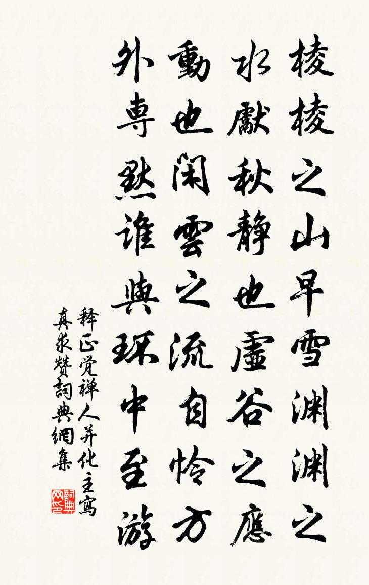 詩詞名句歷史字典書法欣賞書法字典國語詞典說文解字康熙字典古漢語字典標 題 作 者 詩 句 禪人並化主寫真求贊作者:釋正覺 朝代:宋代禪人並化主寫真求贊原文稜稜之山早雪,淵淵之水先秋。靜也虛谷之應,動也閒雲之流。自憐方外專默,誰與環中至游。詩詞問答問:禪人並化主寫真求贊的作者是誰?答:釋正覺問:禪人並化主寫真求贊寫於哪個朝代?答:宋代釋正覺禪人並化主寫真求贊書法欣賞禪人並化主寫真求贊書法作品詩詞推薦句廖融〔唐代〕圭灶先知曉,盆池別見天,古寺尋僧飯,寒岩衣鹿裘。雲穿搗藥屋,雪壓釣魚舟。鷓鴣天丘崈〔宋代〕陸海蓬壺自有山。光風霽月未應慳。但將歌舞酬佳節,卻信陰晴是等閒。花照夜,燭烘盤。明年公更酒腸寬。奉陪歲寒堂三題其三松風閣范仲淹〔宋代〕此閣宜登臨,上有松風吟。非弦亦非匏,自起簫韶音。明月萬里時,何必開綠琴。鳳皇下雲霓,鏘鏘鳴中林。淳如贈別詩庾信〔南北朝〕藏啼留送別。拭淚強相參。誰言畜衫袖。長代手中浛。和壽州宋待制九題其三白蓮堂梅堯臣〔宋代〕蟋蟀在秋堂,芙蕖出深水。浩露同一色,澄澈寒監里。佳人恥施朱,欲與天真比。沙鳥閒且都,誰將擬公子。山中之樂三章送徐明叟胡直內蘇德翁歸嚴瀨並方回〔宋代〕山中之樂兮樂可忘憂,草木春青兮黃為秋。雲出雲還兮人世晴雨,寒拾槲葉兮以襦以裘。顧獨影兮無愧意,行小倦自大散以往深林密竹磴道盤曲四五十里至黃牛王維〔唐代〕危徑幾萬轉。數里將三休。迴環見徒侶。隱映隔林丘。颯颯松上雨。潺潺石中流。靜言深溪里。長嘯高山頭。望見感皇恩 末後鄉人王懷玉樂府語也元好問〔金代〕夢寐見并州,今朝身到。未怕清汾照枯槁。百年狂興,盡與家山傾倒。黑頭誰辦得、歸來早。梁苑綠波,長安春草浣溪沙趙令畤〔宋代〕一朵夢雲驚曉鴉。數枝春雨帶梨花。坐來殘月冷窗紗。釵鳳謾曾留得半,枕山猶是枕時斜。對花今日奈天涯。題鹿苑寺壁間記魯簡肅公羅漢見夢事吳思齊〔宋代〕是法本平等,無怠亦無敬。如何證無生,卻來見參政。和陸子履再游城西李園歐陽修〔宋代〕京師花木類多奇,常恨春歸人不歸。車馬喧喧走塵土,園林處處鎖芳菲。殘紅已落香猶在,羇客多傷涕自揮。我亦醉聞杜宇仇遠〔宋代〕家家酒似池,日日醉如泥。海燕聊為客,杜鵑何苦啼。狂那知帽落,歸不為花迷。信筆成詩句,苔箋小草題。白雲答薩都剌〔元代〕使君抑何忙,寧不思故山。茫茫天壤間,鳥倦猶如還。石田紫芝老,茶灶碧蘚斑。胡不賦歸來,分子屋半間。【雙調】大德歌 一關漢卿〔元代〕粉牆低,景淒淒,正是那西廂月上時。會得琴中意,我是個香閨里鍾子期。好教人暗想張君瑞,敢則是愛月夜眠遲謝傅監倉陳宓〔宋代〕昔年常侍紫樞仙,風骨森然在眼前。一覽十行俱默誦,三更殘卷尚朱箋。詩書自古稱難繼,衣缽於今信有傳。每拜承原父子以風凰篇況謹用來韻和酬吳育〔宋代〕丹山郁世表,岩岩千仞巔。自非常雛輩,安得參周旋。胡為此弱羽,越簉禪儀鮮。飛鳴過所據,飆駭俄翻然。退則江鄰幾沈文通二學士見過梅堯臣〔宋代〕東城車馬多,巷無蹄與轍。如何二賢豪,侵晨顧衰苶。喜言雨後涼,早暮脫炎熱。愛子屋室靜,塵土都已絕。不唯黃經洞胡融〔宋代〕平生山水癖,遐往心獨歖。採秀凌丹丘,忽遇白雲子。腰劍蒼龍活,野袂青霞起。邀我石洞行,共坐啗石髓。架有水調歌頭(徐侍郎生辰)楊無咎〔宋代〕寥亮度弦管,笑語集簪纓。又逢華旦爭慶,豪傑為時生。猶對中秋月影,漸放重陽菊蕊,萬寶正西成。爽氣知多少長思仙譚處端〔元代〕遇風仙。接幽詮。雲水飄蓬鎮日閒。靈明現本元。結真鉛。溉清泉。須信壺中別有天。逍遙得坦然。名句推薦比不應事,未可謂喻;文不稱實,未可謂是也。王充《論衡·卷三·物勢篇》 故鄉今夜思千里,霜鬢明朝又一年。高適《除夜作》 留連戲蝶時時舞,自在嬌鶯恰恰啼。杜甫《江畔獨步尋花·其六》 嘆隙中駒,石中火,夢中身。蘇軾《行香子·述懷》 仁也者,人也。合而言之,道也。孟子《孟子·盡心章句下·第十六節》 夕陽西下,斷腸人在天涯。馬致遠《天淨沙·秋思》 望望不見君,連山起煙霧。李白《金鄉送韋八之西京》 昨夜醉眠西浦月。今宵獨釣南溪雪。洪适《漁家傲引·子月水寒風又烈》 待到黃昏月上時,依舊柔腸斷。程垓《卜運算元·獨自上層樓》 相尋夢裡路,飛雨落花中。晏幾道《臨江仙·鬥草階前初見》