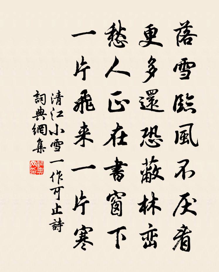 詩詞名句歷史字典書法欣賞書法字典國語詞典說文解字康熙字典古漢語字典標 題 作 者 詩 句 小雪(一作可止詩)作者:清江 朝代:唐代小雪(一作可止詩)原文落雪臨風不厭看,更多還恐蔽林巒。愁人正在書窗下,一片飛來一片寒。詩詞問答問:小雪(一作可止詩)的作者是誰?答:清江問:小雪(一作可止詩)寫於哪個朝代?答:唐代清江小雪(一作可止詩)書法欣賞小雪(一作可止詩)書法作品注釋全唐詩:卷812-21詩詞推薦和石昌言學士官舍十題水紅梅堯臣〔宋代〕江天淡淡江水平,江岸有花紅作穗。今日特向都城開,晝時只合銜魚翠。過宜賓見夷中亂山蘇軾〔宋代〕江寒晴不知,遠見山上日。朦朧含高峰,晃蕩射峭壁。橫雲忽飄散,翠樹紛歷歷。行人挹孤光,飛鳥投遠碧。蠻荒兵亂後雜詩呂本中〔宋代〕萬事多翻覆,蕭蘭不辨真。汝為誤 * ,我作破家人。求鮑羹無糝,澆愁爵有塵。往來樑上燕,相顧卻情親。送馮濟川歸蜀葉紹翁〔宋代〕勇喚東吳萬里船,皂囊來奏九重天。一官豈為蘇洵冗,諸老寧容賈誼先。滿載月歸應有命,便耕雲去豈無田。竹枝失調名佚名〔宋代〕便是監商孟客兒。中秋大風雨五絕劉克莊〔宋代〕詔歲銀袍盛,頭場玉鑒明。妃靈如有助,娥老尚多情。關外宋庠〔宋代〕關外崢嶸歲,河邊寂寞洲。寒雲能不雨,高柳強先秋。野靜狐狸出,沙長雁鶩留。登臨雖信美,無賦可銷憂。送張季修歸簡州兼簡伯修度正〔宋代〕屈子文章似六經,縉雲重與振遺音。一門秀出金閨彥,三峽光搖玉宇參。挾冊夙潛心學海,揮毫今獨步儒林。橫飛喜蔣德瞻還里徐照〔宋代〕長作湯村夢,今來免所思。丹靈年命永,琴裂壁風吹。開戶秋花發,終經午飯遲。岳陽何日去,後集要君詩。後天易吟三十首方回〔宋代〕元亨猶利正,始可用純乾。未了一貞字,何用保性天。過上海寨昔人於此瀦水以限北方項安世〔宋代〕原田漫漫不知津,春寨清明思 * 。雨後燒痕無潤澤,煙中日色少精神。噸城南池溝隍古,海寨東西徑遂新。誰見秋夕嘆白髮詩何遜〔南北朝〕絲白不難染。蓬生直易扶。唯見星星鬢。獨與眾中殊。昔年十四五。率性既廉隅。直是安被褐。非敢慕懷珠。何言題崔中丞北齋鄭巢〔唐代〕湖近草侵庭,秋來道興生。寒潮添井味,遠漏帶松聲。放卷聽泉坐,尋僧踏雪行。何年各無事,高論宿青城。春山司空圖〔唐代〕可是武陵溪,春芳著路迷。花明催曙早,雲膩惹空低。減字木蘭花(簡天牖)吳則禮〔宋代〕九年離別。夢裡相逢端怕說。攜手河梁。雁噭淮天如許長。鱸魚正美。白髮季鷹聊啟齒。後夜江乾。與把梅花子細浙東參政寄示會稽蓬萊閣詩軸,次韻寄題范成大〔宋代〕仙翁來佩玉符麟,綠髮無霜照碧筠。永夜闌乾千嶂月,清風揮塵七州春。塵埃不隔壺中境,功業猶關物外身。鸞鶴三月二十五日飲方校書園十絕劉克莊〔宋代〕空留蘚石仆斜陽,不見奇章與贊皇。何必雍門彈一曲,蟬聲極意說淒涼。金剛隨機無盡頌善現起請分第二釋印肅〔宋代〕一堂風冷澹,翠竹籠軒檻。夜靜松聲清,蟾光凝湛湛。怪夢十首方回〔宋代〕勤能將拙補,命輒與仇謀。尚有江湖債,終無世俗愁。已衰猶未死,欲去又還留。萬事鵝兒酒,諸公燕子樓。懷古王冕〔元代〕浮雲漠漠雲搖天,乳燕翻飛落野田。軒冕盡知為上客,衣冠誰解說前賢?閉門種菜殊無策,坐石看松不記年。世事名句推薦聚散匆匆,此恨年年有。魏夫人《點絳唇·波上清風》 相送巴陵口,含淚上舟行。陳子龍《三洲歌》 困倚危樓。過盡飛鴻字字愁。秦觀《減字木蘭花·天涯舊恨》 良農不為水旱不耕,良賈不為折閱不市。荀子《荀子·修身》 王孫莫把比蓬蒿,九日枝枝近鬢毛。鄭谷《菊》 繡嶺宮前鶴髮翁,猶唱開元太平曲李洞《繡嶺宮詞》 乍暖還輕冷。張先《青門引·春思》 似此星辰非昨夜,為誰風露立中宵。黃景仁《綺懷》 俯飲一杯酒,仰聆金玉章。韋應物《郡齋雨中與諸文士燕集》 無心非,名為錯。有心非,名為惡。李毓秀《弟子規·信》