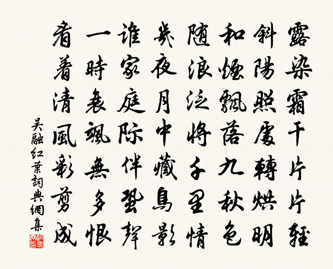 詩詞名句歷史字典書法欣賞書法字典國語詞典說文解字康熙字典古漢語字典標 題 作 者 詩 句 紅葉作者:吳融 朝代:唐代紅葉原文露染霜乾片片輕,斜陽照處轉烘明。和煙飄落九秋色,隨浪泛將千里情。幾夜月中藏鳥影,誰家庭際伴蛩聲。一時衰颯無多恨,看著清風彩剪成。詩詞問答問:紅葉的作者是誰?答:吳融問:紅葉寫於哪個朝代?答:唐代問:紅葉是什麼體裁?答:七律吳融紅葉書法欣賞紅葉書法作品注釋全唐詩:卷687-4詩詞推薦閩中曉晴賞牡丹白玉蟾〔宋代〕晴窗冉冉飛塵喜,寒硯微微暖氣神。喚醒東吳天外夢,化為南越海邊春。存沒口號蘇泂〔宋代〕陶山松柏日夜長,屋下兒孫漸滿堂。當時侍傍五男子,考叔之羹曾未嘗。江上書懷寄希晝釋文兆〔宋代〕扁舟宿江上,眽眽興何窮。吳楚十年客,蒹葭一夜風。東林秋信斷,南越石房空。向此都忘寐,君應與我同。唐侯舉摹刊詩卷牟獻之文趙子昂字方回〔宋代〕金馬文章坡潁氏,玉堂字畫獻羲之。得兼裒施棗此刻,價倍湖州校正詩。得台檄視堰至上皇設黃籙會北友自無而於得孫程公許〔宋代〕肅敞芝壇大面峰,擬憑方寸逆璇穹。夜窗滴盡三更雨,曉霧吹開萬壑風。孤鶴上來隨伴去,十龜相農賞心同。未應首尾吟邵雍〔宋代〕堯夫非是愛吟詩,詩是堯夫憑式時。亂法奈何非獨古,措刑安得見於茲。當時既有少正卯,今日寧無孔仲尼。時世明逸宣義披仙館吳頤〔宋代〕仙境清閒識者稀,幾人來此學幽棲。紅泉瑤草春長在,流水桃花路弗迷。丹氣猶涵階下井,遺蹤難認壁間題。只憐偈頌九十三首釋梵琮〔宋代〕三世請佛不知有,顛狂普化翻筋斗。狸奴白牯卻知有,寒拾相逢開笑口。野乾鳴,師子吼。八兩斗斤,十升一斗。偈頌一百五十首釋心月〔宋代〕修行作佛人無數,捏目無非是亂花。十劫坐來還懡?,不圖打草要驚蛇。雨中花慢姬翼〔元代〕林下山間,人市處處,天游在在玄虛。更不許絲毫增損,具足無餘。漆桶甘沉默音,戲場自作塗糊。枯骸隱几,蒼名節蘇泂〔宋代〕了知名節重於山,誰信今人古誼存。百草前頭梅萼秀,群飛之內鳳凰尊。有身合下陽城拜,無些能招宋玉魂。公道春雨吳融〔唐代〕霏霏漠漠暗和春,冪翠凝紅色更新。寒入膩裘濃曉睡,細隨油壁靜香塵。連雲似織休迷雁,帶柳如啼好贈人。別有同姜濬題裴式微餘乾東齋劉長卿〔唐代〕世事終成夢,生涯欲半過。白雲心已矣,滄海意如何。藜杖全吾道,榴花養太和。春風騎馬醉,江月釣魚歌。散帙寄翠微無可上人一作無學禪師李洞〔唐代〕遠近眾心歸,居然占翠微。展經猿識字,聽法虎知非。泉注城池夢,霞生侍衛衣。玄機不可學,何似總無機。行贐有禮辭之世子舉陸賈事亹亹見愛謝絕以詩李思衍〔宋代〕緣璽南來奉玉音,九重惻怛為民深。蜀人爰陸命如檄,越使何求陸賈金。冰雪孤忠臣子事,乾坤生物帝王心。從今入京道中曝背裘萬頃〔宋代〕露濕芳桃午未乾,花時全似麥秋寒。征衫不敵東風力,試上郵亭曝背看。皇城中花園譏劉白賞春不及令狐楚〔唐代〕五鳳樓西花一園,低枝小樹盡芳繁。洛陽才子何曾愛,下馬貪趨廣運門。贈孫何丁謂王禹偁〔宋代〕三百年來文不振,直從韓柳到孫丁。如今便可令修史,二子文章似六經。送張郎中副使自南省赴鳳翔府幕羊士諤〔唐代〕仙郎佐氏謀,廷議寵元侯。城郭須來貢,河隍亦順流。亞夫高壘靜,充國大田秋。當奮燕然筆,銘功向隴頭。戲題二章述滁州官況寄翰林舊同院王禹偁〔宋代〕要知滁上興如何,養拙偷安幸亦多。小郡既無衣襖使,豐年兼有袴襦歌。公餘處處攜山屐,官醞時時泛海螺。病眼名句推薦梅以曲為美,直則無姿;龔自珍《病梅館記》 織婦何太忙,蠶經三臥行欲老。元稹《織婦詞》 候館梅殘,溪橋柳細。歐陽修《踏莎行·候館梅殘》 寄言燕雀莫相啅,自有雲霄萬里高。李白《觀放白鷹二首》 人到情多情轉薄,而今真箇不多情。納蘭性德《山花子·風絮飄殘已化萍》 龍魚失水難為用,龜玉蒙塵未見珍牟融《春日山亭》 念故人,千里至此共明月。寇準《踏莎行·寒草煙光闊》 明年此會知誰健?醉把茱萸仔細看。杜甫《九日藍田崔氏莊》 起來無語理朝妝,寶匣鏡凝光顧敻《虞美人·觸簾風送景陽鍾》 洛陽城裡見秋風,欲作家書意萬重。張籍《秋思》
