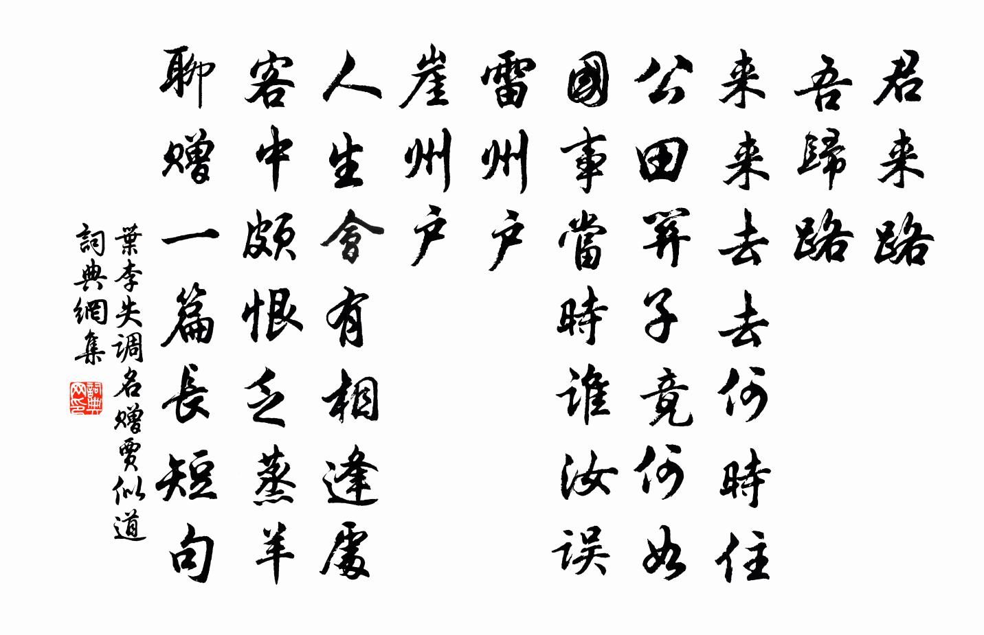 詩詞名句歷史字典書法欣賞書法字典國語詞典說文解字康熙字典古漢語字典標 題 作 者 詩 句 失調名(贈賈似道)作者:葉李 朝代:宋代失調名(贈賈似道)原文君來路。吾歸路。來來去去何時住。公田關子竟何如,國事當時誰汝誤。雷州戶。崖州戶。人生會有相逢處。客中頗恨乏蒸羊,聊贈一篇長短句。詩詞問答問:失調名(贈賈似道)的作者是誰?答:葉李問:失調名(贈賈似道)寫於哪個朝代?答:宋代問:失調名(贈賈似道)是什麼體裁?答:詞葉李失調名(贈賈似道)書法欣賞失調名(贈賈似道)書法作品詩詞推薦伐木佚名〔先秦〕伐木丁丁,鳥鳴嚶嚶。出自幽谷,遷於喬木。嚶其鳴矣,求其友聲。相彼鳥矣,猶求友聲。矧伊人矣,不求友生?偈頌六十八首釋法薰〔宋代〕祖師門下,討甚巴鼻,滿耳春風浩浩地。草木叢林,燈籠露柱,心空及第。汝等諸人,因甚卻來這裹瞌睡。西地錦佚名〔宋代〕不與群花相續。獨占春光速。幽香遠遠散西東,惟竹籬茅屋。羌管誰調一曲。送月夜、猶芬馥。憑君折取向玉堂,特立夜直讀荊公客至當飲酒篇感而有賦姜特立〔宋代〕客至當飲酒,客去合如何。人生無根蔕,保秘客經過。有客固當飲,無客飲自歌。有客與無客,頹然同一科。昔人皇后合春帖子趙湘〔唐代〕宮娃拂曉已催班,拜謝春幡列御前。不待春風報花信,紅酥彩縷斗芳奸。尋張逸人山居劉長卿〔唐代〕危石才通鳥道,空山更有人家。桃源定在深處,澗水浮來落花。照上人去硤內游吳下十年而歸眉宇炯然無復瀘晁公溯〔宋代〕吳帆卻入瞿塘硤,草樹連雲山四圍。想見同來木上座,怪君何苦復東歸。德興邑廨石刻佚名〔宋代〕仕宦之身,天涯海畔。行商之身,南州北縣。不如田舍,長拘見面。門無官府,身即強健。麻麥遍地,豬羊滿圈。酬微上人齊己〔唐代〕古律皆深妙,新吟復造微。搜難窮月窟,琢苦盡天機。晚檜清蟬咽,寒江白鳥飛。他年舊山去,為子遠攜歸。次周益公韻樓鑰〔宋代〕頃嘗假守向中川,公在黃扉已數年。每念夔龍容接武,自期雞犬亦登仙。入朝終嘆一交臂,問道幾思偏祖肩。數仞荷花盛開以病旬余不至亭上偶成二唐律岳珂〔宋代〕好在中孚澤,猶橫未濟舟。擲金隨柳舞,跳玉趁蓮謳。埽榻方思士,鉤簾也覓侯。病夫均一笑,此意本無求。金陵雜興二百首蘇泂〔宋代〕憶殺仙人白仲都,江邊遺蹟尚樓居。驂鸞翳鳳如容我,拜作先師定肯無。次韻石七三六言七首黃庭堅〔宋代〕欲行水遶山圍,但聞鯤化鵬飛。女憂鬢髮盡白,兄嘆江船未歸。書雨陸游〔宋代〕仲冬候始寒,丙夜天正黑。雨來挾風助,吼擊不遺力。聲如拔高山,勢若伐強國。初憂老柏折,遂恐石筍踣。乾坤頌證道歌證道歌釋印肅〔宋代〕般若鋒兮金剛焰,無說無聞非頓漸。倚開長放白毫光,祈雨祈晴無不驗。送裴相公赴鎮太原張籍〔唐代〕盛德雄名遠近知,功高先乞守藩維。銜恩暫遣分龍節,署敕還同在鳳池。天子親臨樓上送,朝官齊出道傍辭。明年水調歌頭 慶壽周權〔元代〕天上有仙客,家世說南州。精神炯炯秋水,胸次納青丘。帶取括蒼風月,來聽蓬萊環佩,笑閱幾春秋。袖有如椽筆拒霜二首張明中〔宋代〕游蜂識盡千紅紫,只這寒芳竟不聞。九月清霜可拒哉,芙蓉剛欲拒霜開。不知拒著清霜後,還有三冬傲雪材。峽州至喜亭范成大〔宋代〕斷崖臥水口,連岡抱城樓。下有吳蜀客,檣竿立滄洲。雨後漲江急,黃濁如潮溝。時見山峽船,鐃鼓譟中流。適從和李公實郎中燕歌行鄭剛中〔宋代〕李侯氣爽常清涼,上奉慈親發垂霜。弟兄如鳳皆翱翔,秋吟胡為慘中腸。白雲孤飛客他鄉,然此王事游有方。晏嫂名句推薦碧水浩浩雲茫茫,美人不來空斷腸。李白《早春寄王漢陽》 過雨西風,數葉井梧愁舞。吳文英《荔枝香近·七夕》 不入虎穴,焉得虎子。程登吉《幼學瓊林·卷四·鳥獸》 寒英坐銷落,何用慰遠客。柳宗元《早梅》 四面歌殘終破楚,八年風味徒思浙。秋瑾《滿江紅·小住京華》 思歸若汾水,無日不悠悠。李白《太原早秋》 岳王祠畔,楊柳煙鎖古今愁。戴復古《水調歌頭·題李季允侍郎鄂州吞雲樓》 白日地中出,黃河天外來。張蠙《登單于台》 蠻姜豆蔻相思味。算卻在、春風舌底。吳文英《杏花天·詠湯》 北極朝廷終不改,西山寇盜莫相侵。杜甫《登樓》