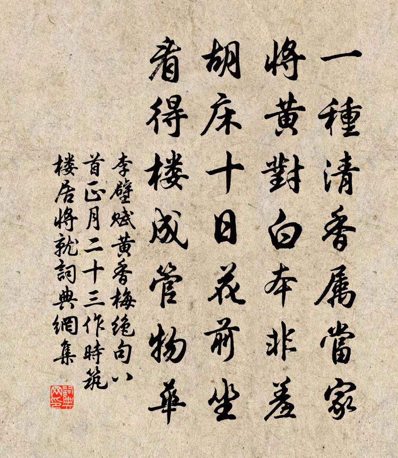 詩詞名句歷史字典書法欣賞書法字典國語詞典說文解字康熙字典古漢語字典標 題 作 者 詩 句 賦黃香梅絕句八首正月二十三作時築樓居將就作者:李壁 朝代:宋代原文一種清香屬當家,將黃對白本非羞。胡床十日花前坐,看得樓成管物華。詩詞問答問:《賦黃香梅絕句八首正月二十三作時築樓居將就》的作者是誰?答:李壁問:該詩寫於哪個朝代?答:宋代書法欣賞賦黃香梅絕句八首正月二十三作時築樓居將就書法作品詩詞推薦滿庭芳(二色梅)王千秋〔宋代〕蕊小雕瓊,花明鎔蠟,天交一旦俱芳。豐臞雖異,皆熨水沈香。應笑粉紅墮紫,初未識、調粉塗黃。憑肩處,金鈿項龍歸省宋理宗〔宋代〕清可正原得忠臣,豈覺辭官歸思匆。為道思新心甚切,難留執手意奚窮。親斟御酒資行色,更敕雲台寫范容。回到曹彥約昌谷集同官絕賦經梅成五十六字毛滂〔宋代〕淡中著色似狂顛,心與梅同跡不然。奪我焉支寧免俗,豈無膏沐獨爭先。辨桃認杏何人拙,壓雪欺霜政自妍。只恐和沈秀才潘良貴〔宋代〕軟語乾時芻拳美,苦言投俗桂姜辛。山河若欲攄幽憤,盥手焚香讀過秦。迓使客夜歸四首楊萬里〔宋代〕病身已怯九秋涼,也復移樽下砌傍。只愛杯中都是月,不知身上寸深霜。清愁舊覺天來遠,寒夜新添歲樣長。不是平水道中陸游〔宋代〕處處陂水滿,家家巢燕忙。葉舒桑漸闇,穗重麥初昂。高下山花發,青紅粉餌香。亦知時節好,老大自悲傷。八月二十四日賓暘華父同登秀亭二首方回〔宋代〕兩公詩思欲飛揚,頗似繁台俯大梁。瀟灑道裝衣袖闊,昂藏壽相耳毫長。持身未慣全隨俗,玩世何嫌略放狂。我有一落索 新柳邵亨貞〔元代〕陌上東風初轉。暗黃猶淺。金鞭拂雪記章台,是幾度、朱門掩。千縷柔絲迎面。吹笙人遠。妝樓妒冷繡簾垂,恐誤憶浪顛陳郁〔宋代〕偶同鄉友校吟編,因得平安到浪顛。心不乾時清似水,發緣憂國白於棉。半生景慕空千里,一紙寒溫廢二年。何日六和寺沖師閘山溪為水軒蘇軾〔宋代〕欲放清溪自在流,忍教冰雪落沙洲。出山定被江潮涴,能為山僧更少留。減字木蘭花(政和癸巳)向子諲〔宋代〕幾年不見。胡蝶枕中魂夢遠。一日相逢。鸚鵡杯深笑靨濃。歡心未已。流水落花愁又起。離恨如何。細雨斜風晚更經李翰林墓殷文圭〔唐代〕詩中日月酒中仙,平地雄飛上九天。身謫蓬萊金籍外,寶裝方丈玉堂前。虎靴醉索將軍脫,鴻筆悲無令子傳。十字傅銀青輓詞二首蘇轍〔宋代〕丹旐國西門,茅廬濟水深。官清貧似舊,名重歿猶存。台閣傳遺懿,交遊拭淚痕。君恩不改故,延賞遍諸孫。架蒲萄張耒〔宋代〕蒲萄盤屈如修蛇,春來螫起紓橫斜。延之升架鱗甲動,舊枾粲粲生光華。盤堆馬乳未敢望,殷勤灌溉意非他。要聽擬王右丞瓜園宋祁〔宋代〕荷鋤往瓜田,煙蔓紛廣疇。植杖未及憇,有客眷林丘。騶哄羅戶前,冠蓋蔭道周。進客北堂上,藉以氍毺柔。持盃張修赴威勝軍判官梅堯臣〔宋代〕青驪渡河水,俠氣動刀環。入幕沙塵暗,臨風鼓角閒。地形通栢谷,秋色滿榆關。誰復輕儒者,難淹筆硯間。同李十二醉飲王氏牡丹園二首張耒〔宋代〕吹盡紛紛桃李塵,天香國艷一翻新。正過穀雨初晴日,分得西都大半春。舊態似推新艷好,紅芳不似淡妝真。嗟予長淮晚望王卿月〔宋代〕目斷長淮渺莽中,孤城突兀倚層空。寒砧幾許遞秋信,漁笛一聲橫晚風。龍吐晴雲嵐氣白,鴉翻落日水天紅。扁舟次韻和黃江陵重午二絕項安世〔宋代〕老便蜜粽加餐易,病卻蒲根仙嚼難。系腕只餘心似結,沐芳誰與臭如蘭。謝誠齋惠酒袁說友〔宋代〕褰裳樂得送迎翁,遣句猶煩七字工。頗識當年斤斧手,卻慚昔日馬牛風。平生楊敬惟稱項,晚歲侯芭只守雄。便把名句推薦天下三分明月夜,二分無賴是揚州。徐凝《憶揚州》 柳絲長,桃葉小。深院斷無人到。晏幾道《更漏子·柳絲長》 此馬非凡馬,房星本是星。李賀《馬詩二十三首·其四》 一年一度,爛漫離披,似長江去浪。吳澄《渡江雲·揭浩齋送春和韻》 年少萬兜鍪,坐斷東南戰未休。辛棄疾《南鄉子·登京口北固亭有懷》 水流濕,火就燥。雲從龍,風從虎。佚名《易傳·文言傳·乾文言》 吳絲蜀桐張高秋,空山凝雲頹不流李賀《李憑箜篌引》 雨後寒輕,風前香軟,春在梨花。仲殊《柳梢青·吳中》 白日不到處,青春恰自來。袁枚《苔》 近來何處有吾愁,何處還知吾樂。辛棄疾《念奴嬌·賦雨岩》