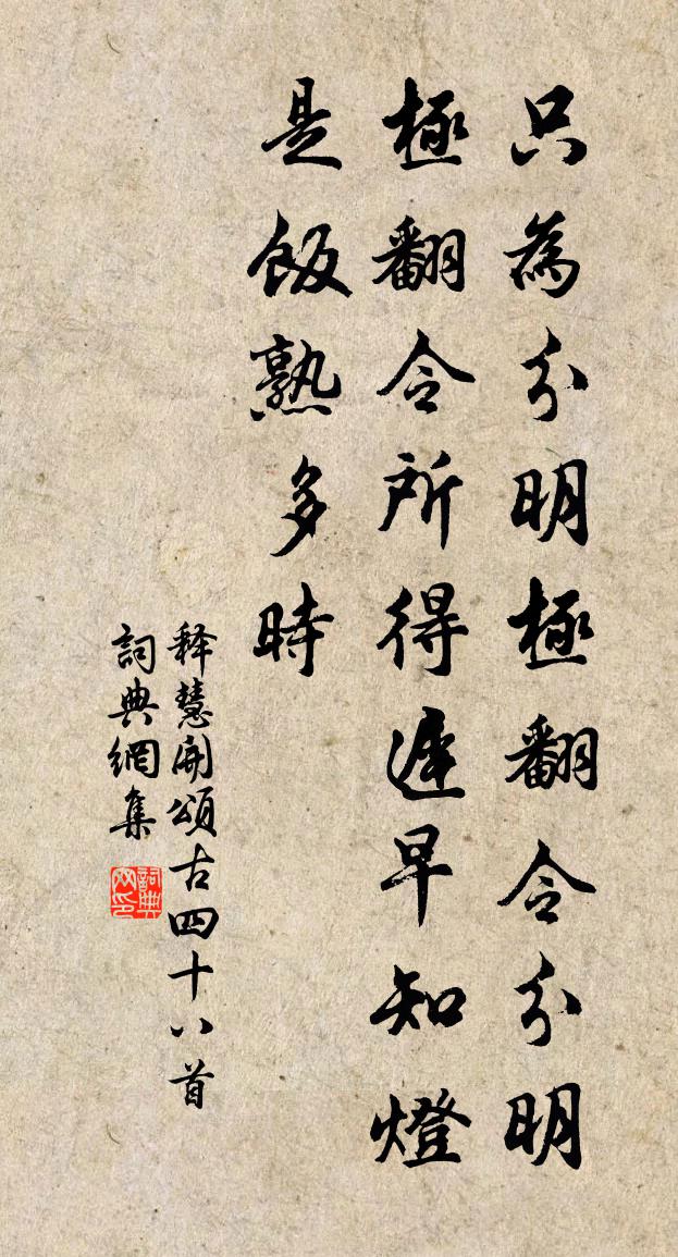 詩詞名句歷史字典書法欣賞書法字典國語詞典說文解字康熙字典古漢語字典標 題 作 者 詩 句 頌古四十八首作者:釋慧開 朝代:宋代頌古四十八首原文只為分明極,翻令分明極,翻令所得遲。早知燈是,飯熟多時。詩詞問答問:頌古四十八首的作者是誰?答:釋慧開問:頌古四十八首寫於哪個朝代?答:宋代釋慧開頌古四十八首書法欣賞頌古四十八首書法作品詩詞推薦滿江紅(席間和洪舍人兼簡司馬漢章太監)辛棄疾〔宋代〕天與文章,看萬斛、龍文筆力。聞道是、一詩曾賜,千金顏色。欲說又休新意思,強啼偷笑真訊息。算人人、合與小詩戲無咎蔡肇〔宋代〕吳山楚水未忘懷,暮雨朝雲恨已乖。縱免摩伽能毀戒,未妨澤室會千齋。酬廬山張處士齊己〔唐代〕發枯身老任浮沉,懶泥秋風更役吟。新事向人堪結舌,舊詩開卷但傷心。苔床臥憶泉聲繞,麻履行思樹影深。終謝偈頌一百零二首釋紹曇〔宋代〕松粉飄香,麥須弄黃。今朝春告別,無處覓行藏。燕子知不遷義,深談實相,對語雕梁。見汝諸人不會,銜泥營故瑞鶴仙趙文〔宋代〕綠楊深似雨。西湖上、舊日情絲恨縷。風流似張緒。羨春風依舊,年年眉嫵。宮腰楚楚。倚畫闌、曾斗妙舞。想而簡蕭東夫虞儔〔宋代〕向來一瓣為南豐,縱使能詩也坐窮。千里望中同夜月,五言城裡帶春風。人言止酒今直止,君自中書豈不中。莫道相和歌辭。明妃曲王偃〔唐代〕北望單于日半斜,明君馬上泣胡沙。一雙淚滴黃河水,應得東流入漢家。道中即事姚勉〔宋代〕我亦欲懷三赤珠,陸郎有母繄獨無。治生復人諫止,亦豈能有千頭奴。同室仇遠〔宋代〕同室過百指,一官寢四年。幸無乞米帖,何取買山錢。止酒陶元亮,思歸孟浩然。乾魚兼菜把,頗勝酌貪泉。浣溪沙佚名〔宋代〕春院無人花自香。飛來蜂蝶意何狂。玉鉤簾卷日偏長。笑又不成愁未是,曲屏閒倚繡鴛鴦。歸時應供□□妝。次韻子瞻過淮見寄兼簡孫奕職方三首蘇轍〔宋代〕龜山昔同到,松竹故依然。紅印封鹹豉,黃罌分井泉。青天攜杖處,晚日落帆偏。無限相思意,新詩句句傳。和并州劉密學見寄魏野〔宋代〕還如裴度鎮河東。百萬軍民畏愛中。鐘鼓久喧刁斗靜,旌幢一指鴈門空。瀟湘故友參時務,燕趙佳人接士風。密地獨立陸游〔宋代〕獨立柴荊外,頹然一禿翁。亂山吞落日,野水倒寒空。憂患工催老,飄零敢諱窮?漁歌亦何恨,淒斷滿西風。蝶戀花王安中〔宋代〕千古銅台今莫問。流水浮雲,歌舞西陵近。煙柳有情開不盡。東風約定年年信。天與麟符行樂分。帶緩球紋,雅宴采菱歌鮑照〔南北朝〕煙曀越嶂深。箭迅楚江急。空抱琴中悲。徒望近關泣。臨江仙(同王侯二公登裴公亭)呂勝己〔宋代〕忽憶裴公台上去,遠空秋氣稜稜。萬山一水秀還明。此時三楚客,何意續騷經。愛竹子猶參杖履,能詩候喜同登。再次韻呈廖明略黃庭堅〔宋代〕吾觀三江五湖口,湯湯誰能議升斗。物誠有之士則然,晚得廖子喜往還。學如雲夢吞 * ,文如壯士開黃間。十年次單君范袖來汪西皋所譔詠秋十章以示因和之陳著〔宋代〕平生念不到輕肥,砧杵淒淒搗布衣。說與妻孥貧自好,相看一笑有春暉。偈頌十三首釋智遇〔宋代〕水中監味,色里膠青。祖暗相凌,何異楚人雞為鳳。我者里任你三頭六臂,盡其其來機,也無你湊泊處。慣將三尺先春賦梅一首陳棣〔宋代〕與客到先春,衰思覺飛越。時當萬卉凋,似補群花闕。始信元化功,生意何曾輟。卻疑鈞天宴,群仙委佩玦。不數名句推薦三五明月滿,四五蟾兔缺。佚名《孟冬寒氣至》 敗荷零落,衰楊掩映,岸邊兩兩三三,浣沙游女。柳永《夜半樂·凍雲黯淡天氣》 不鳴則已,一鳴驚人。司馬遷《滑稽列傳》 食者,國之寶也;兵者,國之爪也墨子《墨子·05章 七患》 關山別盪子,風月守空閨。薛道衡《昔昔鹽》 參差煙樹灞陵橋,風物盡前朝柳永《少年游·參差煙樹灞陵橋》 江山易改,稟性難移。馮夢龍《醒世恆言·卷三十五》 聽元宵,今歲嗟呀,愁也千家,怨也千家。王磐《古蟾宮·元宵》 飲馬渡秋水,水寒風似刀。王昌齡《塞下曲四首》 臣下之勸勞灼見,生民之疾苦周知。宋濂、王褘《元史·列傳·卷一》