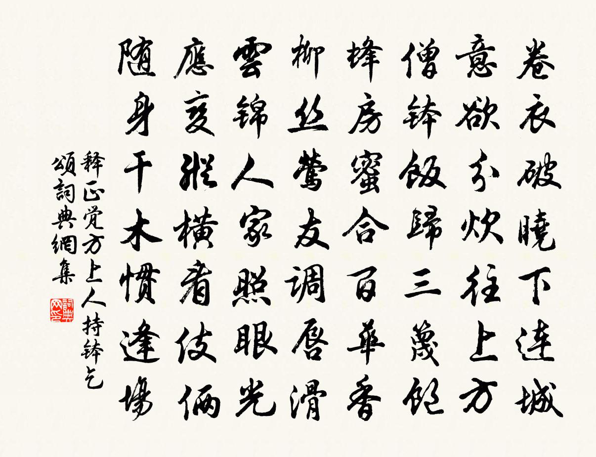 詩詞名句歷史字典書法欣賞書法字典國語詞典說文解字康熙字典古漢語字典標 題 作 者 詩 句 方上人持缽乞頌作者:釋正覺 朝代:宋代方上人持缽乞頌原文卷衣破曉下連城,意欲分炊往上方。僧缽飯歸三篾飽,蜂房蜜合百華香。柳絲鶯友調唇滑,雲錦人家照眼光。應變縱橫看伎倆,隨身乾木慣逢場。詩詞問答問:方上人持缽乞頌的作者是誰?答:釋正覺問:方上人持缽乞頌寫於哪個朝代?答:宋代釋正覺方上人持缽乞頌書法欣賞方上人持缽乞頌書法作品詩詞推薦早朝十絕趙子潚〔宋代〕廿載承恩侍九重,泰階玉燭喜遭逢。嘉禾瑞協當年兆,佇看遠夷貢獻同。秋旱驟雨姜特立〔宋代〕滂沱一雨洗清秋,千里郊原旱氣收。急遣奚奴洗觥盞,醒心亭上看溪流。朝中措趙長卿〔宋代〕於壁。坐前數妓乞詞而歌,以勸大白。因有所感,再和前韻。秋景柳林冪冪暮煙斜。秋水淺平沙。樓外碧天無際,偈頌二百零五首釋正覺〔宋代〕宿雨洗去山面塵,東君料理山家春。浩劫壺中勿新歲,枯木岩前有古人。寒暑不到以法界為處,齒髮不老以虛空為送文鑄師游襄陽鹿門文同〔宋代〕師今鹿門去,正此冒炎曦。野店乞晨饌,亂山吟古詩。問程行幾日,覽景立多時。我有懷賢意,憑看墮淚碑。李次促誕辰頌曹勛〔宋代〕柱史列裔,清映霞舉。環堵所禮,土木所與。起死濟民,渾跡塵土。好生廣德,密佑人主。三千功就,易遷行著。酬王判官和九日韻陳傅良〔宋代〕想懸郴桂一雲泥,夫子聲名正日躋。乞與早移河內粟,牙牌歸聽報班齊。碧泉書院偶書花木所有七首胡宏〔宋代〕武陵春色片雲紅,紅綻功歸暖日烘。青帝也應長作主,莫教隨水又隨風。沈正卿示探梅詩次韻曾協〔宋代〕數點微明已露奇,解顏相見卻先知。攜壺擬醉無窮樹,走馬來看第一枝。照水意閒真我輩,釀寒雲重正花時。自從靖節先生祠下鄧肅〔宋代〕五柳歸來昔陶公,七閩召還今鄧子。不將出處作殊觀,便了陶鄧先生死。送李丞使宣州皎然〔唐代〕結駟何翩翩,落葉暗寒渚。夢裡春谷泉,愁中洞庭雨。聊持剡山茗,以代宜城醑。簽判丈再枉長句次韻趙蕃〔宋代〕紛紛紅蕊一番春,寂寂清陰幾處新。陌上風光屬游女,林間觴詠聽幽人。經旬便作治聾飲,涉七還當修禊辰。無事初冬從幸漢故青門應制沈佺期〔唐代〕漢王建都邑,渭水對青門。朝市俱東逝,墳陵共北原。荒涼蕭相闕,蕪沒邵平園。全盛今何在,英雄難重論。故基山寺小憩張鎡〔宋代〕趨寺松杉夾徑栽,解鞍流憩得莓苔。塵昏金篆牌猶掛,燈暗紗籠殿不開。老鶴就涼臨古井,幽禽尋食下生台。詩成和李倅游武夷楊時〔宋代〕濃淡煙鬟半雨晴,溪光初借晚霞明。鰲頭湧出三峰秀,天漢融成一鑒清。枌社有誰藏舊牒,賓雲無處問遺聲。幔亭林下宋庠〔宋代〕偶作中林適,聊觀萬化春。蜂巢喧似市,禽舌巧於人。陂溜鳴田尾,藤梢衣樹身。鄉農時晤語,野意合天真。玉樓春歐陽修〔宋代〕西亭飲散清歌闋。花外遲遲宮漏發。塗金燭引紫騮嘶,柳曲西頭歸路別。佳辰只恐幽期闊。密贈殷勤衣上結。翠屏出門裘萬頃〔宋代〕出門復入門,吾行竟安之。攜書北窗下,翻閱聊自怡。有懷千載人,掩卷還噓欷。采采首陽薇,戀戀商山芝。一裘和元汝功晚涼城上郭印〔宋代〕潛鱗思縱壑,倦羽欲歸林。平生山水興,過眼必登臨。況復西風來,天雲布層陰。殘暑退十舍,新涼直萬金。寒光奉和幸安樂公主山莊應制李迥秀〔唐代〕詰旦重門聞警蹕,傳言太主奏山林。是日回輿羅萬騎,此時歡喜賜千金。鷺羽鳳簫參樂曲,荻園竹徑接帷陰。手舞名句推薦九州生氣恃風雷,萬馬齊喑究可哀。龔自珍《己亥雜詩·其二百二十》 聞君有兩意,故來相決絕。卓文君《白頭吟》 古來存老馬,不必取長途。杜甫《江漢》 無端嫁得金龜婿,辜負香衾事早朝。李商隱《為有》 見說馬家滴粉好,試燈風裡賣元宵。符曾《上元竹枝詞》 白雪卻嫌春色晚,故穿庭樹作飛花。韓愈《春雪》 西風吹老洞庭波,一夜湘君白髮多。唐珙《題龍陽縣青草湖》 漆燕黃鸝夸舌健,柳花榆莢斗身輕。王禹偁《清明日獨酌》 早知恁么。悔當初、不把雕鞍鎖。柳永《定風波·自春來》 話須通俗方傳遠,語必關風始動人。馮夢龍《警世通言·卷十二》