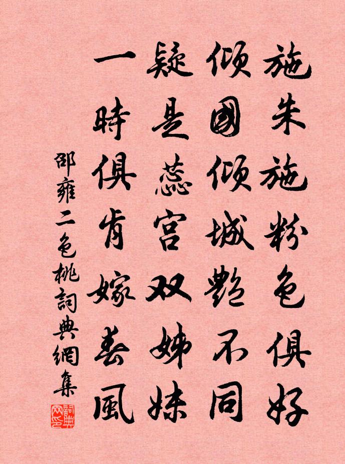 詩詞名句歷史字典書法欣賞書法字典國語詞典說文解字康熙字典古漢語字典標 題 作 者 詩 句 二色桃作者:邵雍 朝代:宋代二色桃原文施朱施粉色俱好,傾國傾城艷不同。疑是蕊宮雙姊妹,一時俱肯嫁春風。詩詞問答問:二色桃的作者是誰?答:邵雍問:二色桃寫於哪個朝代?答:宋代邵雍二色桃書法欣賞二色桃書法作品詩詞推薦呈李書史四首王夢應〔宋代〕火葉雪花正可人,陌頭客子劍生鱗。千年風致未盡歇,如此溪山有棄民。見見之時見非是見釋南雅〔宋代〕見見之時非是見,見猶離見若為論。錢塘江上中秋後,風急潮聲萬馬奔。【雙調】慶宣和張養浩〔元代〕參議隨朝天意可,又受奔波,綽然誰更笑呵呵。倒大來快活,倒大來快活。大小清河諸錦波,華鵲山坡,牧童齊唱公餘出晉康亭小憩曾豐〔宋代〕客來非與景相期,萬象殷勤自四圍。山以出云為顯設,江於朝海得依歸。沙嵐昏墊雨湔祓,煙水汩陳風發揮。公退故洛陽城李郢〔唐代〕胡兵一動朔方塵,不使鑾輿此重巡。清洛但流嗚咽水,上陽深鎖寂寥春。雲收少室初晴雨,柳拂中橋晚渡津。欲問雹戴埴〔宋代〕玄默執徐歲,月律終無射。京師連雨雹,小者如彈,大者如拳。林柯葉亂下,烏鳶折飛翮。屋瓦砉劃遭擊扑,居人讀維摩經郭印〔宋代〕白衣毛心出家,毛從古推淨毛名。無疾毛現有疾,特地真機生。佛欲遣人間,指示轉分明。宜是諸大士,辭屈不能九日登浮屠顧禧〔宋代〕浮屠百尺絕花塵,一望霜林暮色勻。嘯傲自然能遠俗,步趨何必不隨人。參軍帽落嘲誰解,□□□殘草作茵。卻羨李總乾遺詩十四句師於一句之下加頌七句釋印肅〔宋代〕朝朝去禮拜,誰識丹霞在。打倒木佛燒,院主反招罪。得相而無相,參方會不會。如來非大身,老盧快踏碓。梅花十詠全開張至龍〔宋代〕昨夜東風多,花神莫之御。玉立對幽人,士分心情吐。聽雨軒四首李洪〔宋代〕天寒病鴨守冰池,折葦枯荷霰雪飛。不覺喔詩成獨立,南枝的皪露春機。周五聲調曲 宮調曲 三庾信〔南北朝〕握衡平地紀。觀象正天樞。祺祥鍾赤縣。靈瑞炳皇都。更受昭華玉。還披蘭葉圖。金波來白兔。弱木下蒼烏。玉斗偈頌一百四十一首釋師範〔宋代〕一年十二月,此月乃當盡。一月三十日,此日方起頭。此日即是尋常日,那裹是起頭處。此月即是尋常月,那裹是菩薩蠻(癸巳自豫章檄歸)趙師俠〔宋代〕扁舟又向蕭灘去。危檣卻系江頭樹。風送雨聲來。涼生真快哉。電光雲際掣。白浪天相接。不用怯風波。風波平地興化益長老請贊釋師範〔宋代〕益無所益,為無所為。迥超玄化,杳絕機宜。桃紅李白自芬披,問著東風總不知。小孤山阻風因成小詩適舟中有浦城人寫寄真西戴復古〔宋代〕群山勢如奔,欲渡長江去。孤峰拔地起,毅然能遏住。屹立大江乾,仍能障狂瀾。人不知此山,有功天地間。將赴京題陵陽王氏水居許渾〔唐代〕簾卷平蕪接遠天,暫寬行役到尊前。是非境裡有閒日,榮辱塵中無了年。山簇暮雲千野雨,江分秋水九條煙。馬蹄司馬相如琴歌張祜〔唐代〕鳳兮鳳兮非無皇,山重水闊不可量。梧桐結陰在朝陽,濯羽弱水鳴高翔。古陽關/陽關引晁補之〔宋代〕暮草書蛩吟噎。書暗柳螢飛書滅。空庭書雨過,西風緊,飄黃葉。卷書帷寂靜,對此傷離別。重感嘆、中秋數日又山行葉茵〔宋代〕舍棹入山村,山深樹自繁。短歌田舍樂,長揖野人尊。苔老雲生石,松高月闖門。不聞名利語,太古一乾坤。名句推薦小橋橫截,缺月初弓。辛棄疾《沁園春·靈山齋庵賦時築偃湖未成》 師嚴然後道尊,道尊然後民知敬學。戴聖《禮記·學記》 已是懸崖百丈冰,猶有花枝俏。 * 《卜運算元·詠梅》 細草軟沙溪路、馬蹄輕。蘇軾《南歌子·寓意》 春田龜坼苗不滋,猶賴立春三日雪。王士禎《春不雨》 苦雨思白日,浮云何由卷。李白《玉真公主別館苦雨贈衛尉張卿二首》 一年滴盡蓮花漏。碧井酴酥沈凍酒。毛滂《玉樓春·己卯歲元日》 凡治天下,必因人情。韓非及後人《韓非子·八經》 人者多欲,其性尚私。來俊臣《羅織經·閱人卷第一》 敗葉填溪水已冰,夕陽猶照短長亭。納蘭性德《浣溪沙·敗葉填溪水已冰》