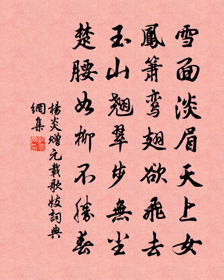 詩詞名句歷史字典書法欣賞書法字典國語詞典說文解字康熙字典古漢語字典標 題 作 者 詩 句 贈元載歌妓作者:楊炎 朝代:唐代贈元載歌妓原文雪面淡眉天上女,鳳簫鸞翅欲飛去。玉山翹翠步無塵,楚腰如柳不勝春。詩詞問答問:贈元載歌妓的作者是誰?答:楊炎問:贈元載歌妓寫於哪個朝代?答:唐代問:贈元載歌妓是什麼體裁?答:七絕楊炎贈元載歌妓書法欣賞贈元載歌妓書法作品注釋全唐詩:卷121_5詩詞推薦臨秋三首宋庠〔宋代〕素潦沙成岸,蒼條柳映津。蟬休疑惜己,晴去似猜人。紺幕隨天遠,瓊鉤伴月新。清風時一至,吹盡故纓塵。泉水佚名〔先秦〕毖彼泉水,亦流於淇。有懷於衛,靡日不思。孌彼諸姬,聊與之謀。出宿於泲,飲餞於禰,女子有行,遠父母兄弟金陵府舍重建金山亭二首蘇頌〔宋代〕地出城隅辟故台,斬茅刪竹受良材。春塘夢草成詩後,畫棟飛雲式燕開。一境山形天際望,四時風物坐中來。府公寄桂帥劉崇龜〔唐代〕碧幢仁施合洪鈞,桂樹林前倍得春。莫戀此時好風景,磻溪不是釣漁人。周知和李粹伯一再和缽字韻詩益工勉繼元韻曾協〔宋代〕道人鍾情獨此花,封植絕類富貴家。毋令攀折強封蠟,精神頓減非生物。五陵少年那得知,氣使造化須新詩。春工木蘭花慢 望郝奉使墓王惲〔元代〕灑西風老淚,又馬上,望郎山。對紅露秋香,芙蓉城闕,依舊雄藩。碧雲故人何在,憶扶搖、九萬看鵬搏。賦就鳳太平州作二首黃庭堅〔宋代〕歐靚腰支柳一渦,小梅催拍大梅歌。舞余片片梨花雨,奈此當塗風月何。塞上曲二首·二年邊戍絕高駢〔唐代〕二年邊戍絕煙塵,一曲河灣萬恨新。從此鳳林關外事,不知誰是苦心人。隴上征夫隴下魂,死生同恨漢將軍。不知品令趙長卿〔宋代〕黃昏時候,誚不語、心如醉。無眠凝想,別來繡閣,多應憔悴。上了燈兒,知是睡哩坐哩。驀思歸計。又還是重屈薊北春望汪元量〔宋代〕江南二月蕨筍肥,江北客行殊未歸。怕上西樓灑鄉淚,東風吹雨濕征衣。河傳令 知縣董德夫小王哲〔元代〕德夫知縣。坐上將余便。索河傳令。堂下落花,你咱分明親見。稍知空,這攀緣,都不戀。爭如修取來生善。早悟信筆陸游〔宋代〕吾生本暫寓,無日不可死;區區遲速間,何地著慍喜?朝移一株石,暮引一脈水,是中亦何樂,一笑聊爾耳。賀同年第三人劉先輩鹹辟命殷文圭〔唐代〕甲門才子鼎科人,拂地藍衫榜下新。脫俗文章笑鸚鵡,凌雲頭角壓麒麟。金壺藉草溪亭晚,玉勒穿花野寺春。多愧郊行寄杜位岑參〔唐代〕崷崒空城煙,淒清寒山景。秋風引歸夢,昨夜到汝潁。近寺聞鐘聲,映陂見樹影。所思何由見,東北徒引領。酴醾黃庭堅〔宋代〕漢宮嬌額半塗黃,入骨濃薰賈女香。日色漸遲風力細,倚欄偷舞白霓裳。秘書省墨竹胡仲弓〔宋代〕寫出此君真面目,筆端造化少人知。我疑與可今猶在,安得東坡共賦詩。謝李六郎中寄新蜀茶白居易〔唐代〕故情周匝向交親,新茗分張及病身。紅紙一封書後信,綠芽十片火前春。湯添勺水煎魚眼,末下刀圭攪麴塵。不寄送三傳赴長城尉(一作送前輩讀三傳任長城尉)張喬〔唐代〕登科精魯史,為尉及良時。高論窮諸國,長才並幾司。地傾流水疾,山疊過雲遲。暇日琴書畔,何人對手棋。送密老位五峰黃庭堅〔宋代〕我穿高安過萍鄉,七十二渡遶羊腸。水邊林下逢衲子,南北東西古道場。五峰秀出雲雨上,中有寶坊如側掌。去與次山房韻何夢桂〔宋代〕易寂無為有感幾,幾存萬物未生時。陰陽理向極中看,天地心從復處知。潮上海門探月窟,日回地戶濯鹹池。何時名句推薦秋天一夜靜無雲,斷續鴻聲到曉聞。張仲素《秋閨思二首》 亦知合被才名折,二十三年折太多。白居易《醉贈劉二十八使君》 上所用者,奸亦為忠;上所棄者,忠亦為奸。來俊臣《羅織經·察奸卷第八》 走馬西來欲到天,辭家見月兩回圓。岑參《磧中作》 一一書來報故人,我欲因之壯心魄。李白《赤壁歌送別》 酒債尋常行處有,人生七十古來稀。杜甫《曲江二首》 常有江南船,寄書家中否。王維《雜詩三首》 用之在於機,顯之在於勢。姜子牙《六韜·文韜·兵道》 新竹高於舊竹枝,全憑老乾為扶持。鄭燮《新竹》 峻法,所以凌過游外私也;嚴刑,所以遂令懲下也。韓非及後人《韓非子·有度》