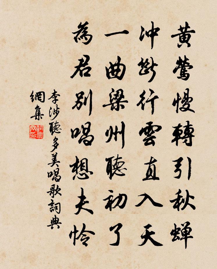 詩詞名句歷史字典書法欣賞書法字典國語詞典說文解字康熙字典古漢語字典標 題 作 者 詩 句 聽多美唱歌作者:李涉 朝代:唐代聽多美唱歌原文黃鶯慢轉引秋蟬,沖斷行雲直入天。一曲梁州聽初了,為君別唱想夫憐。詩詞問答問:聽多美唱歌的作者是誰?答:李涉問:聽多美唱歌寫於哪個朝代?答:唐代問:聽多美唱歌是什麼體裁?答:七絕李涉聽多美唱歌書法欣賞聽多美唱歌書法作品注釋全唐詩:卷477-64詩詞推薦歲窮陸游〔宋代〕困厄身如寄,推遷歲忽窮。百年均昨夢,萬古一飛鴻。夜瓮鳴春酒,晨畦擷晚菘。屬饜童子笑,便腹負吾翁。游萬里橋南劉氏小園陸游〔宋代〕佳園寂無人,滿地梅花香。閒來曳拄杖,臘月日已長。朱橋架江面,欄影搖波光。奇哉小垂虹,夢破鱸魚鄉。汀鷺薌林五十詠寓齋楊萬里〔宋代〕宇宙一行店,誰為店主人。主人亦解去,而況爂余薪。姑孰十詠(一作李赤詩)姑孰溪李白〔唐代〕愛此溪水閒,乘流興無極。漾楫怕鷗驚,垂竿待魚食。波翻曉霞影,岸疊春山色。何處浣紗人,紅顏未相識。送鄭推官赴分州司馬光〔宋代〕百榼行春東,千弓從獵豪。苦吟邊月冷,飛鏑野風高。奇策革命殊俗,長纓擊不毛。輸群躍馬貴,一等著青袍。堂成杜甫〔唐代〕背郭堂成蔭白茅,緣江路熟俯青郊。榿林礙日吟風葉,籠竹和煙滴露梢。暫止飛烏將數子,頻來語燕定新巢。旁人定西番孫光憲〔唐代〕雞祿山前游騎,邊草白,朔天明,馬蹄輕。鵲面弓離短韔,彎來月欲成。一隻鳴髇雲外,曉鴻驚。帝子枕前秋夜,紅梅陸游〔宋代〕薴蘿山下越溪女,戲作長安時世妝。白白朱朱雖小異,斷知不是百花香。春雨陸游〔宋代〕倚闌正爾受斜陽,細雨霏霏度野塘。本為柳枝留淺色,卻教梅蕊洗幽香。小沾蝶粉初何惜,暫澀鶯聲亦未妨。造物次韻學士重陽雪中見招不赴前後十六首洪皓〔宋代〕萸房覓得惜其陳,擬學宗王問鬼神。不放黃花資獻壽,故飛白雪惱留賓。一身抱病蹣跚苦,萬里思親況味辛。正是郊廟歌辭。五郊樂章。肅和魏徵〔唐代〕眇眇方輿,蒼蒼圜蓋。至哉樞紐,宅中圖大。氣調四序,風和萬籟。祚我明德,時雍道泰。妙喜南還以偈迓之釋慧遠〔宋代〕聞道天書下禁闈,定知雲跡會樞機。銅駝千載今休同,一段風光本彩歸。在潁昌寄中立游酢〔宋代〕蕭條清潁一茅廬,魂夢長懷與子居。五里橋西楊柳路,至今車馬往來疏。杏花天慢曹勛〔宋代〕桃蕊初謝,雙燕來後,枝上嫩苞時節。絳萼滋浩露,照曉景、裁翦冰綃標格。煙傳靚質。似淡拂、妝成香頰。看暖溪南春曉羅椅〔宋代〕行逢二三月,春映掌中杯。綠久山猶淺,花寒雨未開。誰能奈愁得,拌不上樓來。更莫看雲坐,瀟湘有雁回。歷代詩唐楊簡〔宋代〕唐祖是李淵,太宗高則天。中宗曾見廢,壑宗傳與玄。肅代德順憲,穆敬文武宣。懿僖及昭哀,二十一君傳。二百送尊禪者王之道〔宋代〕阿遵我輩人,相從十年舊。么肥形愈瘠,身貧道常富。厥初為天衣,持缽化淮右。袖攜維衛錄,訪我過蓬陋。若言詠史上董仲舒三首陳普〔宋代〕孟軻死後惟董子,道義兩言擴古今。性善七篇何落落,千秋不遇一知音。梅花江萬里〔宋代〕床頭周易用心來,舊卷經年病不開。到得初冬夢顏子,欠伸俄健起尋梅。送潚丞剡川樓鑰〔宋代〕工部丞崑丘,我生丁巳年。比吾既逾冠,再轉丞金囦。年齡過半百,奏子喔松軒。親見勤小物,如彼少壯然。受輸名句推薦有誰知我此時情,枕前淚共階前雨,隔個窗兒滴到明。聶勝瓊《鷓鴣天·別情》 治民者,禁奸於未萌。韓非及後人《韓非子·心度》 衣帶漸寬終不悔,為伊消得人憔悴。柳永《蝶戀花·佇倚危樓風細細》 澹月梨花,借夢來、花邊廊廡。史達祖《解佩令·人行花塢》 悲莫悲生離別,樂莫樂新相識,兒女古今情。辛棄疾《水調歌頭·壬子三山被召陳端仁給事飲餞席上作》 其服不同,其行猶一也。墨子《墨子·48章 公孟》 夕陽無限好,只是近黃昏。李商隱《樂遊原 / 登樂遊原》 曉鏡但愁雲鬢改,夜吟應覺月光寒。李商隱《無題·相見時難別亦難》 篤志而體,君子也。荀子《荀子·修身》 淒涼南浦,斷橋斜月。房舜卿《憶秦娥·與君別》