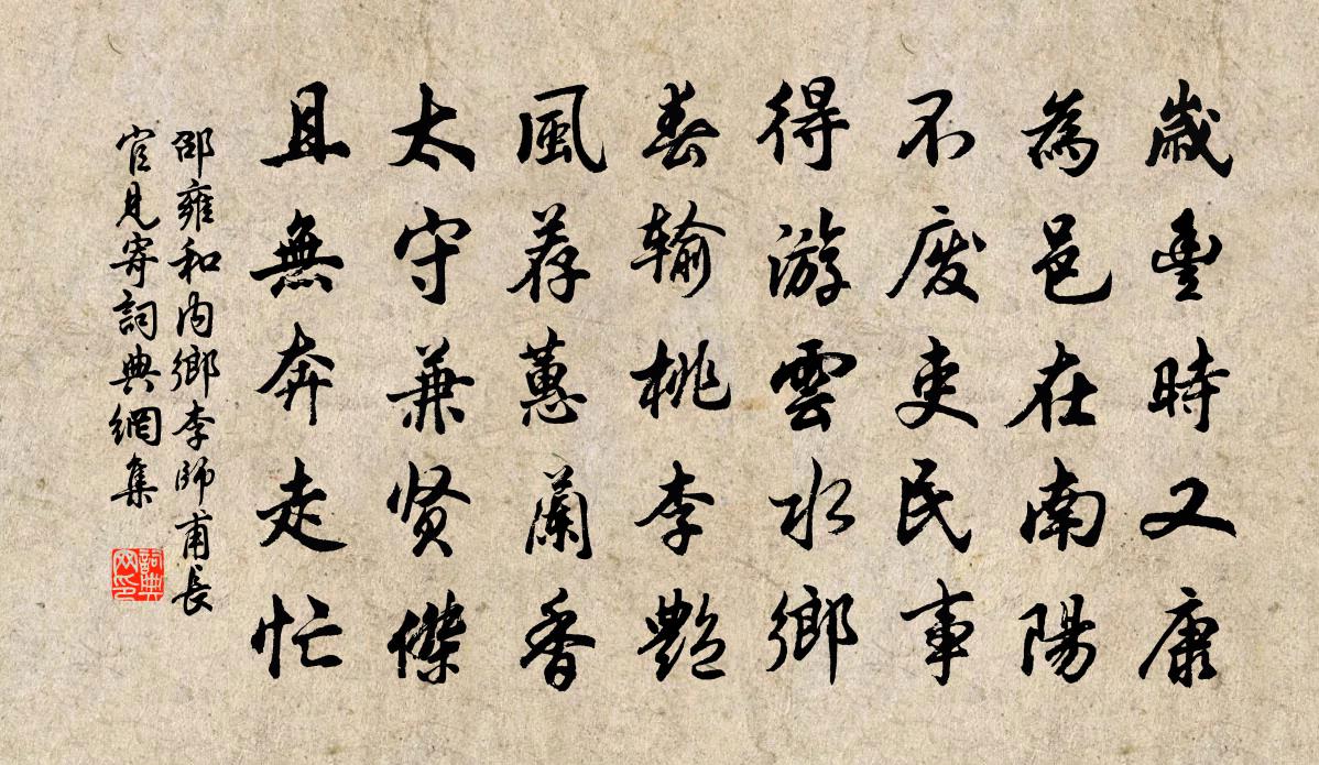 詩詞名句歷史字典書法欣賞書法字典國語詞典說文解字康熙字典古漢語字典標 題 作 者 詩 句 和內鄉李師甫長官見寄作者:邵雍 朝代:宋代和內鄉李師甫長官見寄原文歲豐時又康,為邑在南陽。不廢吏民事,得游雲水鄉。春輸桃李艷,風薦蕙蘭香。太守兼賢傑,且無奔走忙。詩詞問答問:和內鄉李師甫長官見寄的作者是誰?答:邵雍問:和內鄉李師甫長官見寄寫於哪個朝代?答:宋代邵雍和內鄉李師甫長官見寄書法欣賞和內鄉李師甫長官見寄書法作品詩詞推薦清平樂 壽李平章蒲道源〔元代〕□年宮教。龍*隨天造。定策兩朝儒者效。勳業更誰能到。玉堂暫得餘閒。歸□燕坐知還。待滿令公書考,卻回絲開元雜題七首舞馬陸龜蒙〔唐代〕月窟龍孫四百蹄,驕驤輕步應金鞞。曲終似要君王寵,回望紅樓不敢嘶。謝楊誠齋惠長句姜特立〔宋代〕平生久矣服時名,況復親聞玉唾聲。便擬近師黃太史,不須遠慕白先生。巨編固已汗牛積,長句尤能倚馬成。今日妙庭觀用東坡韻王銍〔宋代〕山房書篆自磨丹,溪月還來照碧潭。鼎懼神奸暗持去,道人聊保一枝安。和昌言官舍十題水紅司馬光〔宋代〕夢想水鄉游,階庭植籠古。宛如江外行,高帆落寒浦。煙枝靜疏秀,風穗間低舉。於今看未好,漠漠宜秋雨。移官巴陵行有日矣書呈唐德輿程士和梁和仲於趙蕃〔宋代〕驟雨落還收,余寒去卻留。飄零梅樹底,仿佛杏梢頭。酒有連朝病,詩從一笑求。平生湖海興,又復具扁舟。寄楊誠齋葛天民〔宋代〕參禪學詩無兩法,死蛇解弄活鮁鮁。氣正心空眼自高,吹毛不動全生殺。生機熟語卻不徘,近代獨有楊誠齋。才名水村姜特立〔宋代〕一水瀉寒玉,數峰羅翠屏。漁樵自來往,不悟落丹青。偈頌三十四首釋如淨〔宋代〕春風輕,春日晴。柳眼青,黃鶯鳴。鬱鬱蔥蔥生瑞氣,世上老人天上星。釋迦讚嘆,彌勒證明,蟠桃仙果笑中呈。思佳客(次韻蔡文同集錢漕池亭)洪适〔宋代〕花信今無一半風。芙蓉出水幾時紅。看成弱柳陰陰綠,自在遷鶯巧語中。風傍戶,月留空。金尊相對醉珠櫳。歸鞭胡清卿來訪留一日亟求去雲欲謁鄭宰因以小詩王炎〔宋代〕跋涉山川歲一歸,奚奴古錦慣相隨。自憐機杼無遺巧,卻怪珠璣不療飢。酌酒挽君澆舌本,解驂許我話心期。空囊二疏佚名〔宋代〕賢者多財應損智,愚而殖貨易生嗔。二疏教子無他祝,願向先疇加苦辛。北堂黃公槐〔宋代〕瞻彼北堂,在彼永陽。白雲之下,通化之鄉。句徐仲雅〔唐代〕屋面盡生人耳朵,籬頭多是老翁須。平分造化雙苞去,拆破春風兩面開。雲路半開千里月,洞門斜掩一天春。鑿開花心動慢/花心動佚名〔宋代〕暑逼枕芳襟,甚枕全無因依枕,便教人枕惡。賴有枕溪百尺,朱樓映日,數重香箔。馱冰圍定猶嫌暖,紅日綻、雨句沈平〔宋代〕還君此畫不忍覷,怕憶當年分手處。虛名宋祁〔宋代〕身外虛名莫妄求,強關事事判悠悠。試看雲將三年役,止博鴻蒙一掉頭。春霽吳可〔宋代〕南國春光一半歸,杏花零落雨霏微。新晴院宇寒猶在,曉絮欺風不肯飛。論語絕句一百首張九成〔宋代〕子心俯仰一無欺,由也升堂尚不知。疾病如何猶請禱,孰分上下與神只。失調名某兩地〔宋代〕為愛金陵佳麗。乃分符來此。擁麾忽又向淮東,便咫尺、人千里。畫鼓一聲催起。邦內人齊跪。江山有興我重來,名句推薦出師未捷身先死,長使英雄淚滿襟。杜甫《蜀相》 花滿渚,酒滿甌,萬頃波中得自由。李煜《漁父·一棹春風一葉舟》 君看六幅南朝事,老木寒雲滿故城。韋莊《金陵圖》 小池寒綠欲生漪,雨晴還日西。秦觀《阮郎歸·春風吹雨繞殘枝》 夔府孤城落日斜,每依北斗望京華。杜甫《秋興八首》 求財恨不多,財多害自己。佚名《增廣賢文·上集》 猿鳥猶疑畏簡書,風雲常為護儲胥。李商隱《籌筆驛》 故鄉遙,何日去。家住吳門,久作長安旅。周邦彥《蘇幕遮·燎沉香》 梅花雪,梨花月,總相思。張惠言《相見歡·年年負卻花期》 同來不得同歸去,故國逢春一寂寥!杜牧《宣州送裴坦判官往舒州時牧欲赴官歸京》