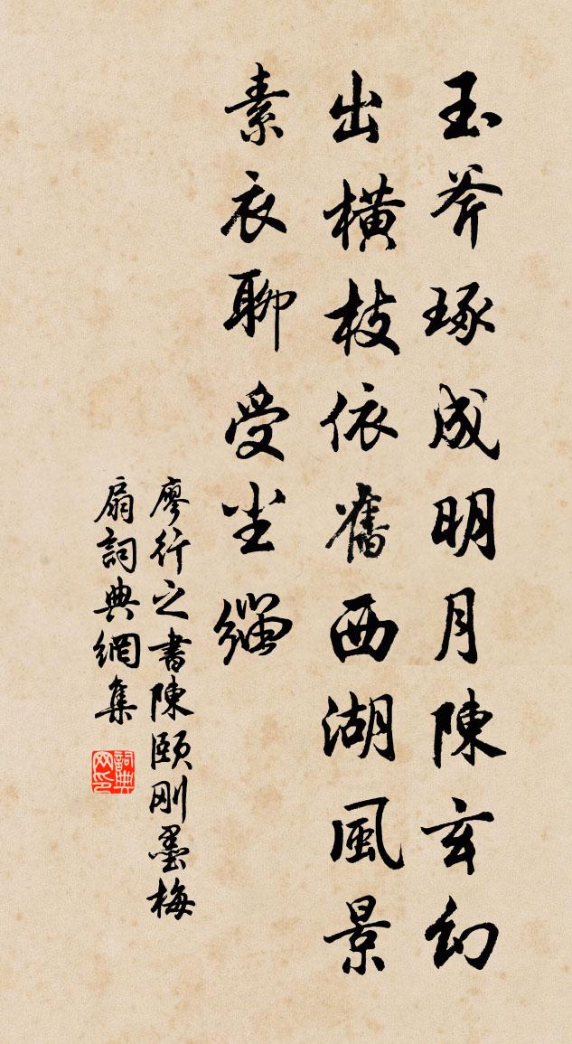 詩詞名句歷史字典書法欣賞書法字典國語詞典說文解字康熙字典古漢語字典標 題 作 者 詩 句 書陳頤剛墨梅扇作者:廖行之 朝代:宋代書陳頤剛墨梅扇原文玉斧琢成明月,陳玄幻出橫枝。依舊西湖風景,素衣聊受塵緇。詩詞問答問:書陳頤剛墨梅扇的作者是誰?答:廖行之問:書陳頤剛墨梅扇寫於哪個朝代?答:宋代廖行之書陳頤剛墨梅扇書法欣賞書陳頤剛墨梅扇書法作品詩詞推薦書行肇師壁釋簡長〔宋代〕禪徑秋苔合,寒窗帶雨痕。心真冥自契,句好與誰論。露冷蛩聲咽,風微葉影翻。白雲如有意,終日在前軒。南鄉子晏幾道〔宋代〕眼約也應虛。昨夜歸來鳳枕孤。且據如今情分里,相於。只恐多時不似初。深意托雙魚。小翦蠻箋細字書。更把此讀王摩詰詩愛其散發晚未簪道書行尚把之句因陸游〔宋代〕我愛古竹枝,每歌必三反。孤舟上荊巫,天末未覺遠。最奇扇子峽,恨不遂高遯。荊棘蜀故宮,煙水楚廢苑。至今侍宴華光殿曲水奉勑為皇太子作詩 九謝朓〔南北朝〕登賢博望。獻賦清漳。漢貳稱敏。魏兩垂芳。監撫有則。匕鬯無方。瞻言守器。永愧元良。擬古 其九陶淵明〔魏晉〕種桑長江邊,三年望當采。枝條始欲茂,忽值山河改。柯葉自摧折,根株浮滄海。春蠶既無食,寒衣欲誰待!本不心如谷種詹初〔宋代〕人心如谷種,生生本無時。雖然有生意,培養貴自知。不耘誠為昧,揠苗良可悲。戒病復有事,苗秀實可期。合流曹光道惠鉅李知其炎酷中有此味亦可樂也梅堯臣〔宋代〕穎傍成蹊李,其實小於拳。誰知皴枝瘦,生此紺玉鮮。摘以筠梢籠,沈以石根泉。蒙蒙粉未落,粲粲葉猶連。蔭樹真身釋正覺〔宋代〕一葉落時天下秋,不風流處卻風流。木人退步金繩斷,直下無機牽鐵牛。句釋曉瑩〔宋代〕二月春方好。初寒陸游〔宋代〕新雁來時歲又殘,丹楓數樹照江乾。前山雲起忽成暝,陋屋雨來初變寒。身退已收清禁夢,里居終出上恩寬。作詩春詞酬元微之(一作施肩吾詩)沈亞之〔唐代〕黃鶯啼時春日高,紅芳發盡井邊桃。美人手暖裁衣易,片片輕花落翦刀。梅谷毛應麟畫梅陳起〔宋代〕生平只為愛梅看,故喜春風上筆端。短軸攜來新繭密,橫枝化作老龍蟠。瘦於影落蟾波夜,清似香飄雪嶺寒。擬貼寄題王才臣南山隱居六首松庵魏了翁〔宋代〕受命獨也正,巋然十八公。人獨匪正命,胡然不如松。蠟梅十五絕和陳天予韻唐仲友〔宋代〕長伴南枝帶雪開,渾無蜂蝶去徘徊。可能熟識金仙面,只有詩人日日來。水龍吟周紫芝〔宋代〕楚山千疊浮空,楚雲只在巫山往。鸞飛鳳舞,當時空記,夢中奇語。曉日瞳曨,夕陽零亂,裊紅縈素。問如今依舊摸魚子 早春作謝應芳〔元代〕看東風、柳搖金縷。精神頓美如許。獨憐老我雙蓬鬢,無復少年張緒。桃葉渡。任山水清妍,可柰非吾土。借人茅白鷺李嘉祐〔唐代〕江南淥水多,顧影逗輕波。落日秦雲里,山高奈若何。溪居即事寄梵天闍梨釋智圓〔宋代〕松竹森森獨掩扉,塵中誰復愛忘機。蒼苔滿砌無人到,猶感幽禽夜夜歸。用蘇昌齡韻,賦李紫篔白雲窗楊維楨〔元代〕紫篔之篔篔滿林,白雲之云云復深。忽見南山有真意,時聞好鳥流清音。盆翻玉女當窗雪,棋款仙樵石几陰。為子秋夕不寐寄樂天劉禹錫〔唐代〕洞戶夜簾卷,華堂秋簟清。螢飛過池影,蛩思繞階聲。老枕知將雨,高窗報欲明。何人諳此景,遠問白先生。名句推薦七國三邊未到憂,十三身襲富平侯李商隱《富平少侯》 一種相思,兩處閒愁。李清照《一剪梅·紅藕香殘玉簟秋》 雷雨窈冥而未半,皦日籠光於綺寮。左思《三都賦》 先世之吏正,故其民篤;今世之吏邪,故其民薄。政弊而不行,令倦而不聽。班固《漢書·傳·公孫弘卜式兒寬傳》 縱被春風吹作雪,絕勝南陌碾成塵。王安石《北陂杏花》 誰念遷客歸來,老大傷名節。李綱《六么令·次韻和賀方回金陵懷古鄱陽席上作》 翰林風月三千首,寄與吳姬忍淚看。劉著《鷓鴣天·雪照山城玉指寒》 我軍青坂在東門,天寒飲馬太白窟。杜甫《悲青坂》 微風搖紫葉,輕露拂朱房。沈約《詠芙蓉》 萬里無人收白骨,家家城下招魂葬。張籍《征婦怨》