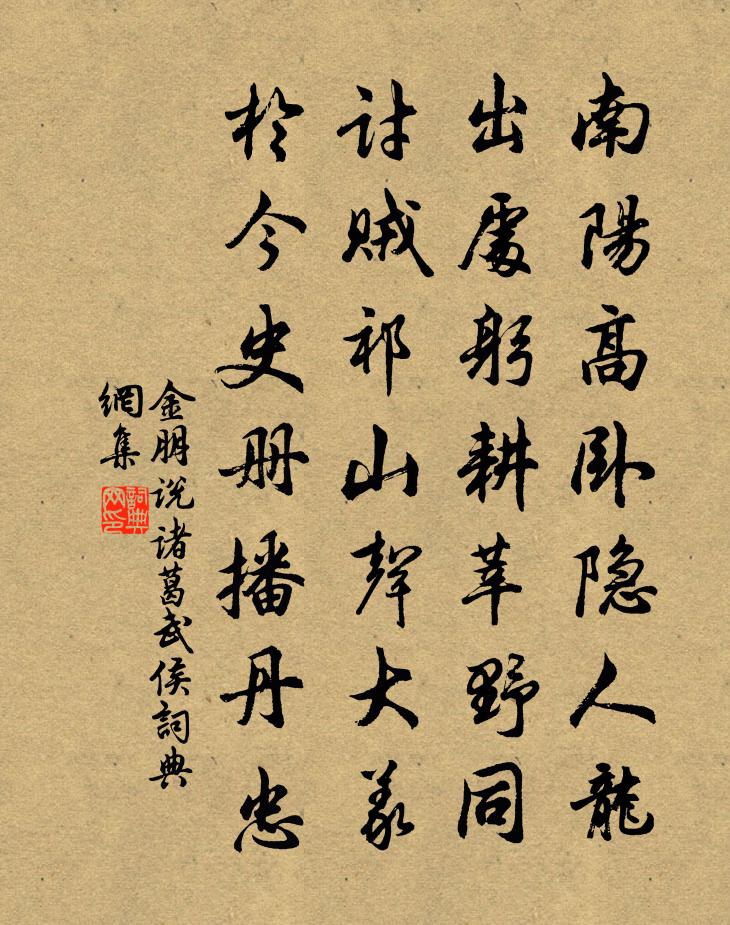 詩詞名句歷史字典書法欣賞書法字典國語詞典說文解字康熙字典古漢語字典標 題 作 者 詩 句 諸葛武侯作者:金朋說 朝代:宋代諸葛武侯原文南陽高臥隱人龍,出處躬耕莘野同。討賊祁山聲大義,於今史冊播丹忠。詩詞問答問:諸葛武侯的作者是誰?答:金朋說問:諸葛武侯寫於哪個朝代?答:宋代金朋說諸葛武侯書法欣賞諸葛武侯書法作品詩詞推薦送張弋司空曙〔唐代〕擁棹江天曠,蒼然下郢城。冰霜葭菼變,雲澤鷓鴣鳴。酒倦臨流醉,人逢置榻迎。嘗聞藉東觀,不獨魯諸生。和拜茶趙希逢〔宋代〕地靈分異產,人力果何功。護想森神物,余應處下風。葉初緘嫩綠,色敢帶昏紅。珍重春前雪,殷勤奉帝宮。舟夜贈內白居易〔唐代〕三聲猿後垂鄉淚,一葉舟中載病身。莫憑水窗南北望,月明月暗總愁人。和黃龍清老三首蘇軾〔宋代〕風前橄欖星宿落,月下桄榔羽扇開。靜默堂中有相憶,清江或遣化人來。句李邴〔宋代〕古來重九皆如此,無復龍山劇孟嘉。送張諫議武元衡〔唐代〕漢庭從事五人來,回首疆場獨未回。今日送君魂斷處,寒雲寥落數株梅。送文子徐妹丈赴隨州太學掾用司馬文正公送先陳亮〔宋代〕昔仰南洲德,今逢世嗣賢。聲名江左重,文教漢東專。君意思空馬,吾生肯絕弦。江頭無語處,一葉浪花前。贈梁運屬陳宓〔宋代〕萱堂處處盡陽春,二月嚴霜凜獨陳。六載侍旁勤奉養,五年居外備艱屯。嗟君不愧曾參孝,愧我殊無考叔純。齊與海棠春 已未清明對海棠有賦吳潛〔宋代〕海棠亭午沾疏雨。便一餉、胭脂盡吐。老去惜花心,相對花無語。羽書萬里飛來處。報掃蕩、狐嗥兔舞。濯錦古江假山鄭剛中〔宋代〕真山固自玉簪碧,秋意亦到假山中。峰潤雨因窗罅入,洞寒雲與小爐通。寄鄭維忠葉雲叟諸友黃榦〔宋代〕村村簫鼓競龍舟,萸菊岩前倚晚秋。老懶焚香書一卷,淡煙疎竹月侵樓。酬虞部蘇員外過藍田別業不見留之作王維〔唐代〕貧居依谷口,喬木帶荒村。石路枉回駕,山家誰候門。漁舟膠凍浦,獵火燒寒原。唯有白雲外,疏鍾聞夜猿。代胡僧留別劉言史〔唐代〕此地緣疏語未通,歸時老病去無窮。定知不徹南天竺,死在條支陰磧中。思歸傅察〔宋代〕舊國日已遠,東秦安在哉。水雲波浩蕩,林日影摧頹。野色撩詩興,秋風動旅懷。擊舟還信步,不覺詠歸來。春日幽居示仲固彥沖十絕胡寅〔宋代〕紅含宿雨兩三枝,淨插銅瓶浥注之。不是靈芸初一見,也非迷路武陵時。和李伯時韻送行七首曹勛〔宋代〕居臨潮落潮生地,占得溪南溪北雲。紫陌清歌同聽曲,丹丘連日喜逢君。白鼉鳴張籍〔唐代〕天欲雨,有東風,南谿白鼉鳴窟中。六月人家井無水,夜聞鼉聲人盡起。司馬宅白居易〔唐代〕雨徑綠蕪合,霜園紅葉多。蕭條司馬宅,門巷無人過。唯對大江水,秋風朝夕波。題壁釋永頤〔宋代〕春來日日風兼雨,開戶晴軒長翠羅。山鵲弄花飛不遠,隔檐衝散落梅多。瞿塘、巫峽張問陶〔清代〕瞿塘蟠大壁,巫峽削千峰。處處奇相敵,山山妙不重。詩隨林壑變,天辟畫圖濃。何日真游遍,穿雲策短筇?名句推薦山甫歸應疾,留侯功復成。張九齡《奉和聖制送尚書燕國公赴朔方》 日習則學不忘,自勉則身不墮徐幹《中論·上卷·治學》 對茲佳品酬佳節,桂拂清風菊帶霜。曹雪芹《螃蟹詠》 丹灶初開火,仙桃正落花。孟浩然《清明日宴梅道士房 / 宴梅道士山房》 知莫大乎棄疑,行莫大乎無過,事莫大乎無悔。荀子《荀子·議兵》 紛披乍依迥,掣曳或隨風。李世民《詠興國寺佛殿前幡》 可憐處處巢居室,何異飄飄托此身。杜甫《燕子來舟中作》 志足而言文,情信而辭巧劉勰《文心雕龍·徵聖》 勸君頻入醉鄉來,此是無愁無恨處。晏幾道《玉樓春·雕鞍好為鶯花住》 試上超然台上看,半壕春水一城花。蘇軾《望江南·超然台作》