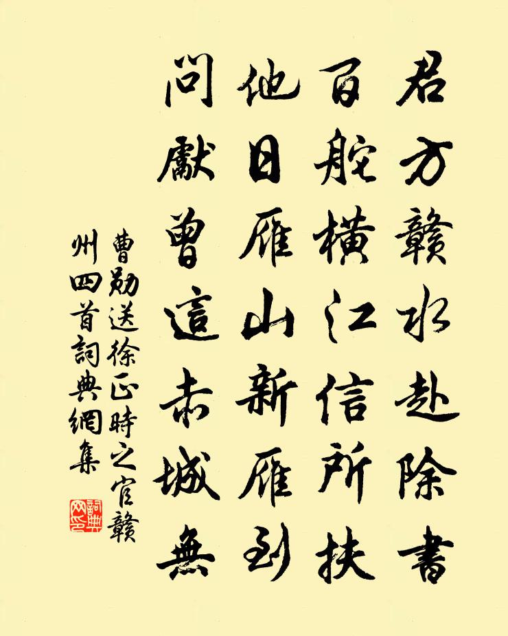 詩詞名句歷史字典書法欣賞書法字典國語詞典說文解字康熙字典古漢語字典標 題 作 者 詩 句 送徐正時之官贛州四首作者:曹勛 朝代:宋代送徐正時之官贛州四首原文君方贛水赴除書,百舵橫江信所扶。他日雁山新雁到,問先曾這赤城無。詩詞問答問:送徐正時之官贛州四首的作者是誰?答:曹勛問:送徐正時之官贛州四首寫於哪個朝代?答:宋代曹勛送徐正時之官贛州四首書法欣賞送徐正時之官贛州四首書法作品詩詞推薦次韻酬銛上人二首張鎡〔宋代〕孰知苾蒭流,而能建安作。燈檠味雋永,曾不帶葵藿。已撞禪月鍾,請振普公鐸。從伊啞羊呼,高厚中沃若。初寒陸游〔宋代〕雨霽林猶滴,泥新路易乾。蕭條山步晚,憔悴客衣單。小女收魚笱,童兒放鴨欄。初寒豈不好,衰病自無歡。宋初祀神州地祗三首佚名〔宋代〕肸鄉儲靈,剝恭用幣。鏘洋導和,洪休允契。嘉氣雲蒸,浹於華裔。式下坤珍,聿符明世。竹山邵勉〔宋代〕房陵郡僻皆山川,竹山更在房西偏。道由房城絕險阻,高崖峻岭相綿延。白須蒲壽宬〔宋代〕月照當襟雪,終剪施摩詰。我作白須行,而得養生術。雪中狂言五首張耒〔宋代〕故園陳墟太昊祠,臘雪消後融春泥。韭芽苣甲初出土,春盤飣斗如棼絲。里閭經過厭此物,糖{左飠右追}寒具方湖州歌九十八首 其十四汪元量〔宋代〕鐵瓮城頭馬亂嘶,金陵城下砲如飛。黑風捲地鼓鼙急,昨夜常州又受圍。留題滻川姚氏鳴琴泉魏野〔宋代〕琴里休夸石上泉,爭如此處聽潺湲。愛於琴里無他意,落砌聲聲是自然。紹興癸丑上已日曹勛〔宋代〕連歲羌酋不荷戈,今年禊飲喜如何。中興樂事雖無象,甲子先同晉永和。題段上人院壁畫古松朱灣〔唐代〕石上盤古根,謂言天生有。安知草木性,變在畫師手。陰深方丈間,直趣幽且閒。木紋離披勢搓摔,中裂空心火燒再用才子富文華校讎天祿閣韻贈周教授陳造〔宋代〕假板未通班,此氣渠容索。周友萬卷腹,小卻石渠閣。培學虎出翼,息妄眼蛻膜。何當去為霜,萬壑正枯涸。晨起聞雞趙蕃〔宋代〕宿雨收茅屋,群雞叫遠村。病羸深擁褐,廚罄晚開門。流落何年已,荒涼莫自存。束書徒負載,飢至不堪論。遣興陸游〔宋代〕前歲峨冠領石渠,即今山市醉騎驢。目衰書卷研求嬾,心弱詩章鍛鏈疏。風雨吾廬嗟獨破,齏鹽每食嘆無餘。燈前次韻酬吳彥珍見寄二首王安石〔宋代〕君作新詩故起予,一吟聊復報雙魚。杖藜高徑誰來往,散帙空堂自卷舒。樹外鳥啼催晚種,花間人語趁朝虛。春風許總卿見和再用韻王之望〔宋代〕四紀才名庵世務,七年符節坤維住。褒功屢有璽書來,趨詔尚遲軺傳赴。男兒功多投老遂,烈士心豈隨年暮。松杉頌古十九首釋慧暉〔宋代〕故山岌岌鎖寒煙,未肯將心輕授傳。玉女夜尋無字印,石人遙指月明前。十三四用喜雪韻四首吳潛〔宋代〕瑞氣應纏牛女虛,坐令三白歷家書。竹寒不用歌周末,粟腐行將紀漢初。蟠際混同能廣大,方圓成就更通疎。狐猿次韻留守王公喜春晁補之〔宋代〕午窗壚火不應殘,春許花期特地寬。塞雁初驚池藻暖,谷鶯猶怯井梧寒。未須園裡幽尋去,且更樓前遠望看。四牡河傳顧夐〔唐代〕燕揚晴景。小窗屏暖,鴛鴦交頸。菱花掩卻翠鬟欹,慵整,海棠簾外影。繡幃香斷金鸂鶒。無訊息,心事空相憶。次韻呂浩然四首張鎡〔宋代〕小築茅堂亦有廳,規摹林野自然清。仙風道骨真人後,過我應除喝道聲。名句推薦離情被橫笛,吹過亂山東。王安石《江上》 丞相祠堂何處尋,錦官城外柏森森。杜甫《蜀相》 濃霧知秋晨氣潤,薄雲遮日午陰涼,不須飛蓋護戎裝。范成大《浣溪沙·江村道中》 學者不患才之不贍,而患志之不立。徐幹《中論·上卷·治學》 正不容邪,邪復妒正。曹雪芹《紅樓夢·第二回》 花隱掖垣暮,啾啾棲鳥過。杜甫《春宿左省》 教亦多術矣,予不屑之教誨也者,是亦教誨之而已矣。孟子《孟子·告子章句下·第十六節》 賢而多財,則損其志;愚而多財,則益其過。司馬光《資治通鑑·漢紀·漢紀十七》 白梅懶賦賦紅梅,逞艷先迎醉眼開。曹雪芹《詠紅梅花得“梅”字》 人去空流水,花飛半掩門。秦觀《南歌子·香墨彎彎畫》