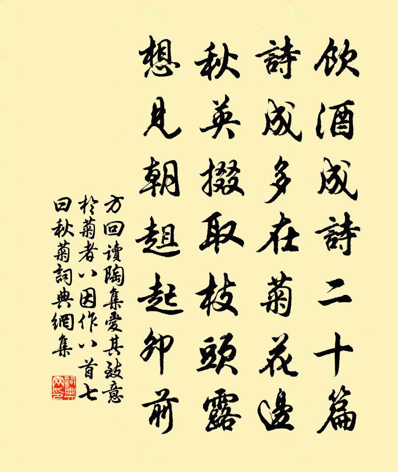 詩詞名句歷史字典書法欣賞書法字典國語詞典說文解字康熙字典古漢語字典標 題 作 者 詩 句 讀陶集愛其致意於菊者八因作八首七曰秋菊作者:方回 朝代:宋代原文飲酒成詩二十篇,詩成多在菊花邊。秋英掇取枝頭露,想見朝趄起卯前。詩詞問答問:《讀陶集愛其致意於菊者八因作八首七曰秋菊》的作者是誰?答:方回問:該詩寫於哪個朝代?答:宋代書法欣賞讀陶集愛其致意於菊者八因作八首七曰秋菊書法作品詩文賞析【原題】:讀陶集愛其致意於菊者八因作八首·七曰秋菊有佳色裛露掇其英詩詞推薦頌古三十八首釋慧方〔宋代〕雲門透法身,分明語露親。移步登山頂,峰高與月鄰。鴛鴦湖棹歌 之六十七朱彝尊〔清代〕鸚鵡湖流碧幾灣,白龍湫水落陳山。遊人秦小娘祠過,社鼓聲邊醉酒還。 中峰范成大〔宋代〕凌高蹋危峰,斗下俯幽谷。仙英馥椒蘭,嘉蔭矗旄纛。空翠元不雨,泄雲自膏沐。暑給森有棱,瘁肌淒欲粟。白崖乞竹贈邠老張耒〔宋代〕與君共一山,修竹居其間。義當給兩家,潘子不得慳。帶甲十萬夫,不戰終日閒。辱使支敝廬,令我愧滿顏。代竹次韻朱牧樂圃宴有感朱長文〔唐代〕竊祿都無簿領迷,得錢邀客手頻攜。春來佳景回三徑,雪後晴波滿一溪。歲月易凋青鬢色,塵埃難上白雲梯。煩君雪後梅邊方岳〔宋代〕野逕茅茨竹作牆,歲寒曾亦幾平章。高人風味天然別,不在橫斜不在香。同兒輩賦未開海棠二首元好問〔金代〕翠葉輕籠豆顆勻,胭脂濃抹蠟痕新。殷勤留著花梢露,滴下生紅可惜春。郊祀樂章太祖皇帝位酌獻登歌作大呂宮彰安崔敦詩〔宋代〕一德開墓,百年垂統。中天禘郊,薄海朝貢。寶龜相承,器鼎加重。澤深慶綿,帝復命宋。次韻虞萬州滄江海棠魏了翁〔宋代〕維摩老子菌生庵,門外滄江綠正涵。夜雨村村拆花柳,春風日日長桑蠶。晚妝才記海棠睡,朝色俄看禁藥酣。造化和伍解元喜祈雨有感趙善括〔宋代〕痴龍偃蹇玩歲月,深居白雲抱幽石。有時江海肆貪殘,坐視天焦地皮拆。分疆守職各有方,止沸詎可揚其湯。曰暘呈江西倉使汪太社二首曾豐〔宋代〕乾道群充賦,尚書獨主盟。當今賢使者,似我老先生。湛輩追隨念,韓門顧盼情。相逢談不了,敢更以詩鳴。送越客歸劉得仁〔唐代〕霜薄東南地,江楓落未齊。眾山離楚上,孤棹宿吳西。渚客留僧語,籠猿失子啼。到家冬即是,荷盡若耶溪。少年游(元豐六年七月六日,王文甫家飲釀白酒,大醉。)蘇軾〔宋代〕雨洗娟娟嫩葉光。風吹細細綠筠香。秀色亂侵書帙晚。簾卷。清陰微過酒尊涼。人畫竹身肥擁腫。何用。先生落筆回至涿州鄭獬〔宋代〕來時正犯長安雪,今見春風入塞初。為問行人多少喜,燕山南畔得家書。宿范水儲嗣宗〔唐代〕行人倦遊宦,秋草宿湖邊。露濕芙蓉渡,月明漁網船。寒機深竹里,遠浪到門前。何處思鄉甚,歌聲聞採蓮。為紀生借屋劉宰〔宋代〕乃祖焚身為祖劉,末孫那敢不相周。單辭往扣賢公子,茅屋保妨得借留。洛陽橋三首劉克莊〔宋代〕周時宮室漢時城,廢址遺基劃已平。乍見橋名驚老眼,南州安得有西京。美人圖唐寅〔明代〕春色關心萬種情,酒杯聊寞可憐生。折花比對佳人面,把臂相同覺命輕。柳梢青佚名〔宋代〕爆竹聲收,燒燈節過,恰又經旬。聞道當年,長庚夢李,嵩岳生申。江淮草木知名。有多少、陰功在人。只恐稱觴蝶戀花·卷絮風頭寒欲趙令畤〔宋代〕卷絮風頭寒欲盡。墜粉飄香,日日紅成陣。新酒又添殘酒困。今春不減前春恨。蝶去鶯飛無處問。隔水高樓,望斷名句推薦東風吹柳日初長,雨余芳草斜陽。秦觀《畫堂春·春情》 東飛烏鵲西飛燕。盈盈一水經年見。陳師道《菩薩蠻·七夕》 芳樹無人花自落,春山一路鳥空啼。李華《春行即興》 綠鬢能供多少恨,未肯無情比斷弦晏幾道《破陣子·柳下笙歌庭院》 久雨寒蟬少,空山落葉深。秘演《山中》 唯有長江水,無語東流。柳永《八聲甘州·對瀟瀟暮雨灑江天》 涼葉蕭蕭散雨聲,虛堂淅淅掩霜清。元好問《秋懷》 黑雲翻墨未遮山,白雨跳珠亂入船。蘇軾《六月二十七日望湖樓醉書》 凡與敵戰,須要選揀勇將銳卒,使為先鋒,一則壯我志,一則挫敵威。佚名《百戰奇略·第一卷·選戰》 燕子不曾來,小院陰陰雨。蔣春霖《卜運算元·燕子不曾來》