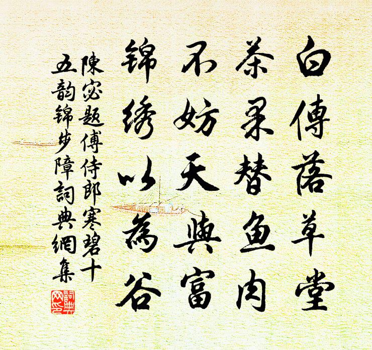 詩詞名句歷史字典書法欣賞書法字典國語詞典說文解字康熙字典古漢語字典標 題 作 者 詩 句 題傅侍郎寒碧十五韻錦步障作者:陳宓 朝代:宋代題傅侍郎寒碧十五韻錦步障原文白傳落草堂,茶果替魚肉。不妨天與富,錦繡以為谷。詩詞問答問:題傅侍郎寒碧十五韻錦步障的作者是誰?答:陳宓問:題傅侍郎寒碧十五韻錦步障寫於哪個朝代?答:宋代陳宓題傅侍郎寒碧十五韻錦步障書法欣賞題傅侍郎寒碧十五韻錦步障書法作品詩詞推薦醉題埭西酒家陸游〔宋代〕桑麻蒙翳不通鄰,耽酒頹然一老民。遣客方眠那是醉?有衣可典未為貧。曬翎斜日鷗來熟,印跡平沙雁到新。君看太原鄭尚書遠寄新詩,走筆酬贈,因代書賀權德輿〔唐代〕曉開閶闔出絲言,共喜全才鎮北門。職重油幢推上略,榮兼革履見深恩。昔歲經過同二仲,登朝並命慚無用。曲台上林春令(魯師文生辰)楊無咎〔宋代〕穠李夭桃堆繡。正暖日、如熏芳袖。流鶯恰恰嬌啼。似為勸、百觴進酒。少年未用稱遐壽。願來歲、如今時侯。相夜坐文天祥〔宋代〕淡煙楓葉路,細雨蓼花時。宿雁半江畫,寒蛩四壁詩。少年成老大,吾道付逶遲。終有劍心在,聞雞坐欲馳。砥柱四首范祖禹〔宋代〕砥柱初開禹力窮,黃河從此去朝宗。長鯨一噴連山起,岌嶪高於太華峰。九月十日龍興寺飲餞蹇磻翁赴梁門酒半題名南強至〔宋代〕昨日曾來把酒卮,隔宵已過菊花期。回頭一笑成陳跡,不獨秋香有盛衰。浮丘道人招魂歌汪元量〔宋代〕有女有女清且淑,學母曉妝顏如玉。憶昔狼狽走空谷,不得還家收骨肉。關河喪亂多殺戮,白日驅人夜燒屋。一雙和北京王郎中見訪留詩邵雍〔宋代〕車從賞春來北京,耿君先期已馳情。此時殞霜奈何重,今歲花開徒有聲。既辱佳章仍墜刺,寧無累句代通名。天之郴江百詠並序蔡倫宅阮閱〔宋代〕竹簡韋編寫六經,不知何用搗枯藤。自從杵臼深藏後,采楮舂桑事已更。湘西寺霽夜李群玉〔唐代〕雨過琉璃宮,佳興浩清絕。松風冷晴灘,竹路踏碎月。月波盪如水,氣爽星朗滅。皓夜千樹寒,崢嶸萬岩雪。後山東歸發犍為,至泥谿舟中作岑參〔唐代〕前日解侯印,泛舟歸山東。平旦發犍為,逍遙信迴風。七月江水大,滄波漲秋空。復有峨眉僧,誦經在舟中。夜泊梅道士水亭王昌齡〔唐代〕金剛波若傲吏非吏,名流即道流。隱居不可見,高論莫能酬。水接仙源近,山藏鬼谷幽。往來迷處所,花下問魚舟壽鄭青山王邁〔宋代〕蒼龍拂曉掛高寒,飛鞚翩然出旁關。九釀黃封中聖酒,一杯紅入上台顏。閹雛生怕韓公召,宮妾萬驚富相還。獨有題趙質夫艇齋董穎〔宋代〕瘦竹吟風橫笛處,叢蕉著雨打蓬時。錦鱗只向銅盤釣,鱅比松江似更奇。對雪和因老韻王之道〔宋代〕諫陛何人正伏蒲,將壇無事且投壺。因觀雪曲詞爭勝,便覺詩鄰勢不孤。警雁王師方入蔡,贈梅邊使欲離吳。可憐西河 和王潛齋韻曹豳〔宋代〕今日書事。何人書弄得如此書。漫漫白書骨蔽川原,恨何日已。關河萬里寂無煙,月明空照蘆葦。謾哀痛,無及矣雜詩吳大有〔宋代〕多年書問斷,湖海竟悠悠。一見心雖滿,相看淚忽流。彩煙山色暮,碧瀨月痕秋。明日登程去,鶺鴒河上愁。憶舊山齊己〔唐代〕誰請衰羸住北州,七年魂夢舊山丘。心清檻底瀟湘月,骨冷禪中太華秋。高節未聞馴虎豹,片言何以傲王侯。應須白髮葉茵〔宋代〕半世持竿笠澤濱,鬢邊留得幾莖春。近來白髮無公道,暗把黑頭饒貴人。縣圃梔子花三重生簡潘君陳宓〔宋代〕疏花早不奈香何,三疊瓊葩底用多。最是動人情意處,黃梅已老未逢荷。名句推薦騷屑西風弄晚寒,翠袖倚闌乾。納蘭性德《眼兒媚·詠紅姑娘》 傷人一語,利如刀割。佚名《增廣賢文·上集》 漢將歸來虜塞空,旌旗初下玉關東。戎昱《塞下曲》 童子柳陰眠正著,一牛吃過柳陰西。楊萬里《桑茶坑道中》 歸裝漸理君知否?笑指廬山古澗藤。陸游《自詠示客》 日上,正赤如丹,下有紅光,動搖承之。姚鼐《登泰山記》 早梅發高樹,迥映楚天碧。柳宗元《早梅》 年年送客橫塘路,細雨垂楊系畫船。范成大《橫塘·南浦春來綠一川》 願隨孤月影,流照伏波營。沈如筠《閨怨二首·其一》 君子耳不聽淫聲,目不視邪色,口不出惡言荀子《荀子·樂論》