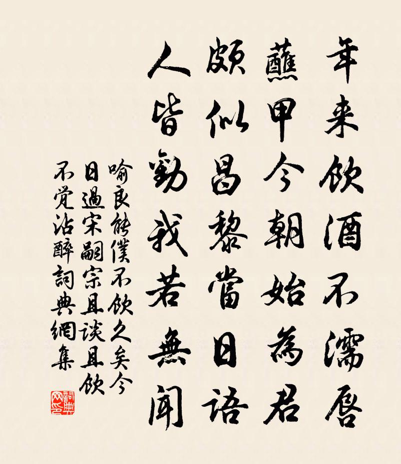 詩詞名句歷史字典書法欣賞書法字典國語詞典說文解字康熙字典古漢語字典標 題 作 者 詩 句 仆不飲久矣今日過宋嗣宗且談且飲不覺沾醉作者:喻良能 朝代:宋代原文年來飲酒不濡唇,蘸甲今朝始為君。頗似昌黎當日文,人皆勸我若無聞。詩詞問答問:《仆不飲久矣今日過宋嗣宗且談且飲不覺沾醉》的作者是誰?答:喻良能問:該詩寫於哪個朝代?答:宋代書法欣賞仆不飲久矣今日過宋嗣宗且談且飲不覺沾醉書法作品詩詞推薦答陳文惠張士遜〔宋代〕八十光陰有二年,煙蘿門戶喜開關。近來無奈山內相,頻寄書來許綴班。荊江漁父竹枝詞九首和夔師□侍郎韻為荊師範項安世〔宋代〕三曲漁人獻壽茶,新翻衢樣織茶花。白雨紛紛下江海,翠浪滾滾開龍蛇。書室雜興陸游〔宋代〕學書五十年,其進不及寸。未能踐繩墨,況敢說豪健。雖然亦有用,尚足博麤飯。開學教牛經,坐市寫驢券。崇安葉簿之先大夫易學得於天而未傳於人余竊曾豐〔宋代〕夢與神遊會自然,乃翁於易發先天。東周以上更三聖,南渡而來第一傳。入室飽參誰舍瑟,過庭精意自忘筌。勾稽九日與智叔鵰堂宴集夜歸陳師道〔宋代〕鵰堂從昔有惡客,酒盡不去仍復索。欲留歌舞盡客意,風雨和更作三厄。佳辰難得客更難,我窮無酒為君歡。只欲和黃倅祈求有應胡寅〔宋代〕海山和氣四時連,太守賓僚自十仙。明恕而行非苟爾,感通之效固昭然。萌心甘澤雲從地,舉意晴蜴日麗天。可但歸自湖西陳造〔宋代〕晨具湖西飯,還家腹果然。怒風長擘席,急浪不鳴船。身覺青冥上,情留白鳥邊。衰年端一快,整帽向雲天。王文伯將校藝漕闈過我取別肯作一夕飲酒竟猶彭龜年〔宋代〕已聞鼓篋無秦銳,肯為論文學賈留。奪我清風俄頃爾,夢回真若隔三秋。新小灘白居易〔唐代〕石淺沙平流水寒,水邊斜插一漁竿。江南客見生鄉思,道似嚴陵七里灘。田家詞(一作田家行)元稹〔唐代〕牛吒吒,田確確。旱塊敲牛蹄趵趵,種得官倉珠顆谷。六十年來兵蔟蔟,月月食糧車轆轆。一日官軍收海服,驅牛旌德觀鄭清之〔宋代〕瀛丈移從弱水間,君恩泮奐得躋攀。茗香壺酒成三事,巾褐枝筇占獨班。培勝亦能充道勝,官閒何似在家閒。玄都夜行船(再至東陽,有歌予往歲重九詞者)韓元吉〔宋代〕極目高亭橫遠岫。拂新晴、黛蛾依舊。策馬重來,秋光如畫,霜滿翠梧高柳。菊美橙香還封酒。歡情似、那時重九促織楊公遠〔宋代〕促人機杼意殊深,徹夜啾啾不絕吟。莫入五侯庭院去,青蛾紅粉少知心。偈頌一百零二首釋紹曇〔宋代〕堋八刺札,新翻曲調,逸格鄉談。意隨流水遠,聲遏莫雲寒,月移花影上欄乾。初九日趙蕃〔宋代〕日日題詩待海棠,要從地主借繩床。偶因風雨愆期至,已是飄零學退妝。陳濟赴舉兼省覲宋祁〔宋代〕相從同是日邊人,兩見江南碧草生。馮鋏車魚初倦客,梁山風雨苦思親。虹橋刻柱前盟苦,獸錦裁囊麗曲新。袍雪鷓鴣天楊冠卿〔宋代〕歲月如馳烏兔飛。情懷著酒強支持。經年不見宮妝面,穠碧誰斟翡翠卮。江路晚,夕陽低。奚奴空負錦囊歸。欲憑六十七守歲姜特立〔宋代〕少時守歲喜蹁躚,老境衰頹只益眠。明日未盡添白髮,怕人問處是增年。送胡季昭二首羅茂良〔宋代〕好讀床頭易一編,盈虛訊息總天然。崢嶸齒頰皆冰雪,肯怕炎言有瘴煙。補樂歌十首豐年元結〔唐代〕猗太帝兮,其智如神;分草實兮,濟我生人。猗太帝兮,其功如天;均四時兮,成我豐年。名句推薦萋萋春草秋綠,落落長松夏寒。王維《田園樂七首·其四》 卻是有,年年塞雁,歸來曾見開時。晁沖之《漢宮春·梅》 聞道長安燈夜好,雕輪寶馬如雲。毛滂《臨江仙·都城元夕》 但看三五日,相見不如初。佚名《增廣賢文·上集》 天涯芳草迷歸路,病葉還禁一夜霜。王夫之《初度口占·辛丑》 強國戰兵,霸國戰智,王國戰義,帝國戰德,皇國戰無為。王通《中說·卷五·問易篇》 人生如寄,何事辛苦怨斜暉。朱熹《水調歌頭·隱括杜牧之齊山詩》 昨夜秋風入漢關,朔雲邊月滿西山。嚴武《軍城早秋》 紅樹青山日欲斜,長郊草色綠無涯。歐陽修《豐樂亭遊春·其三》 悲商叩林,白雲依山。陶淵明《閒情賦》