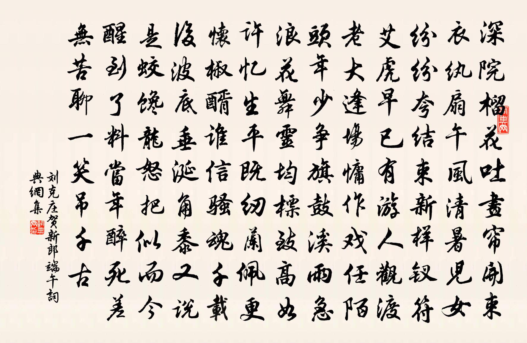 深深的庭院裡石榴花開得正艷。彩繪的帷簾敝開,我身穿粗 * 服,手搖絲絹小扇。中午的清風驅散暑氣,顯得格外清亮。青年們紛紛炫耀自己的節日裝束。頭上插著釵頭彩符,身上佩著艾草紮成的老虎。爭先恐後的來渡口觀看賽龍船。我年紀大了,不願再去與人擁擠,只是站在遠處觀看。任憑那些年輕人搖旗擂鼓吶喊,船漿起伏,江面上浪花翻卷飛舞。屈原的精神千古永存,屈原的風致萬世流傳。他生平帶著芳草,胸襟懷抱如美酒清醇甘甜。誰信在千載之後,他在江底的靈魂還會把米粽垂涎。說什麼是怕蛟龍發怒,才把粽子扔進江中給蛟龍解讒。唉,這些傳說是多么荒誕。假如他一直活到今天,倒不如與世皆醉死在當年,反而省去許多苦惱怨煩。想到這裡便有興作此詞以為笑談,憑弔一下千古含冤的屈原。