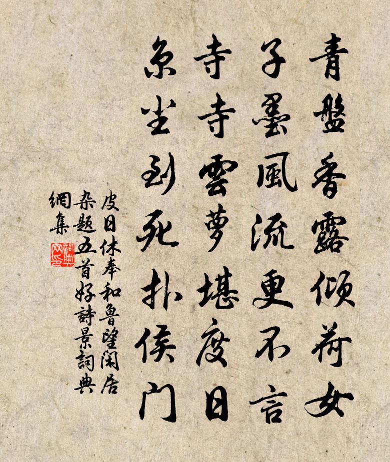 詩詞名句歷史字典書法欣賞書法字典國語詞典說文解字康熙字典古漢語字典標 題 作 者 詩 句 奉和魯望閒居雜題五首好詩景作者:皮日休 朝代:唐代原文青盤香露傾荷女,子墨風流更不言。寺寺雲蘿堪度日,京塵到死撲侯門。詩詞問答問:《奉和魯望閒居雜題五首好詩景》的作者是誰?答:皮日休問:該詩寫於哪個朝代?答:唐代書法欣賞奉和魯望閒居雜題五首好詩景書法作品注釋全唐詩:卷616-16詩詞推薦獻中書潘舍人李中〔唐代〕運葉琴半千數,琴天鍾許國琴臣。鵬霄開羽翼,鳳闕演絲綸。顧問當清夜,從容向紫宸。立言成雅誥,正意敘彝倫賦千岩曲水姜夔〔宋代〕紅雨灑溪流,下瀨仍小駐。魚隊獵殘香,故故作吞吐。老子把一杯,微風忽吹去。秋月二首孔文仲〔宋代〕秋夜不可晨,悲歌聊自永。頫聽一掀簾,星河光炯炯。霜浮萬瓦寂,月滿四山靜。壯心隨北內,吹入單于境。雲童行張籍〔唐代〕雲童童,白龍之尾垂江中。今年天旱不作雨,水足牆上有禾黍。題道夫東征錄釋寶曇〔宋代〕老來氣味覺深穩,餘子但知聲擊撞。煙雲合千態萬狀,意氣吞五湖三江。如聞日觀眇天下,俯視坎井非吾邦。丈夫城南雜詠二十首柳堤張栻〔宋代〕前年種垂柳,已復如許長。長條莫攀折,留待映滄浪。罷官次常山寄鄭叔詳毛滂〔宋代〕閒身已置參軍幘,歸路仍推處士車。石室散仙當醉起,試傳訊息過煙霞。雪中寄魏衍陳師道〔宋代〕薄薄初經眼,輝輝已映空。融泥還結凍,落木復沾叢。意在千山表,情生一念中。遙知吟榻上,不道絮因風。與子野過永仙觀循西城以歸邂逅李戒甫夕山西仇遠〔宋代〕一笑相逢李伯時,樹陰匝地綠雲低。林梢落日猶余丈,天下好山多在西。我醉欲歸須客送,君裝已趣尚鵑啼。明朝樂椽自淮南回示新詩梅堯臣〔宋代〕淮南歷覽還宣城,囊多嘉句何冰清。入門先叫十年兄,袖中大卷持來評。我雖暗愚眼不盲,要識合如劉長卿。舉頭次韻趙教授陳造〔宋代〕爭米何心問斗城,聚蚊底許太狂生。未遑餼粟如子罕,謾復公言付阿平。緩我愁腸千縷結,羨君筆力萬鈞輕。何時泛舟東池坐客賦詩次其韻胡銓〔宋代〕逐客生涯一釣篷,野塘幽絕小樓東。柳邊新過清塵雨,水面徐來送月風。逸興似窮千里遠,勝游還復五人同。子皮孤山釋善珍〔宋代〕數樹梅花地,先朝處士廬。柳凹人系馬,萍破鷺窺魚。空冢衣冠蛻,山房水石虛。白頭舊園吏,曾見幸金輿。又六言二首劉克莊〔宋代〕群雄走野逐鹿,一士入海騎鯨。不聽安期畫策,便知子羽無成。次韻蘇公謁告三絕陳師道〔宋代〕靜中有業官成集,醉里無何老是鄉。丈室向來無一物,郤須天女與拈香。書磨崖碑李徽卿〔宋代〕臣奸雖杜前朝失,國體終輕二子閒。不使忠嘉傳後世,只將詞翰許元顏。夢中和人梅詩山礬韻洪咨夔〔宋代〕溪路槎牙木葉乾,角聲吹動五更寒。疏疏梅蕊疏疏雪,一段生綃不用礬。府試觀開元皇帝東封圖馬戴〔唐代〕儼若翠華舉,登封圖乍開。冕旒明主立,冠劍侍臣陪。跡類飛仙去,光同拜日來。粉痕疑檢玉,黛色訝生苔。掛壁贈屏風岩棲蟾上人釋與鹹〔宋代〕岩房高且靜,住此幾寒暄。鹿嗅安禪石,猿啼乞食村。朝陽生樹罅,古路透雲根。獨步閒相覓,淒涼碧洞門。用厚後弟強甫韻劉克莊〔宋代〕不腆先疇與破庵,在汾水曲管岑南。幽棲晚節巢林一,戇草當年及□三。酒甕有期春共酌,書囊無底曉猶談。吾惽名句推薦可憐報國無路,空白一分頭。楊炎正《水調歌頭·登多景樓》 人間夢隔西風,算天上、年華一瞬。吳文英《惜秋華·七夕》 離別一何久,七度過中秋。蘇轍《水調歌頭·徐州中秋》 風驅急雨灑高城,雲壓輕雷殷地聲。劉基《五月十九日大雨》 牧人驅犢返,獵馬帶禽歸。王績《野望》 幾時能命駕,對酒落花前。賈島《清明日園林寄友人》 怪人不知理,知理不怪人。佚名《增廣賢文·下集》 五更疏欲斷,一樹碧無情。李商隱《蟬》 情知已被山遮斷,頻倚闌乾不自由。辛棄疾《鷓鴣天·晚日寒鴉一片愁》 西風惡。數聲新雁,數聲殘角。黃機《憶秦娥·秋蕭索》