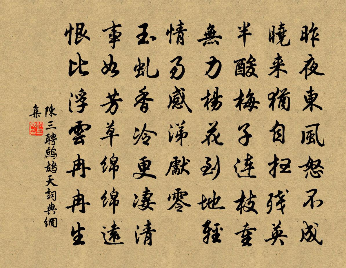 詩詞名句歷史字典書法欣賞書法字典國語詞典說文解字康熙字典古漢語字典標 題 作 者 詩 句 鷓鴣天作者:陳三聘 朝代:宋代鷓鴣天原文昨夜東風怒不成。曉來猶自掃殘英。半酸梅子連枝重,無力楊花到地輕。情易感,涕先零。玉虬香冷更淒清。事如芳草綿綿遠,恨比浮雲冉冉生。詩詞問答問:鷓鴣天的作者是誰?答:陳三聘問:鷓鴣天寫於哪個朝代?答:宋代問:鷓鴣天是什麼體裁?答:詞陳三聘鷓鴣天書法欣賞鷓鴣天書法作品詩詞推薦山中三首劉應時〔宋代〕始看紅紫上花稍,倏忽春光半已消。最是幽窗斷魂處,杜鵑啼月過山腰。靈照女贊釋子益〔宋代〕家業盡拋離,沿街賣笊籬。胸中無限意,不許老龐知。訪羅孟弼竹園張栻〔宋代〕江梅獨立蔭頹牆,苔蘚封枝色老蒼。手剪荊榛增嘆息,眼中春意滿三湘。次韻汪以南教授美康使君新政因及賤跡四首方回〔宋代〕石壁峰前舊泮林,新培槐市綠成陰。川流決潰終歸海,木德迴環會守心。夷軌得朋殊未艾,長謠懷感抑何深。矧伊詠冰胡仲弓〔宋代〕群陰正膠轕,結作千丈冰,江河凍欲枯,雪意猶憑陵。舟楫不可濟,水波那能興。世路多風寒,履此何兢兢。本是烏夜啼潘牥〔宋代〕無端小雪廉纖。入平檐。金鴨旋添龍餅,莫開簾。尋梅約。開還落。可曾忺。合作一年春恨,上眉尖。次韻酬趙無己方回〔宋代〕文才因學進,名譽待時隆。定有仙能遇,元無鬼可窮。剛貞侔鐵石,猥瑣笑蒿蓬。百尺樓頭目,時時沒去鴻。御街行(柯山故人別後改圖,因作此)趙長卿〔宋代〕香熏斗帳相逢乍。正宮漏、沈沈夜。月飛梅影上簾櫳,標緻風流嬌雅。眼波橫浸,照人百媚,無限叮嚀話。玉鞍門觀棋絕句邵雍〔宋代〕未去交爭意,難忘黑白心。一條無敵路,徹了沒人尋。送友人入塞曹鄴〔唐代〕亂蓬無根日,送子入青塞。蒼茫萬里秋,如見原野大。鳥雀寒不下,山川迥相對。一馬沒黃雲,登高望猶在。驚風鷓鴣天辛棄疾〔宋代〕欲上高樓去避愁,愁還隨我上高樓。經行幾處江山改,多少親朋盡白頭!歸休去,去歸休,不成人總要封侯。浮雲橘二首趙與□〔宋代〕倦客滄浪意,扁舟汗漫遊。雲歸林屋晚,木落洞庭秋。此地真堪老,中原卒未休。可知侯萬戶,不似橘千頭。三月二日被命祈晴上天竺舟中得六絕句劉克莊〔宋代〕勤本小家數,韓歐大秀才。二公需作料,勾入集中來。到龍井寺鄭清之〔宋代〕十里輕軒憩佛廬,夢身差記蝶蘧蘧。伊蒲巧作魚蝦樣,矮筍新鑱繭栗株。暫到欲陪僧夏靜,等閒生怕俗塵污。計然春日有感三首危稹〔宋代〕情知老卻流鶯了,爭奈狂如蛺蝶可。尚有紫薇紅藥在,佳人休唱怨春歌。憶秦娥沈端節〔宋代〕憑闌獨。南山影蘸杯心綠。杯心綠。悠然忽見,臥披橫軸。西風暗度釵梁玉。手香記得人簪菊。人簪菊。無窮幽韻贈常庵江羽士徐清叟〔宋代〕九曲溪頭活計,三生石上精魂,沓沓間云何處,空山明月啼猿。鷓鴣天 霍國瑞母八十之壽魏初〔元代〕少日教兒苦讀書。只今驄馬到亨衢,鏡中雙鬢秋難染,膝上諸孫玉不如。花淡淡,竹疏疏。風流好個壽星圖。平安落花黎廷瑞〔宋代〕紅雪霏霏入燕泥,朝來猶是可憐枝。春風葵麥玄都觀,可是劉郎見事遲。韓京叔古木寒泉圖家鉉翁〔宋代〕朝來我夢三偉人,振袂而入清風生。掃門坐需佳客至,鄰叟醉墨俄然成。古木昂藏出澗壑,下臨百丈寒泉清。高冠名句推薦忽憶故人天際去,計程今日到梁州。白居易《同李十一醉憶元九》 落梅庭榭香,芳草池塘綠。晏幾道《生查子·落梅庭榭香》 酌酒以自寬,舉杯斷絕歌路難。鮑照《擬行路難·其四》 老圃好栽培,菊花五月開。顧太清《菩薩蠻·端午日詠盆中菊》 童孫未解供耕織,也傍桑陰學種瓜。范成大《夏日田園雜興·其七》 動失之繁,靜失之寡。王通《中說·卷十·關朗篇》 生怕見花開花落,朝來塞雁先還。辛棄疾《漢宮春·立春日》 恨人間、會少離多,萬古千秋今夕。張埜《奪錦標·七夕》 但恨處非位,愴悢使心傷。阮籍《詠懷八十二首·其七十九》 重簾不捲留香久,古硯微凹聚墨多。曹雪芹《紅樓夢·第四十八回》