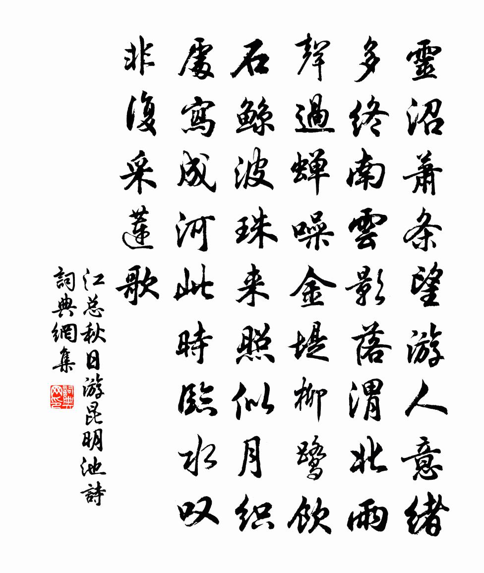 詩詞名句歷史字典書法欣賞書法字典國語詞典說文解字康熙字典古漢語字典標 題 作 者 詩 句 秋日游昆明池詩作者:江總 朝代:隋代秋日游昆明池詩原文靈沼蕭條望。遊人意緒多。終南雲影落。渭北雨聲過。蟬噪金堤柳。鷺飲石鯨波。珠來照似月。織處寫成河。此時臨水嘆。非復採蓮歌。詩詞問答問:秋日游昆明池詩的作者是誰?答:江總問:秋日游昆明池詩寫於哪個朝代?答:隋代江總秋日游昆明池詩書法欣賞秋日游昆明池詩書法作品詩詞推薦靈仙觀和危驪塘韻董居誼〔宋代〕多病侵尋鬢欲秋,自慚何止四宜休。青松十里嵩源路,醉倒仙台是樂丘。次韻宋德器春晚即事五首李流謙〔宋代〕久習成衰怯,何方療闊疎。柴車窮巷客,貝葉長年書。每愧沾沾喜,寧甘鬱郁居。蓍神吾未暇,堅意聽盈虛。江南曲四首周文璞〔宋代〕孤館聞啼鶯,日暮脂粉薄。芳醪似泥賤,那得不行樂。病梅館記龔自珍〔清代〕江寧之龍蟠,蘇州之鄧尉,杭州之西溪,皆產梅。或曰:“梅以曲為美,直則無姿;以欹為美,正則無景;以疏為巨野二首陳師道〔宋代〕紅落芙蕖晚,青深蒲稗秋。平湖無過鳥,鳴鼓有行舟。高宗皇帝輓詞二首黃謙〔宋代〕火德興王統,天威讋獷夷。重恢周境土,復振漢威儀。顯號崇瑤冊,耆年慶玉卮。鼎成龍雲遠,扳慕不勝悲。鷓鴣天黃庭堅〔宋代〕 * 枝頭生曉寒,人生莫放酒杯乾。風前橫笛斜吹雨,醉里簪花倒著冠。身健在,且加餐。舞裙歌板盡清歡。黃花幽居記今昔事十首以詩書從宿好林園無俗情為陸游〔宋代〕昔戍西陲時,憑高望中原,願欲乘天風,往吊綺與園。有志莫能遂,悵望商山魂。遙想山中人,歲時奠芳蓀,夕陽夢遊蘇泂〔宋代〕殿前入醉索催茶,玉女傳宣賦彩霞。誰道塵緣猶未斷,碧桃花下卻思家。和王公覿賞海雲山茶合江梅花徐彥孚〔宋代〕萬蕊山茶傍臘開,一番春信入江梅。追游共按黃金轡,縱賞還傾白玉杯。濃艷迎風香斷續,疏枝橫月影徘徊。隼旟送寶覺禪師王洋〔宋代〕夏淺春餘宇宙清,溪山千里送君行。今宵柳岩半輪月,何處花村飛錫聲。衣挽嶺雲猶帶濕,鶴隨杯渡不須驚。江頭金氏庵范成大〔宋代〕醉墨題窗側暮鴉,蔓藤緣壁走青蛇。春深有燕捎飛蝶,日暮無人掃落花。滿庭芳蘇軾〔宋代〕香靉雕盤,寒生冰箸,畫堂別是風光。主人情重,開宴出紅妝。膩玉圓搓素頸,藕絲嫩、新織仙裳。雙歌罷,虛檐謁金門(大葉莊懷張元孺作)蘇庠〔宋代〕楊柳渡。醉著青鞋歸去。點點沙鷗何處所。十里菰蒲雨。拌擻向來塵土。臥看碧山雲度。寄語故時猿鶴侶。未見心旅感釋文珦〔宋代〕苦無住山資,千里遠為客。兄弟會面難,雙親鬢毛白。故園書不來,愁緒日夜積。滿庭枯草根,忽復化新碧。冬至前七日青崖分送新曆陳杰〔宋代〕嫩黃裹冊印如斗,傳教打六驚晝眠。又見朔平新改歲,獨憐絳老不知年。繡衣春立層霄上,黍律陽回七日前。更願偶書陳襄〔宋代〕朝居晦息與山鄰,物理由來有屈伸。獨把一心經萬事,逍遙須養谷中神。席見獅兒陳維崧〔清代〕猛獸產於絕域,驍騰來自安西。一呼百物盡披靡,何論猘奴鷂子。我顧灰頹若此,兒應跳蕩如斯。神仙將相詎難為白獺湖章樵〔宋代〕屈曲連汀隱復明,西湖奇觀到南屏。萍花巧綴玉鈿碧,山色淨涵螺髻青。隋女啼妝羞缺月,秦娥望幸對明星。主人廉州人歌佚名〔唐代〕廉州顏有道,性行同莊老。愛民如赤子,不殺非時草。名句推薦迴廊一寸相思地,落月成孤倚。納蘭性德《虞美人·銀床淅瀝青梧老》 不似天涯,捲起楊花似雪花。蘇軾《減字木蘭花·立春》 歲夜高堂列明燭,美酒一杯聲一曲。李頎《聽安萬善吹觱篥歌》 自家富貴,不著意里,人家富貴,不著眼裡,此是何等胸襟王永彬《圍爐夜話·第二三則》 忽大風起,塵氣莽莽然,城市依稀而已。蒲松齡《山市》 梅花雪,梨花月,總相思。張惠言《相見歡·年年負卻花期》 還怕掩、深院梨花,又作故人清淚。吳文英《無悶·催雪》 上林訊息好,鴻雁已歸來。張元乾《臨江仙·送宇文德和被召赴行在所》 聰明睿智,守之以愚李昉、李穆、徐鉉《太平御覽·文部·卷六》 含弘光大,品物鹹亨。佚名《易傳·彖傳上·坤》
