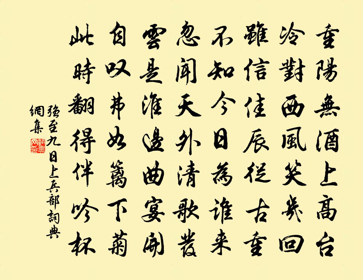 詩詞名句歷史字典書法欣賞書法字典國語詞典說文解字康熙字典古漢語字典標 題 作 者 詩 句 九日上兵部作者:強至 朝代:宋代九日上兵部原文重陽無酒上高台,冷對西風笑幾回。雖信佳辰從古重,不知今日為誰來。忽聞天外清歌發,雲是淮邊曲宴開。自嘆弗如籬下菊,此時翻得伴吟杯。詩詞問答問:九日上兵部的作者是誰?答:強至問:九日上兵部寫於哪個朝代?答:宋代強至九日上兵部書法欣賞九日上兵部書法作品詩詞推薦題太平館傅知錄〔宋代〕萬物榮枯自有時,梅花非早菊非遲。時人莫似春蝴蝶,才到花開便滿枝。過長安市方回〔宋代〕算橘租菱小市嘩,堰頭橋尾約千家。人家已盡無人處,時見芙蓉一岸花。虎丘阻雨黃庚〔宋代〕石闌浸碧劍池空,池外秋聲萬壑風。人倚僧窗看風雨,亭亭塔影有無中。六歌文天祥〔宋代〕我生我生何不辰,孤根不識桃李春。天寒日短重愁人,北風隨我鐵馬塵。初憐骨肉鍾奇禍,而今骨肉相憐我。汝在過西峰主人知出回訪劉伯山不值雲過黃永新也趙蕃〔宋代〕佛寺興已盡,隱廬來不賒。隤基瀕野水,瘦竹隱疏花。試挽添丁問,雲過叔度家。清談固難覓,渴肺頗思茶。枕上作陸游〔宋代〕謝事還家一老農,悠然高臥聽晨舂。雖無客共樽中酒,何至僧鳴飯後鍾?采若未能浮楚澤,思鱸猶欲釣吳松。自余絕句鄭文寶〔宋代〕亭亭畫舸擊寒潭,直到行人酒半酣。不管煙波與風雨,載將離恨過江南。過孔北海墓二十韻溫庭筠〔唐代〕撫事如神遇,臨風獨涕零。墓平春草綠,碑折古苔青。珪玉埋英氣,山河孕炳靈。發言驚辨囿,撝翰動文星。蘊策答倪生德中來韻楊維楨〔元代〕綺山才子才庸峭,素色成文似邵綾。待詔歸來金馬客,題詩寄去碧桃僧。畫眉誰問張京兆,多病深憐馬茂陵。昨夜塞下曲張玉孃〔宋代〕寒入疳榆霜滿天,鐵衣馬上枕戈眠。愁生書角鄉心破,月度深閨舊夢牽。落雁行銀箭,開弓鄉欣環。三更豪鼓角,無錫道中賦水車蘇軾〔宋代〕翻翻聯聯銜尾鴉,犖犖确確蛻骨蛇。分疇翠浪走雲陣,刺水綠針抽稻芽。洞庭五月欲飛沙,鼉鳴窟中如打衙。天公偈頌一百五十首釋心月〔宋代〕玉轉珠回著眼看,有相干處沒相干。只將此個以為主,一劍倚天星斗寒。次竹溪韻跋志仁工部柞木詩劉克莊〔宋代〕冥搜險韻攪枯腸,音義時乎取斷章。吾窶僅能茅破屋,君材真可棟明堂。居然挺挺過蒼柏,勝似蕭蕭種白楊。識草青玉案尹志平〔元代〕心頭遠惡常修善。自得真方便。至道夷然容易見。目前端正,是非休論,堪作長生伴。玄言悟徹無分辯。默默頤真雨杜甫〔唐代〕山雨不作泥,江雲薄為霧。晴飛半嶺鶴,風亂平沙樹。明滅洲景微,隱見岩姿露。拘悶出門游,曠絕經目趣。消中離歌辭五首徐鉉〔唐代〕莫折紅芳樹,但知盡意看。狂風幸無意,那忍折教殘。朝日城南路,旌旗照綠蕪。使君何處去,桑下覓羅敷。事與二友陸游〔宋代〕剩儲名酒待梅開,淨掃虛窗候月來。老子幽居得二友,人間萬事信悠哉!望峨嵋山作晁公溯〔宋代〕普賢大開士,神足靡不周。世人妄指此,象馭昔所留。願觀百億身,奔走數十州。見者喜稱快。不見默懷羞。紛紛游雲門山黃庶〔宋代〕南山州之屏,四時改顏色。日夕太守宴,供帳減繒帛。更求秉燭飲,圖寫在四壁。煙雲時藏埋,景好疑愛惜。我官病酒吳可〔宋代〕無聊病酒對殘春,簾幕重重更掩門。惡雨斜風花落盡,小樓人下欲黃昏。名句推薦群山萬壑赴荊門,生長明妃尚有村。杜甫《詠懷古蹟五首·其三》 諂諛在側,善議障塞,則國危矣。墨子《墨子·01章 親士》 漢家旌幟滿陰山,不遣胡兒匹馬還。戴叔倫《塞上曲二首·其二》 先到為君,後到為臣。佚名《增廣賢文·上集》 且憑天子怒,復倚將軍雄。高適《塞下曲》 待羔兒、酒罷又烹茶,揚州鶴。辛棄疾《滿江紅·和范先之雪》 無分者,人之大害也; 有分者,天下之本利也荀子《荀子·富國》 半天涼月色,一笛酒人心。袁枚《夜過借園見主人坐月下吹笛》 堯不能獨成,烏獲之不能自舉韓非及後人《韓非子·觀行》 人生自是有情痴,此恨不關風與月。歐陽修《玉樓春·尊前擬把歸期說》