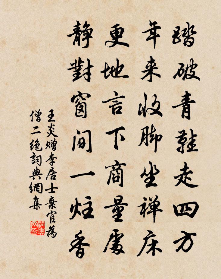 詩詞名句歷史字典書法欣賞書法字典國語詞典說文解字康熙字典古漢語字典標 題 作 者 詩 句 贈李居士棄官為僧二絕作者:王炎 朝代:宋代贈李居士棄官為僧二絕原文踏破青鞋走四方,年來收腳坐禪床。更地言下商量處,靜對窗間一炷香。詩詞問答問:贈李居士棄官為僧二絕的作者是誰?答:王炎問:贈李居士棄官為僧二絕寫於哪個朝代?答:宋代王炎贈李居士棄官為僧二絕書法欣賞贈李居士棄官為僧二絕書法作品詩詞推薦八月八日發潭州後得絕句四十首趙蕃〔宋代〕扁舟往作櫧州過,煙霧空濛只市聲。今夕再來還小泊,卻逢江月正空明。金鰻井衛涇〔宋代〕鰻井由來歲月深,泓澄一鏡絕塵侵。要觀變化神功妙,會見翻為旱歲霖。臨江仙(呈祖禹十六叔)晁補之〔宋代〕盡說彭門新半㓨,昆吾剸玉如泥。功名餘事不須為。才情詩里見,風味酒邊知。好在阿鹹同老也,青雲往歲心期。用希古韻送天台金吉父王柏〔宋代〕行李西來又欲東,無情雲雨鎖長空。窗前細嚼書中味,膝上虛傳瑟外風。老去苦無佳客語,新來忽有賞心同。錢唐頌十玄談達本釋印肅〔宋代〕堪嗟去日顏如玉,常和白雲空裹宿。千回萬匝只如然,寥寥獨唱無生曲。西樓獨立白居易〔唐代〕身著白衣頭似雪,時時醉立小樓中。路人回顧應相怪,十一年來見此翁。火記六百篇張伯端〔宋代〕火記六百篇,十月如轉轂。朝昏各一卦,屯蒙相趁逐。子時發陽火,二百一十六。午時起陰爻,十八八個足。鉛消繁昌江邊風兩獺祭魚人立而拜鄭起〔宋代〕寒食清明在客途,片帆飄泊老無廬。松楸方念無人掃,忽見江邊獺祭魚。自西園登山張栻〔宋代〕日光射崖冰雪色,風壑傳響松龍吟。但忻耳目得所遇,不覺山高几許尋。嬾趣陸游〔宋代〕謝病掩柴荊,年來嬾趣成。舌根茶味永,鼻觀酒香清。已矣馳驅息,悠然磊磈平。高眠得三昧,夢斷已窗明。納涼章甫〔宋代〕大熱金石流,日色赤可畏。鄙夫先多病,喘息僅存氣。飲冰不救渴,膚汗那容睡。秋風幾時來,不問黑貂敝。林梢送陸先生赴春闈周必大〔宋代〕九重詔下選賢能,又見先生啟遠行。離恨暗隨流水去,朔風穩送片帆輕。休嗟此日暌違事,預發來春晉錫榮。一去祭神州樂章。舒和佚名〔唐代〕坤道降祥和庶品,靈心載德厚群生。水土既調三極泰,文武畢備九區平。白雲謠佚名〔先秦〕白雲在天,丘陵自出。道里悠遠,山川間之。將子無死,尚復能來。送瑞州張知錄徐璣〔宋代〕歲暮不惜別,君行是宦遊。江西多野水,湖上正高秋。舊友曾過處,新題必共留。官閒可尋訪,竹徑最深幽。白菡萏一首蘇籀〔宋代〕瑳兮容曠世,冰膩郁妖紅。姑射非無偶,能言諒不同。贈張軒民贊善王安石〔宋代〕潮打空城寂寞回,百年多病獨登台。誰人得似張公子,有底忙時不肯來。水調歌頭蔡戡〔宋代〕擁節出閩嶠,易鎮上岷山。東西嶮岨,分陝初不在榮觀。痛念兩河未復,獨作中流砥柱,屹若障狂瀾。極目神京遠與秦太虛、參寥會於松江,而關彥長、徐安中蘇軾〔宋代〕二子緣詩老更窮,人間無處吐長虹。平生睡足連江雨,盡日舟橫擘岸風。人笑年來三黜慣,天教我輩一樽同。知君偈頌一百三十六首釋惟一〔宋代〕仲春漸暖,是處花開。夭桃烘日暈生臉,紅杏吟風笑滿腮。是今彌勒,是古如來,一一分身不用猜。有人一見便見名句推薦綠葉素榮,紛其可喜兮。屈原《九章》 離愁不管人飄泊。年年孤負黃花約。黃機《憶秦娥·秋蕭索》 桃花三十六陂,鮫宮睡起,嬌雷乍轉。吳文英《瑞龍吟·德清清明競渡》 翠葆參差竹徑成。新荷跳雨淚珠傾。周邦彥《浣沙溪·翠葆參差竹徑成》 多少天涯未歸客,盡借籬落看秋風。唐寅《菊花》 大雪壓青松,青松挺且直。陳毅《青松》 月明船笛參差起,風定池蓮自在香。秦觀《納涼》 臣下之勸勞灼見,生民之疾苦周知。宋濂、王褘《元史·列傳·卷一》 歌泣不成天已暮,悲風日夜起江生。魏禧《登雨花台》 黃鶯百舌正相呼,玉樹後庭花帶雨。牛殳《琵琶行》