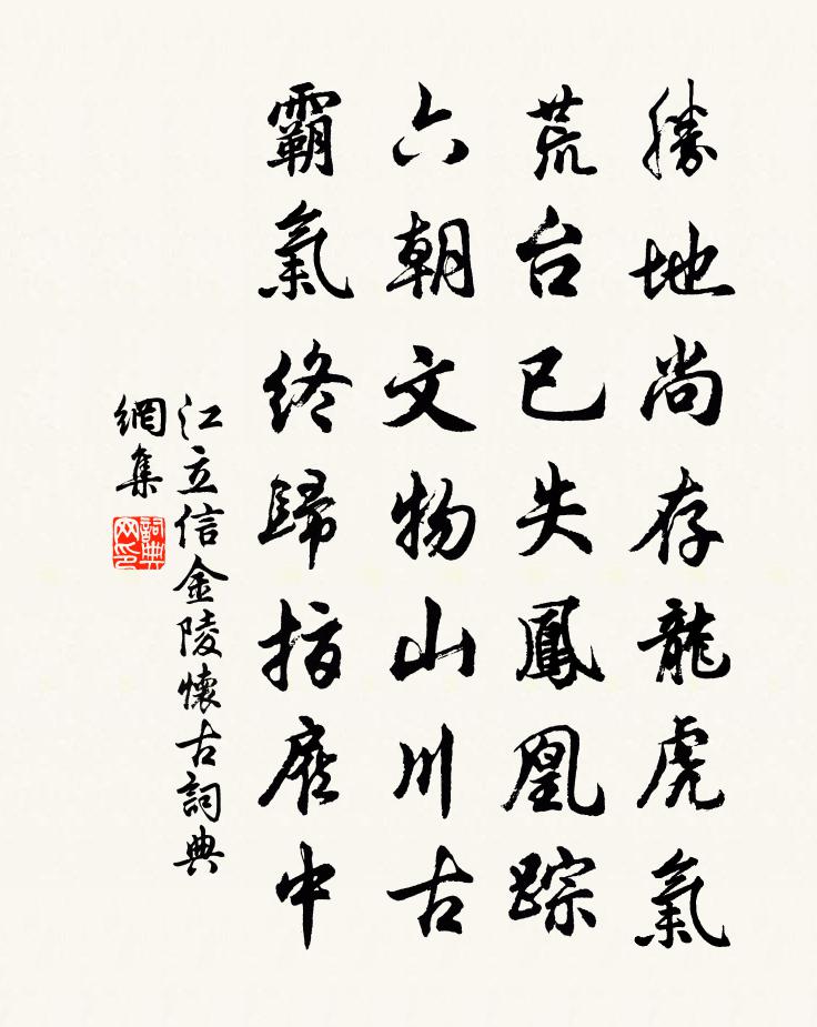 詩詞名句歷史字典書法欣賞書法字典國語詞典說文解字康熙字典古漢語字典標 題 作 者 詩 句 金陵懷古作者:江立信 朝代:宋代金陵懷古原文勝地尚存龍虎氣,荒台已失鳳凰蹤。六朝文物山川古,霸氣終歸指雇中。詩詞問答問:金陵懷古的作者是誰?答:江立信問:金陵懷古寫於哪個朝代?答:宋代江立信金陵懷古書法欣賞金陵懷古書法作品詩詞推薦自詒陸游〔宋代〕荒圃風煙入荷鉏,孤村巷陌看騎驢。少年曾縱千場醉,老境惟存一束書。作意買山雖已矣,忍慚乞米獨何歟?所欣覽古四十二首 其十楊維楨〔元代〕任安與田仁,周仕將軍門。廝養惡齧馬,實坐貧失身。發忿騎奴席,拔刀徒自分。不會趙少府,何時別奴群。乃知春日湖上武衍〔宋代〕花外垂楊閱四朝,東風依舊綠條條。當年盛事人猶說,二殿龍舟泊畫橋。特地新 勸世王哲〔元代〕騁俏多能,身呈體段。把衣衫、頻頻脫換。穿茶枋,入酒店,總夸好漢。驀然遇天高,這精神早減了一半。奉勸風木蘭花慢·拆桐花爛漫柳永〔宋代〕拆桐花爛漫,乍疏雨、洗清明。正艷杏澆林,緗桃繡野,芳景如屏。傾城。盡尋勝去,驟雕鞍紺幰出郊坰。風暖繁征蜀聯句韓愈〔唐代〕日王忿違慠,有命事誅拔。蜀險豁關防,秦師縱橫猾。 ——韓愈風旗匝地揚,雷鼓轟天殺。竹兵彼皴脆,鐵刃我山中即事王鎡〔宋代〕落花流出石崖泉,疑是山中有隱仙。路隔深林看不見,斧樵聲在碧雲邊。【仙呂】點絳唇 集赤壁賦佚名〔元代〕萬里長江,半空煙浪,驚濤響。東去茫茫,遠水天一樣。 【混江龍】壬戌秋七月既望,泛舟屬客樂何方?過黃和賓客相國詠雪許渾〔唐代〕近臘千岩白,迎春四氣催。雲陰連海起,風急度山來。盡日隋堤絮,經冬越嶺梅。艷疑歌處散,輕似舞時回。道蘊一翦梅吳文英〔宋代〕遠目傷心樓上山。愁里長眉,別後峨鬟。暮雲低壓小闌乾。教問孤鴻,因甚先還。瘦倚溪橋梅夜寒。雪欲消時,淚和皇甫先生題唯庵曹勛〔宋代〕十載重來春晚時,群峰獻秀曉風微。清談更讀神仙句,一炷氳香忘卻歸。行經孫氏陵詩何遜〔南北朝〕昔在零陵厭。神器若無依。逐兔爭先捷。掎鹿兢因機。呼噏開伯道。叱詫掩江畿。豹變分奇略。虎視肅戎威。長蛇十二月十三日三橋小雪方回〔宋代〕曉樓衾薄夢回頻,辟戶寒光絕點塵。各各一篷船未動,差差萬瓦屋如新。高門定有豐醪餼,下里疇能饋粲薪。鄰叟禪人並化主寫真求贊釋正覺〔宋代〕淨而純中無一塵,純而淨中有萬應。眼睛明,鼻孔正。更將折筋攪滄溟,令彼龍魚知水為命。宮詞王珪〔唐代〕素英飄灑作宵寒,一寸金花燭淚殘。連夜對香宣兩府,平明謝雪到齋壇。戲用晁補之韻蘇軾〔宋代〕昔我嘗陪醉翁醉,今君但吟詩老詩。清詩咀嚼那得飽,瘦竹瀟灑令人飢。試問鳳凰飢食竹,何如駑馬肥苜蓿。知君拜婺源文公祠李奎〔宋代〕天肇文明贊治平,萬年宗主賴先生。經窮六籍開來學,道繼諸儒集大成。祠枕星源青嶂合,亭臨虹井彩雲橫。乘驄鄭吏部有詩謂未當作壽穴和其韻曹勛〔宋代〕子真高韻屢裁詩,不得同行暫語離。春色正如重醖酒,好花尚有最繁枝。老翁只喜先安穴,壽數何能更問眉。冒勢吊白居易李忱〔唐代〕綴玉聯珠六十年,誰教冥路作詩仙。浮雲不系名居易,造化無為字樂天。童子解吟長恨曲,胡兒能唱琵琶篇。文章句程師孟〔宋代〕高城落日龍吟角,遠水浮煙蜃吐樓。名句推薦義典則弘,文約為美。劉勰《文心雕龍·銘箴》 對瀟瀟暮雨灑江天,一番洗清秋。柳永《八聲甘州·對瀟瀟暮雨灑江天》 此生此夜不長好,明月明年何處看。蘇軾《陽關曲 / 中秋月》 憶昔霍將軍,連年此征討。高適《登百丈峰二首》 柳絲長,春雨細,花外漏聲迢遞。溫庭筠《更漏子·柳絲長》 馬先馴而後求良,人先信而後求能。劉安及其門客《淮南子·說林訓》 將軍狐裘臥不暖,都護寶刀凍欲斷。岑參《天山雪歌送蕭治歸京》 後不乏人,榮之方久,賢者自苦亦惠嗣。來俊臣《羅織經·固榮卷第六》 為報今年春色好。花光月影宜相照。李清照《蝶戀花·上巳召親族》 東風灑雨露,會入天地春。李白《送郄昂謫巴中》