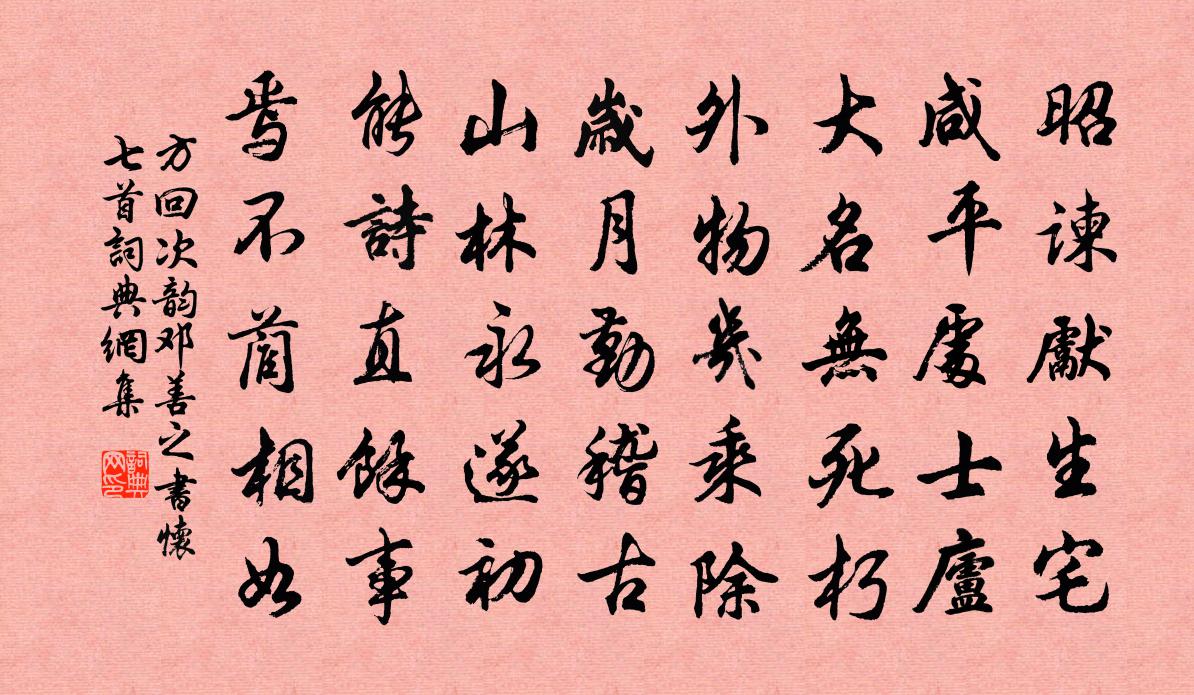 詩詞名句歷史字典書法欣賞書法字典國語詞典說文解字康熙字典古漢語字典標 題 作 者 詩 句 次韻鄧善之書懷七首作者:方回 朝代:宋代次韻鄧善之書懷七首原文昭諫先生宅,鹹平處士廬。大名無死朽,外物幾乘除。歲月勤稽古,山林永遂初。能詩直餘事,焉不藺相如。詩詞問答問:次韻鄧善之書懷七首的作者是誰?答:方回問:次韻鄧善之書懷七首寫於哪個朝代?答:宋代方回次韻鄧善之書懷七首書法欣賞次韻鄧善之書懷七首書法作品詩詞推薦山村二首楊萬里〔宋代〕一搭山村一搭奇,亦堪風物索新詩。稻花雪白糝柳絮,柘子猩紅團荔枝。行者自愁居者樂,晴時即熱雨時泥。問知序賓亭蔡襄〔宋代〕師律先憂寄,朝家此得人。門庭環劍佩,胸膽貫星辰。今已閒戎略,疇能卜宴申。樓高休暇日,台逈厭登春。珍館久擬重陽一登龍山以荒榛峭壁無容足之地欲訪吳芾〔宋代〕宦情一似秋容薄,歸興渾如酒味濃。台上望鄉何處是,夕陽影里暮山重。十蟲吟舒岳祥〔宋代〕蟲有賣油公,什伍處陰濕。長腳如蠨蛸,愛莫能助細走不及。兒童反接之,邀其吐微汗。所挾雖不多,坐此遭攟拾塗毒策禪師真贊陸游〔宋代〕塗毒不自讚,留待三山老。試問卿上人,讚好莫讚好。海中忽起劫初風,北斗柄折須彌倒。遠蒙運使度支以資政范公所寄黃素小字韓文公杜衍〔宋代〕希文健筆鈔韓文,文為首陽山下人。寧止一言旌義士。欲教萬古勸忠臣。頌聲益與英聲遠,事跡還隨墨跡新。當世虞美人(周園欲雪)舒亶〔宋代〕酒邊陡覺羅衣暖。獨倚黃昏看。寒鴉兩兩下樓東。著處暗雲垂地、一重重。紅爐歡坐誰能醉。多少看花意。謝娘也拜茶華岳〔宋代〕北宛春將半,星槎欲奏功。杵鳴千臼雪,鑰卷一旗風。盝錦鸚毛翠,簽羅象眼紅。封成拜玄鶴,飛上紫微宮。題許倅浮香亭二絕吳芾〔宋代〕一新欄檻水中央,更植疏梅向水傍。只恐花繁亭太小,黃昏無處著清香。將赴益州題小園壁蘇頲〔唐代〕歲窮惟益老,春至卻辭家。可惜東園樹,無人也作花。張通判輓詩魏了翁〔宋代〕規摹都水監,文采白雲卿。奕葉皆華貫,夫君獨屏星。滋滋熙世學,藹藹擅詩聲。耆老彫零盡,從誰正典刑。偈錢蓋〔宋代〕稽首文殊師,昔為七佛祖。嘗發大悲原,廣度諸有情。念彼東北方,是為清涼境。龍神五百俱,眷屬萬菩薩。設化與鑄鍾道者釋曇華〔宋代〕野店小橋外,黃昏欲雪時。一聲誰側耳,千古喚愚痴。哭辯端上人釋智圓〔宋代〕平昔於詩苦,精搜省未閒。壞房空鳥外,清句滿人間。瘦影懸鄰壁,孤墳接舊山。吊回高樹下,寒水自潺潺。石鼓歌韓愈〔唐代〕張生手持石鼓文,勸我試作石鼓歌。少陵無人謫仙死,才薄將奈石鼓何。周綱凌遲四海沸,宣王憤起揮天戈。大開夜坐梅堯臣〔宋代〕夜久方慮寂,空堂燈燭明。落葉有暫響,暗蟲無停聲。力學不為己,甘貧且徇名。聊為詠懷篇,還想阮步兵。丁巳再游題蓬山堂泉石楊棟〔宋代〕瓊流鑒空,混沌一隙。紫霄柱下,清泉白石。送薛大赴安陸王昌齡〔唐代〕津頭雲雨暗湘山,遷客離憂楚地顏。遙送扁舟安陸郡,天邊何處穆陵關。次馮申之游靈泉韻王灼〔宋代〕名山起高興,不惜馬首東。沙邊一著眼,翠光已浮空。踏遍桑柘村,所向漸不同。溪細山疑合,谷轉路始窮。瑩淨送處士歸州,因寄林山人劉長卿〔唐代〕陵陽不可見,獨往復如何。舊邑雲山里,扁舟來去過。鳥聲春谷靜,草色太湖多。儻宿荊溪夜,相思漁者歌。名句推薦守節自誓,親誨之學。歐陽修《畫地學書》 黃昏寒立更披襟,露浥清香悅道心。司空圖《白菊雜書四首》 財以成者,扶而埋之;後得生者,而久禁之。墨子《墨子·22章 節用(下)》 眾生必死,死必歸土:此之謂鬼。戴聖《禮記·祭義》 言必信,行必果。孔子弟子《論語·子路篇》 壯別天涯未許愁,盡將離恨付東流李大釗《口占一絕(壯別天涯未許愁)》 君是南山遺愛守,我為劍外思歸客。蘇軾《滿江紅·江漢西來》 受人之託,忠人之事馮夢龍《警世通言·卷三十四》 夢斷香消四十年,沈園柳老不吹綿。陸游《沈園二首》 斜陽獨倚西樓。遙山恰對簾鉤。晏殊《清平樂·紅箋小字》