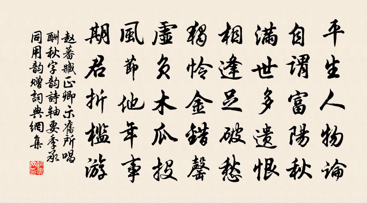 詩詞名句歷史字典書法欣賞書法字典國語詞典說文解字康熙字典古漢語字典標 題 作 者 詩 句 臧正卿示舊所唱酬秋字韻詩軸要季承同用韻贈作者:趙蕃 朝代:宋代原文平生人物論,自謂富陽秋。滿世多遺恨,相逢足破愁。獨憐金錯罄,虛負木瓜投。風節他年事,期君折檻游。詩詞問答問:《臧正卿示舊所唱酬秋字韻詩軸要季承同用韻贈》的作者是誰?答:趙蕃問:該詩寫於哪個朝代?答:宋代書法欣賞臧正卿示舊所唱酬秋字韻詩軸要季承同用韻贈書法作品詩文賞析【原題】:臧正卿示舊所唱酬秋字韻詩軸要季承同用韻贈之詩詞推薦寄題鹿伯可見一堂范成大〔宋代〕生來於君一歲長,決去愧我三年遲。今世誰不落第二,著鞭尚續堂中詩。南樓登高陳杰〔宋代〕九日陰陰怯遠遨,南樓平壓騎台豪。輕颸吹帽何妨落,囂市登山易得高。烽火太平州送酒,檄書餘暇客題糕。歸來烏夜啼(八之六)陸游〔宋代〕園館青林翠樾,衣巾細葛輕紈。好風吹散霏微雨,沙路喜新乾。小燕雙飛水際,流鶯百囀林端。投壺聲斷彈棋罷,送裴別將之安西高適〔唐代〕絕域眇難躋,悠然信馬蹄。風塵經跋涉,搖落怨暌攜。地出流沙外,天長甲子西。少年無不可,行矣莫淒淒。滿路花 贈兩山道友烏林答同監等王丹桂〔元代〕東南形勝地,極目鎖嵐煙。海山鍾異秀、產英賢。人多吉善,息念屏囂喧。是處追朋挹,探妙*真,共修物外因緣拋球樂劉禹錫〔唐代〕五色繡團圓,登君玳瑁筵。最宜紅燭下,偏稱落花前。上客如先起,應須贈一船。秋居有寄羅隱〔唐代〕端居湖岸東,生計有無中。魘處千般鬼,寒時百種風。性靈從道拙,心事奈成空。多謝金台客,何當一笑同。去郡三思方岳〔宋代〕我思老任棠,規我一本薤。薤本猶可鋤,而況此{左禾右夷}稗。拔之血人指,咄咄吁可怪。吾斯以為常,未敢以寄題杭州明慶院修廣師明碧軒王安石〔宋代〕明碧軒南竹數叢,別來江外幾秋風。道人無復人間世,嗟我今為白髮翁。念奴嬌張元乾〔宋代〕寒綃素壁,露華濃、群玉峰巒如洗。明鏡池開秋水淨,冷浸一天空翠。荷芰波生,菰蒲風動,驚起魚龍戲。山河影琅琊王歌辭佚名〔南北朝〕東山看西水,水流磐石間。公死姥更嫁,孤兒甚可憐。續小娘歌十首(選二)元好問〔金代〕其 一山無洞穴水無船,單騎驅人動數千;直使今年留得在,更教何處過明年。其 二雁雁相送過河來,人歌人哭浣溪沙(用吳叔永韻)洪咨夔〔宋代〕細雨斜風寂寞秋。黃花壓鬢替人羞。歸舟雲樹負箜篌。燕子樓寒迷楚夢,鳳皇池暖愜秦謳。暮雲凝碧可禁愁。和黃門相公詔還題石門洞(黃門,武元衡也)鄭餘慶〔唐代〕紫氛隨馬處,黃閣駐車情。嵌壑驚山勢,周灘戀水聲。地分三蜀限,關志百牢名。琬琰攀酬郢,微言鼎飪情。送邵道士彥肅還都嶠蘇軾〔宋代〕乞得紛紛擾擾身,結茅都嶠與仙鄰。少而寡慾顏常好,老不求名語益真。許邁有妻還學道,陶潛無酒亦從人。相隨神秀樓落成趙汝愚〔宋代〕魯侯作南門,春秋書不時。嗟予春暮來,復遣秋暮歸。岩岩龍固山,迢迢括蒼溪。孤城煨燼餘,棟宇煙塵飛。悠悠採桑子晏幾道〔宋代〕春風花不負年年花信,長花趁花期花。小錦堂西,紅杏初開第一枝。碧簫度曲留人醉,昨夜歸遲。短恨憑誰,鶯語代園中老人耿湋〔唐代〕傭賃難堪一老身,皤皤力役在青春。林園手種唯吾事,桃李成陰歸別人。孟秋朔日天台劉允叔和叔鄉人陳思敬餞飲錢塘汪莘〔宋代〕西湖日日可尋芳,樓上憑欄意未忘。斫取荷花三萬朵,作他貧女嫁衣裳。燕歌行曹叡〔魏晉〕白日晼晼忽西傾。霜露慘淒塗階庭。秋草卷葉摧枝莖。翩翩飛蓬常獨征。有似遊子不安寧。名句推薦去其智,絕其能,下不能意。韓非及後人《韓非子·主道》 戍鼓斷人行,邊秋一雁聲。杜甫《月夜憶舍弟》 利人乎即為,不利人乎即止。墨子《墨子·32章 非樂(上)》 滿載一船秋色,平鋪十里湖光。張孝祥《西江月·阻風山峰下》 蜀天常夜雨,江檻已朝晴。杜甫《水檻遣心二首》 廄馬散連山,軍容威絕域。李白《君子有所思行》 上有愁思婦,悲嘆有餘哀。曹植《明月上高樓》 採菊東籬下,悠然見南山。陶淵明《飲酒·其五》 奢侈足以敗家;慳吝亦足以敗家。王永彬《圍爐夜話·第五九則》 此身如傳舍,何處是吾鄉。蘇軾《臨江仙·送王緘》