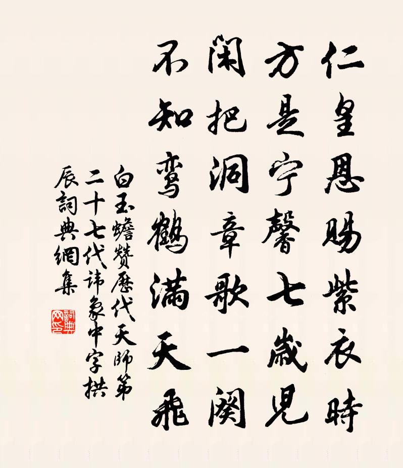 詩詞名句歷史字典書法欣賞書法字典國語詞典說文解字康熙字典古漢語字典標 題 作 者 詩 句 贊歷代天師第二十七代諱象中字拱辰作者:白玉蟾 朝代:宋代原文仁皇恩賜紫衣時,方是寧馨七歲兒。閒把洞章歌一闋,不知鸞鶴滿天飛。詩詞問答問:《贊歷代天師第二十七代諱象中字拱辰》的作者是誰?答:白玉蟾問:該詩寫於哪個朝代?答:宋代問:該詩是什麼體裁?答:七絕書法欣賞贊歷代天師第二十七代諱象中字拱辰書法作品詩詞推薦惠義寺園送辛員外杜甫〔唐代〕朱櫻此日垂朱實,郭外誰家負郭田。萬里相逢貪握手,高才卻望足離筵。句張潞〔宋代〕憂兄行不得,勸客不如歸。淨土寺追和東坡韻楊棟〔宋代〕令君督來期,書郵日旁午。世事不足論,清游乃先務。朝朝叩禪關,復此得淨字。淺斜琥珀濃,細嚼銀絲縷。味雋題堂下桃花趙蕃〔宋代〕桃花顏色曉猶深,薄暮風煙已不禁。人生抵死朱顏恃,不料青銅霜雪侵。頌古二十一首釋正覺〔宋代〕識法者懼,欺敵者亡。水中辨亂,須是鵝王。頌古一百二十一首釋宗杲〔宋代〕兩處牢關擊不通,纖塵不動自乖宗。忽然業鏡百雜碎,黃面矍曇失卻蹤。郊廟歌辭。享懿德太子廟樂章。迎神佚名〔唐代〕甲觀昭祥,畫堂升位。禮絕群後,望尊儲貳。啟誦慚德,莊丕掩粹。伊浦鳳翔,緱峰鶴至。題文發叔所藏潘子真水墨江湖八境小軸西湖復楊萬里〔宋代〕四月曾湖上,荷錢劣可穿。歸來開短紙,十里已紅蓮。倚闌陸游〔宋代〕故山未敢說歸期,十口相隨又別離。小雨初收殘照晚,闌乾西角立多時。金陵雜興二百首蘇泂〔宋代〕月樓誰伴詠黃昏,剪剪輕風陣陣寒。獨據槁梧成不寐,杏花生影小闌乾。送倉部蕭員外院長存韋應物〔唐代〕襆被蹉跎老江國,情人邂逅此相逢。不隨鴛鷺朝天去,遙想蓬萊台閣重。睡思李覯〔宋代〕俗語不入耳,旅愁還到心。坐多渾易厭,夢好欲重尋。暴雨撩蓬響,殘陽過嶺陰。回看奔競苦,此興貴南金。婢僕詩李昌符〔唐代〕春娘愛上酒家樓,不怕歸遲總不憂。推道那家娘子臥,且留教住待梳頭。不論秋菊與春花,個個能噇空腹茶。無事送少卿張學士知洪州梅堯臣〔宋代〕朱旗畫舸一百尺,五月長江水拍天。穩去先應望廬岳,暫來誰復見龍泉。閣經吏部重為記,山識吳天舊鑄錢。往跡長相思蘇頲〔唐代〕君不見天津橋下東流水,南望龍門北朝市。楊柳青青宛地垂,桃紅李白花參差。花參差,柳堪結,此時憶君心斷絕玄武湖黃度〔宋代〕玄武湖中春草生,依稀想見竹籬城。後來萬堞如雲起,方恨圖王事不成。菜花乾隆〔清代〕黃萼裳裳綠葉稠,千村欣卜榨新油。愛他生計資民用,不是閒花野草流。和西園胡季履見寄曹彥約〔宋代〕百年幾見弦三嘆,萬事相違臂一交。道合不知身隱見,詩來如見手推敲。我儀圖此藏周廟,人實云何滯楚包。無奈雨後至近村陸游〔宋代〕夜雨曉方止,朝雲猶作陰。山餘一寸碧,溪長半篙深。臥泛白鷗渚,行穿黃葉林。老農能共語,真率會人心。游東岩陳與義〔宋代〕散策東岩路,夢中曾記經。斜暉射殘雪,岩谷遍晶熒。鴉鳴山寂寂,意迥川冥冥。乘興欲窮討,會心還少停。新晴名句推薦城上高樓接大荒,海天愁思正茫茫。柳宗元《登柳州城樓寄漳汀封連四州》 烏鵲倦棲,魚龍驚起,星斗掛垂楊。陳亮《一叢花·溪堂玩月作》 採菊東籬下,悠然見南山。陶淵明《飲酒·其五》 以色事他人,能得幾時好。李白《妾薄命》 其次致曲。曲能有誠。誠則形。形則著。著則明。明則動。動則變。變則化。唯天下至誠為能化。子思《中庸·第二十三章》 昔日芙蓉花,今成斷根草。李白《妾薄命》 驅馬天雨雪,軍行入高山。杜甫《前出塞九首》 北郭清溪一帶流,紅橋風物眼中秋,綠楊城郭是揚州。王士禎《浣溪沙·紅橋》 雨過一蟬噪,飄蕭松桂秋。杜牧《題揚州禪智寺》 荷盡已無擎雨蓋,菊殘猶有傲霜枝。蘇軾《贈劉景文 / 冬景》