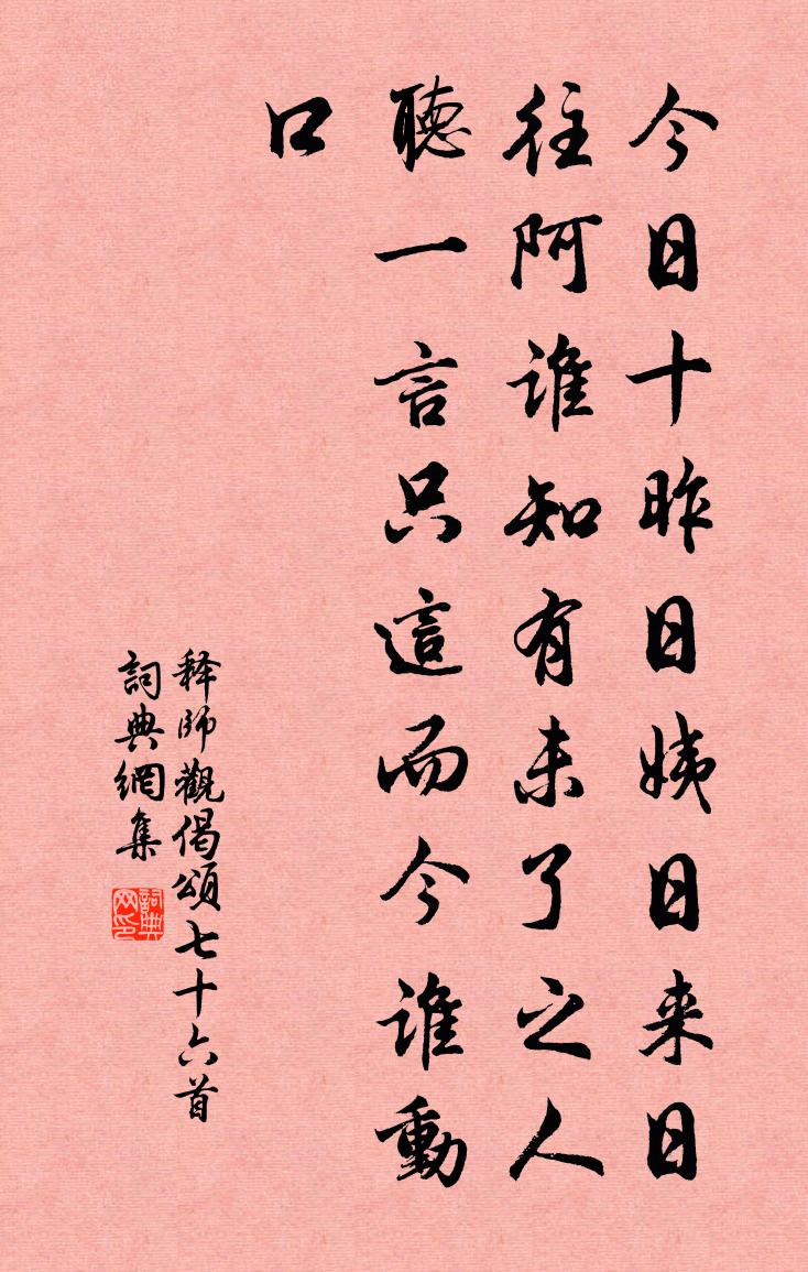 詩詞名句歷史字典書法欣賞書法字典國語詞典說文解字康熙字典古漢語字典標 題 作 者 詩 句 偈頌七十六首作者:釋師觀 朝代:宋代偈頌七十六首原文今日十,昨日姨。日來日往,阿誰知有。未了之人聽一言,只這而今誰動口。詩詞問答問:偈頌七十六首的作者是誰?答:釋師觀問:偈頌七十六首寫於哪個朝代?答:宋代釋師觀偈頌七十六首書法欣賞偈頌七十六首書法作品詩詞推薦晚秋陪崔閣老、張秘監閣老、苗…斐然酬和有愧蕪音權德輿〔唐代〕方駕游何許,仙源去似歸。縈迴留勝賞,蕭灑出塵機。泛菊賢人至,燒丹奼女飛。步虛清曉籟,隱几吸晨暉。竹徑獨青亭曾幾〔宋代〕霜落水痕風落木,翠蓋倚天惟汝獨。是誰手種百年餘,蔭此空庭一株足。歲寒不但色青青,上有垂絲下茯苓。松根成德樂王表〔唐代〕趙女乘春上畫樓,一聲歌發滿城秋。無端更唱關山曲,不是征人亦淚流。瑞鷓鴣王哲〔元代〕秋季裁量十郎。憂愁思慮動悽愴。陡改紅顏衰體瘦,漸生白髮老容光。腰曲頭低力不剛。耳聾眼暗淚汪汪。日往月擬古詩鮑照〔南北朝〕河畔草未黃。胡雁已矯翼。秋蛩挾戶吟。寒婦成夜織。去歲征人還。流傳舊相識。聞君上隴時。東望久嘆息。宿昔浣溪沙朱敦儒〔宋代〕雨濕清明香火殘。碧溪橋外燕泥寒。日長獨自倚闌乾。脫籜修篁初散綠,褪花新杏未成酸。江南春好與誰看。九日,尋臻闇黎,遂泛小舟至勤師院,二首蘇軾〔宋代〕湖上青山翠作堆,蔥蔥鬱鬱氣佳哉。笙歌叢里抽身出,雲水光中洗眼來。白足赤髭迎我笑,拒霜 * 為誰開。明年明皇楊億〔宋代〕玉牒開觀檢未封,鬥雞三百遠相從。紫雲度曲傳浮世,白石標年鑿半峰。河朔叛臣驚舞馬,渭橋遺老識真龍。蓬山讀王摩詰詩愛其散發晚未簪道書行尚把之句因陸游〔宋代〕二十游名場,最號才智下。蹭蹬六十年,亦有茆一把。典衣租黃犢,乘雨耕綠野,西成得一飽,敢計泥沒踝。住久上所知張蠙〔唐代〕初向眾中留姓氏,敢期言下致時名。而今馬亦知人意,每到門前不肯行。秋山圖王冕〔元代〕前年放船九江口,秋風獵獵吹蒲柳。買魚沽酒待月明,不知江上青山走。三更吹笛欲喚人,□□白露依衣巾。故鄉秋風陸游〔宋代〕秋風吹客檣,節物嘆遐方。歲事忽雲暮,吾行殊未央。霜清漢水綠,日落楚山蒼。此去三巴路,無猿亦斷腸。句程師孟〔宋代〕城裡人家半讀書,學校未嘗虛里巷。僧院小泉井方乾〔唐代〕亦恐淺深同禹穴,兼雲制度象污樽。窺尋未見泉來路,緬想應穿石裂痕。片段似冰猶可把,澄清如鏡不曾昏。欲知紹興祭風師六首佚名〔宋代〕神哉沛矣,厥靈載揚。揚靈如何,剡剡皇皇。我其承之,繩繩齊莊。往從地人,爰俠斯芳。孝宗皇帝輓詞五首陳傅良〔宋代〕群才何輻輳,聖度似天寬。清蹕留儒館,黃金散將壇。風雲一語合,日月萬人看。攀附今無路,哀摧壯士肝。次韻寄謝楊制機項安世〔宋代〕把卷愴然不自勝,古來離合豈人能。未應鬻髢尤窮髮,暫喜餐蔬得枕肱。身逐南雲親色養,夢尋巴瘴隔心朋。囊中郴江百詠並序西湖阮閱〔宋代〕岸草江花對夕陽,滿船新月夜鳴榔。秋清菡萏紅千柄,風靜琉璃碧一方。下程趙汝鐩〔宋代〕下程疑頗早,店主勸予休。今晚莫貪路,明朝便到州。疏籬編馬眼,新筍護貓頭。六七歲童子,一人隨數牛。燕許介軒〔宋代〕柳影芹香二月春,一巢才定即棲身。不應它處無華屋,自是難忘舊主人。名句推薦兩水夾明鏡,雙橋落彩虹。李白《秋登宣城謝朓北樓》 吳姬越艷楚王妃,爭弄蓮舟水濕衣。王昌齡《採蓮曲二首》 嶺南能有幾多花,寒食臨之掃春跡。鄭剛中《寒食》 羅幕輕寒,燕子雙飛去。晏殊《蝶戀花·檻菊愁煙蘭泣露》 生則盡力,死則死耳!張廷玉《明史·列傳·卷二十》 惟天地萬物父母,惟人萬物之靈。佚名《尚書·周書·泰誓》 溪上桃花無數,花上有黃鸝。黃庭堅《水調歌頭·遊覽》 泰山嵯峨夏雲在,疑是白波漲東海。李白《早秋單父南樓酬竇公衡》 晚來天欲雪,能飲一杯無?白居易《問劉十九》 升堂坐階新雨足,芭蕉葉大梔子肥。韓愈《山石》