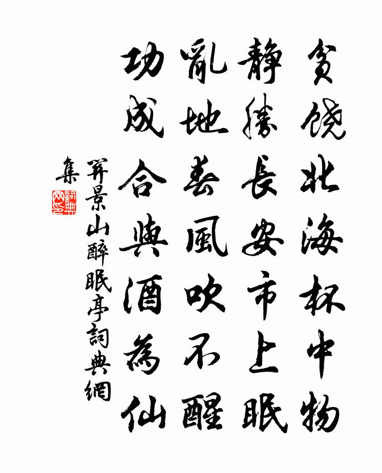 詩詞名句歷史字典書法欣賞書法字典國語詞典說文解字康熙字典古漢語字典標 題 作 者 詩 句 醉眠亭作者:關景山 朝代:宋代醉眠亭原文貧饒北海杯中物,靜勝長安市上眠。亂地春風吹不醒,功成合與酒為仙。詩詞問答問:醉眠亭的作者是誰?答:關景山問:醉眠亭寫於哪個朝代?答:宋代關景山醉眠亭書法欣賞醉眠亭書法作品詩詞推薦竹源之集奇仲不赴蕭屯以詩嘲之再用原韻劉子翬〔宋代〕平生花老子興,花渾奇幽絕花處。寧嫌一坡遠,甘作十歇去。至今清夢狂,時走松陰路。心忻自吟喔,技療輒披露比與成父別謂先行矣及再至溧陽則猶未也留數趙蕃〔宋代〕碧雲散舒,合且復離。皓月涌照,圓而不虧。破陣子(硤石道中有懷吳子似縣慰)辛棄疾〔宋代〕宿麥畦中雉鷕,柔桑陌上蠶生。騎火須防花月暗,玉唾長攜彩筆行。隔牆人笑聲。莫說弓刀事業,依然詩酒功名。禮湘山佛和別駕叔韻李曾伯〔宋代〕自得湘南一派奇,禪舂元熟不須師。幾千億化如來相,五百年將再出時。翠壁雲連秋樹老,寶坊香靜午齋遲。我來次韻何茂恭詠玉簪三絕喻良能〔宋代〕月露洗沐秋容淨,姑山初逢冰雪仙。風流水部與藻飾,從此梅花應並傳。於潛女蘇軾〔宋代〕青裙縞袂於潛女,兩足如霜不穿屨。奢沙鬢髮絲穿檸,蓬沓障前走風雨。老濞宮妝傳父祖,至今遺民悲故主。苕頌古十九首釋法全〔宋代〕東司上不說佛法,喚來與伊劈面踏。不用重論報佛恩,將此深心奉塵剎。郭郎兒慢王哲〔元代〕日放銀霞,甘雨滴成珠露。昭清風、氣神同助。便致令、相守鎮相隨,更寶種三田,九轉靈丹聚。碧虛前,遍生玉句張鎡〔宋代〕已信此心安此命。寄蔣先輩在蘇州黃滔〔唐代〕夫差宮苑悉蒼苔,攜客朝游夜未回。冢上題詩蘇小見,江頭酹酒伍員來。秋風急處煙花落,明月中時水寺開。千載寄崔萬芳夔皎然〔唐代〕氣殺高隼擊,惜芳步寒林。風搖蒼琅根,霜剪荍艹遙心。歸思忽眇眇,佳氣亦沉沉。我身豈遐遠,如隔湘漢深。事和王才臣楊萬里〔宋代〕新詩不但不饒儂,便恐除何立下風。每與勝談千古事。不知推拔盡爐紅。生兒底巧翁何恨,得子銷愁我未窮。剩欲秋露王安石〔宋代〕日月凋何急,荒庭露送秋。初疑宿雨泫,稍怪曉霜稠。曠野將馳獵,華堂已御裘。空令半夜鶴,抱此一端愁。題三教三隱三仙三賢畫軸釋善珍〔宋代〕瞿曇李耳東家丘,不生虞夏生衰周。世亂殺奪無時休,佛現身作大慈舟。老務靜治銷戈矛,孔以筆誅著春秋。學佛題出山相釋祖珠〔宋代〕半夜逾城往雪山,龍樓鳳閣絕躋攀。如今輥出草窠里,一個閒人天地間。吊湘纍史彌寧〔宋代〕莫訝靈均苦費詞,騷章炳炳日星垂,身雖楚澤有遺恨,名與湘流無盡期。一笑底關漁父事,此心惟有洛陽知。是非梅釋行海〔宋代〕玉門關外雜塵埃,白帝城邊對酒杯。今日孤山尤可惜,已無和靖在時梅。艾軒先生侍郎輓詞四首林亦之〔宋代〕菖蒲對客尚從容,明月紅泉夢已空。縱是千年有豪傑,六經人物只斯翁。重玄寺元達年逾八十好種名藥凡所…余奇而訪之因題二章皮日休〔唐代〕雨滌煙鋤傴僂齎,紺牙紅甲兩三畦。藥名卻笑桐君少,年紀翻嫌竹祖低。白石靜敲蒸朮火,清泉閒洗種花泥。怪來兩同心朱彝尊〔清代〕認丹鞋響,下畫樓遲。犀梳掠倩人猶未,螺黛淺,俟我乎而。看不足,一日千回,眼轉迷離。比肩縱得相隨,夢雨名句推薦人情已厭南中苦,鴻雁那從北地來。王勃《蜀中九日 / 九日登高》 掩淚空相向,風塵何處期盧綸《李端公/送李端》 不系雕鞍門前柳,玉容寂寞見花羞,冷風兒吹雨黃昏後。喬吉《春閨怨·不系雕鞍門前柳》 鄉書不可寄,秋雁又南回。韋莊《章台夜思》 不肯畫堂朱戶,春風自在楊花。王安國《清平樂·春晚》 刷羽同搖漾,一舉還故鄉。沈約《詠湖中雁》 知有兒童挑促織,夜深籬落一燈明。葉紹翁《夜書所見》 更待菊黃家醞熟,共君一醉一陶然。白居易《與夢得沽酒閒飲且約後期》 富潤屋,德潤身,心廣體胖曾子《禮記·大學》 關關雎鳩,在河之洲。窈窕淑女,君子好逑。佚名《關雎》