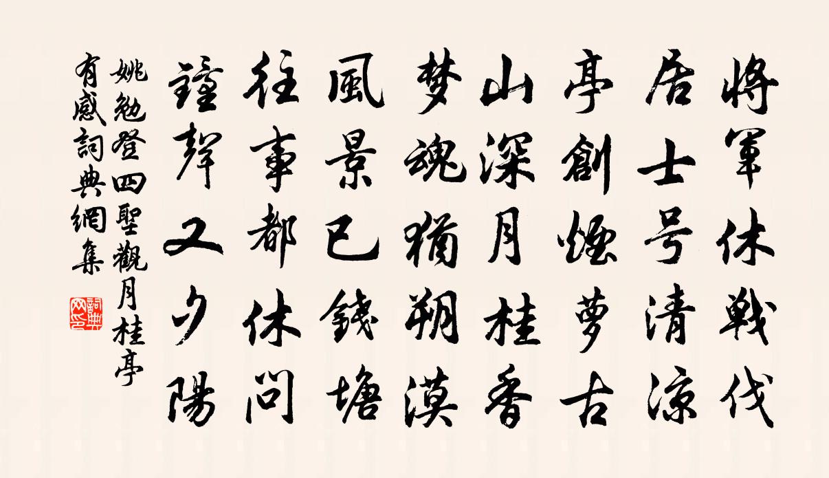 詩詞名句歷史字典書法欣賞書法字典國語詞典說文解字康熙字典古漢語字典標 題 作 者 詩 句 登四聖觀月桂亭有感作者:姚勉 朝代:宋代登四聖觀月桂亭有感原文將軍休戰伐,居士號清涼。亭創煙蘿古,山深月桂香。夢魂猶朔漠,風景已錢塘。往事都休問,鐘聲又夕陽。詩詞問答問:登四聖觀月桂亭有感的作者是誰?答:姚勉問:登四聖觀月桂亭有感寫於哪個朝代?答:宋代姚勉登四聖觀月桂亭有感書法欣賞登四聖觀月桂亭有感書法作品詩詞推薦游黃山寺葛起文〔宋代〕偶為尋幽出,扶筇亦懶拈。鸛巢依古塔,燕語入虛欄。筆下詩初就,樽中酒屢添。此游堪喜膝,上一去掀髯。黃祊小店野飯示子坦子聿陸游〔宋代〕山林久衰病,生世幾清明?未作松根臥,猶尋溪上行。食新炊麥飯,嘗饁啜蓴羹。孺子雖知學,家貧且力耕。入道詩十九首王慶升〔宋代〕乾坤大象一陰陽,離坎精華日月光。不取盈虛訊息候,若非聾瞽必為狂。秋日田家雜詠黃燮清〔清代〕西風 * 月,積地秋雲黃。力田已告成,計日宜收藏。刈獲須及時,慮為雨雪傷。農家終歲勞,至此願稍償。勤苦憶梅陸游〔宋代〕護惜常愁滿樹開,況無一片在蒼苔。眼高嬾為凡花醉,腸斷驚聞暮角哀。寫向素綃時拂拭,移來幽圃自栽培。論心贈何著作王洋〔宋代〕淨名梵行宰官身,跡似空花意自真。豈為世間吳伎倆,正緣物外長精神。窗橫午榻籧篨靜,日上朝盤苜蓿新。誰與春光好·天初暖歐陽炯〔唐代〕天初暖,日初長,好春光。萬匯此時皆得意,競芬芳。筍迸苔錢嫩綠,花偎雪塢濃香。誰把金絲裁剪卻,掛斜陽?送杜士瞻楚州覲省李嘉祐〔唐代〕風流與才思,俱似晉時人。淮月歸心促,江花入興新。雲深滄海暮,柳暗白田春。共道官猶小,憐君孝養親。唐昌觀玉蕊花王建〔唐代〕一樹籠:玉刻成,飄廊點地色輕輕。女冠夜覓香來處,唯見階前碎月明。秋夜登西樓黃庚〔宋代〕清碧金英玉露溥,姮娥深夜不禁寒。桂花香裹人敲句,倚遍高樓十二闌。贈杜容成吳均〔南北朝〕一燕海上來,一燕高堂息。一朝相逢遇,依然舊相識。問我來何遲,山川幾紆直。答言海路長,風駛飛無力。昔別次程右史韻送僧南遊問果佛日史堯弼〔宋代〕問訊風顛妙喜師,天真海北看孤飛。如何指是無還地,卻作梅州萬里歸。游山上一道觀三佛寺周敦頤〔宋代〕琳宮金剎接林巒,一徑潛通竹樹寒。是處塵埃皆可息,時清終未忍辭官。睡覺作陸游〔宋代〕邯鄲夢事豈關身?未熟黃粱跡已陳。輸與烏衣老鈴下,日中睡覺一顰伸。春意漸深送客至山麓田舍來往道中復逢法上人釋正覺〔宋代〕鳥拳花枝作春語,風日煥然晞宿雨。水肥山翠木欣欣,芳事駢羅不容數。風光草際浮陳璀〔唐代〕春風泛搖草,旭日遍神州。已向花間積,還來葉上浮。曉光緣圃麗,芳氣滿街流。澹蕩依朱萼,颻颺帶玉溝。向空贊三十六祖頌釋印肅〔宋代〕大士彌遮迦,憶昔阿私陀。邪正通一道,無法不調和。鄜台杜純佑〔宋代〕兩載低眉著小冠,一台高築地平寬。向陽花木齊教放,天下無春似此間。【中呂】山坡羊_人生於世,張養浩〔元代〕人生於世,休行非義,謾過人也謾不過天公意。便儹些東西,得些衣食,他時終作兒孫累,本分世間為第一。休使和張中大王洋〔宋代〕憶昔開元夜宴圖,錦為方丈玉為壺。但夸北里樓吹笛,誰問長安米勝珠。事去牽連難雪恥,愁來陪奉長霜須。兔園名句推薦後不乏人,榮之方久,賢者自苦亦惠嗣。來俊臣《羅織經·固榮卷第六》 眼見的吹翻了這家,吹傷了那家,只吹的水盡鵝飛罷!王磐《朝天子·詠喇叭》 松花釀酒,春水煎茶。張可久《人月圓·山中書事》 不厚其棟,不能任重。重莫如國,棟莫如德。左丘明《國語·魯語·子叔聲伯辭邑》 責人勿厲,小惠或有大得。來俊臣《羅織經·保身卷第七》 萬樹寒無色,南枝獨有花。道源《早梅》 騮馬新跨白玉鞍,戰罷沙場月色寒。王昌齡《出塞二首》 綠葉青跗映丹萼,與君裴回上金閣。王勃《落花落》 凡令之行也,必待近者之勝也,而令乃行。管仲《管子·重令》 空山梵唄靜,水月影俱沉。納蘭性德《水調歌頭·題西山秋爽圖》