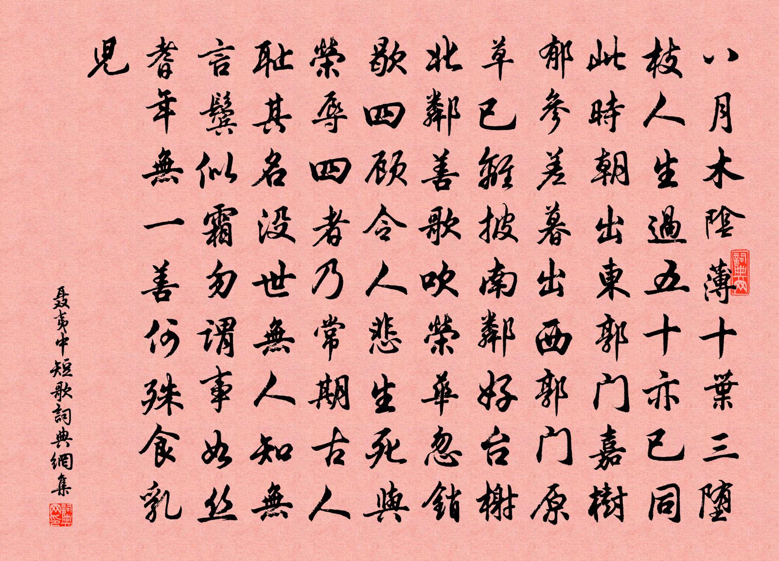 詩詞名句歷史字典書法欣賞書法字典國語詞典說文解字康熙字典古漢語字典標 題 作 者 詩 句 短歌作者:聶夷中 朝代:唐代短歌原文八月木陰薄,十葉三墮枝。人生過五十,亦已同此時。朝出東郭門,嘉樹郁參差。暮出西郭門,原草已離披。南鄰好台榭,北鄰善歌吹。榮華忽銷歇,四顧令人悲。生死與榮辱,四者乃常期。古人恥其名,沒世無人知。無言鬢似霜,勿謂事如絲。耆年無一善,何殊食乳兒。詩詞問答問:短歌的作者是誰?答:聶夷中問:短歌寫於哪個朝代?答:唐代問:短歌是什麼體裁?答:五古聶夷中短歌書法欣賞短歌書法作品注釋全唐詩:卷636-13詩詞推薦感懷方岳〔宋代〕獨擅松風一壑哀,竹門雖設為誰開。宦情已矣隨流去,老色蒼然上面來。已慣山居無曆日,不知人世有公台。天生瓦盆歌王哲〔元代〕你敲著得恁響聲大。無祥瑞,沒災禍。元誰知得那。外唇有口能發課。內虛有腹成因果。貴賤賢愚,細思量、人人移家入新宅白居易〔唐代〕移家入新宅,罷郡有餘資。既可避燥濕,復免憂寒飢。疾平未還假,官閒得分司。幸有祿俸在,而無職役羈。清旦梅花山茶范成大〔宋代〕月淡玉逾瘦,雪深紅欲燃。同時不同調,聊用慰衰年。木蘭花令黃庭堅〔宋代〕庾郎三九常安樂。使有萬錢無處著。徐熙小鴨水邊花,明月清風都占卻。朱顏老盡心如昨。萬事休休休莫莫。樽前晚春韓維〔宋代〕春暉東去月如弦,卻拂凝埃敞北軒。幾曲雲屏空白晝,一簾花雨自黃昏。庭蕪碧合陰蟲息,窗樹紅稀斗雀喧。細憶山中對雪有作杜荀鶴〔唐代〕一渾乾坤萬象收,唯應不壅大江流。虎狼遇獵難藏跡,松柏因風易舉頭。玉帳英雄攜妓賞,山村鳥雀共民愁。豈堪木蘭花慢 次韻答張直卿見寄劉敏中〔元代〕兩城無百里,算只是、一家鄉。愧每每相看,來迎去送,水影山光。殷勤舉杯一笑,要都收、百福與千祥。鏡里吾答法椿長老口占陳著〔宋代〕床前何必問云何,霜頂誰將手自磨。可是法身真有病,皺眉頭處為人多。贊北磵和尚釋心月〔宋代〕調古風高,神清氣逸。聞一唯升素王之堂,見微笑入空王之室。恢恢綽綽兮以一而貫萬,寂寂寥寥兮會萬而歸一。送王仲彝制機宰瀏陽戴復古〔宋代〕一身供世用,六月赴官忙。當此炎天熱,知君心地涼。吏能師卓魯,縣界接瀟湘。試飲瀏陽水,清清滋味長。山中雜興 十一王冕〔元代〕細注歸田錄,重修種樹書。自知身是客,不嘆食無魚。石屋春雲重,紫床夜月虛。蕭條空四壁,誰問馬相如?句陳曄〔宋代〕古驛森慈行,蓮城挺義松。題謝昌國桂山堂楊萬里〔宋代〕艮齋印袖出名光,歸臥西江一草堂。種滿山中渾是桂,怪來月窟更無香。九秋金粟供朝飯,三徑黃花並夕糧。履上八月十五夜月二首曾幾〔宋代〕雲日晶熒固自佳,幽人有待至昏鴉。遠分岩際松楓樹,復亂洲前蘆荻花。曳履商聲憐此老,倚樓長笛問誰家。霜螯寄東蜀幕中友李洞〔唐代〕官亭池碧海榴殷,遙想清才倚畫欄。柳絮漲天籠地暖,角聲經雨透雲寒。曉侵台座香菸濕,夜草軍書蠟炬乾。為話落花短吟邵雍〔宋代〕滿園桃李正離披,更被狂風作意吹。長是憂愁初謝處,卻須思念未開時。奈何紅艷易消歇,不似青陰少改移。九十送朱職方赴天彭蘇頌〔宋代〕曉鼓頻趨宣政朝,左符還領郡封遙。三春車馬逾邛阪,千里帷裳布漢條。蚤接朋僚情款款,舊傳詞筆氣飄飄。西南至鄂期年以饟事不給於詩己亥夏五廿有八日始岳珂〔宋代〕離歌已盡沙頭玉,夕照初翻浪底金。自是晴鷗無六月,半江雪片涌波心。南遊過湘漢即事寄友人李頻〔唐代〕南去遠驅逐,三湘五月行。巴山雪水下,楚澤火雲生。向野聊中飯,乘涼探暮程。離懷不可說,已迫峽猿聲。名句推薦回雁峰前路,煙樹正蒼蒼葛長庚《水調歌頭·江上春山遠》 寶奩明月不欺人,明日歸來君試看。嚴仁《玉樓春·春思》 一江煙水照晴嵐,兩岸人家接畫檐,芰荷叢一段秋光淡張養浩《水仙子·詠江南》 言吾善者,不足為喜;道吾惡者,不足為怒。馮夢龍《警世通言·卷四》 關山多雨雪,風水損毛衣。李遠《詠雁》 數叢沙草群鷗散,萬頃江田一鷺飛。溫庭筠《利州南渡》 丞相祠堂何處尋,錦官城外柏森森。杜甫《蜀相》 黃鶯也愛新涼好,飛過青山影里啼。徐璣《新涼》 雁過孤峰曉,猿啼一樹霜。賈島《送天台僧》 跬步不休,跛鱉千里;累積不輟,可成丘阜。劉安及其門客《淮南子·說林訓》