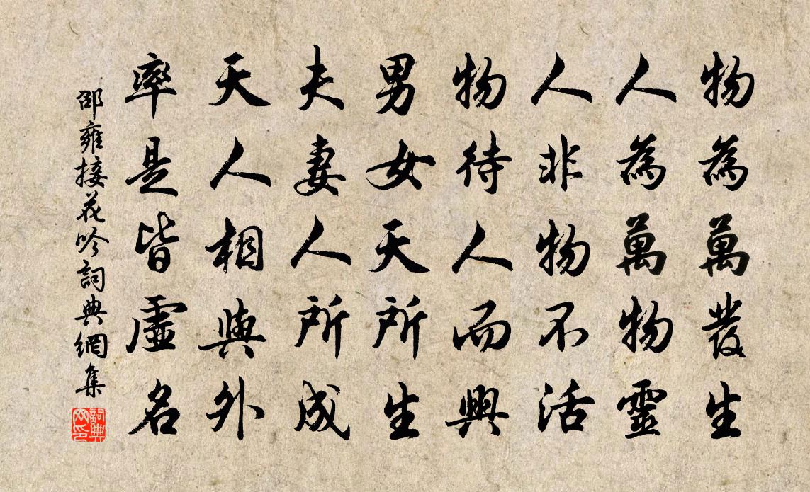 詩詞名句歷史字典書法欣賞書法字典國語詞典說文解字康熙字典古漢語字典標 題 作 者 詩 句 接花吟作者:邵雍 朝代:宋代接花吟原文物為萬發生,人為萬物靈。人非物不活,物待人而興。男女天所生,夫妻人所成。天人相與外,率是皆虛名。詩詞問答問:接花吟的作者是誰?答:邵雍問:接花吟寫於哪個朝代?答:宋代邵雍接花吟書法欣賞接花吟書法作品詩詞推薦題桃源黃炏〔宋代〕本自深村老圃來,偶分符竹到天台。漫山幸可容桃李,莫待劉郎去後栽。和竇又勇秋日見訪阻雨見贈王之道〔宋代〕風雨蕭蕭暮不休,頓添寒色送窮秋。已荒深院菊猶在,欲去短亭人強留。千里書遲空噪鵲,四鄰砧亂混鳴鳩。相逢送游堯臣歸閩六首王炎〔宋代〕宦遊適四方,僚友兄及弟。所惡薰有酒,氣味不相似。黃鵠來自南,挽首啄禾黍。意欲摩雲霄,石交予與汝。雞鶩次韻虞萬州見寄除夕江村餞臘二首魏了翁〔宋代〕處士西城落照邊,春風吹袂意泠然。閒中受用封千戶,聖處功夫祿九遷。竹外緩觴留急景,沙頭飽飯看豐年。詩來同族侄評事黯游昌禪師山池其一李白〔唐代〕遠公愛康樂,為我開禪關。蕭然松石下,何異清涼山。花將色不染,水與心俱閒。一坐度小劫,觀空天地間。頌古五首釋慧光〔宋代〕偷吃油糍,賣弄口觜。年老成魔,謾神嚇鬼。和陳君儀讀太真外傳五首黃庭堅〔宋代〕扶風喬木夏陰合,斜谷鈴聲秋夜深。人到愁來無處會,不關情處總傷心。出金陵卻寄蔣山元師鄭獬〔宋代〕不及林間紅鶴群,飛泉卻得夜深聞。風帆又絕秦淮去,回望北山空白雲。和三十郎蠟梅韻曹彥約〔宋代〕官黃新賜極恩榮。花不同梅與共名。頗謂寒中宜作伴,想因開早更為兄。世間何物疑真蠟,海上新來染碎瓊。體得點絳唇(社日雨)王之道〔宋代〕春意催花,片雲又作朝來雨。淡勻深注。紅紫紛無數。社日人家,準擬行春去。痴兒女。倚門凝佇。借問東郊路。詠宗統羅禧〔宋代〕豫章譜系派流長,積德貽謀百世昌。子孝臣忠昭史冊,人文士義著名邦。根源有自支流盛,辭賦無窮翰墨香。一閱過女兒浦趙蕃〔宋代〕青山峨峨聳髻鬟,流水瑟瑟鳴佩環。朝雲暮雨在何許,秋月春風空自閒。予今老矣鬢且斑,行役殆遍江之南。舊遊白杜鵑王鎡〔宋代〕雪玉層層映翠微,蜀王心事此花知。染紅不到枝頭上,想是啼鵑血盡時。采菱歌鮑照〔南北朝〕騖舲馳桂浦。息棹偃椒潭。簫弄澄湘北。菱歌清漢南。送程給事知越州邵亢〔宋代〕澄江渺渺豫章樓,曾是雙旌再歲留。五馬解鞍方北上,萬艘蜚粟又南遊。說棠重到清陰在,埋劍將磨異氣滄。求得列仙文清虛真人孟郊〔唐代〕欻駕空清虛,徘徊西華館。瓊輪暨晨抄, * 逐煙散。惠風振丹旌,明燭朗八煥。解襟墉房內,神鈴鳴璀璨。棲景剡溪道中五首韓元吉〔宋代〕戴家家住此溪頭,買酒尋春得勝游。夾岸楊花渾似雪,不應興盡便回舟。別耿都尉高適〔唐代〕四十能學劍,時人無此心。如何耿夫子,感激投知音。翩翩白馬來,二月青草深。別易小千里,興酣傾百金。第二清明日宴梅道士房孟浩然〔唐代〕林臥愁春盡,開軒覽物華。忽逢青鳥使,邀入赤松家。丹灶初開火,仙桃正發花。童顏若可駐,何惜醉流霞!四威儀釋慧空〔宋代〕住,五合黃陳半瓢醋。見客來,般般皆要做。名句推薦烽火連三月,家書抵萬金。杜甫《春望》 綠竹入幽徑,青蘿拂行衣。李白《下終南山過斛斯山人宿置酒》 凡與敵戰,必須料敵詳審而後出兵。佚名《百戰奇略·第五卷·輕戰》 絳雪生涼,碧霞籠夜,小立中庭蕪地。吳文英《拜星月慢·林鐘羽姜石帚以盆蓮數十置中庭宴客其中》 柳暝河橋,鶯晴台苑,短策頻惹春香。吳文英《夜合花·自鶴江入京泊葑門外有感》 親所好,力為具。親所惡,謹為去。李毓秀《弟子規·入則孝》 木從繩則正,後從諫則聖。佚名《尚書·商書·說命上》 斬草除根,萌芽不發馮夢龍《警世通言·卷三十七》 春草如有情,山中尚含綠李白《金門答蘇秀才》 言而當、知也;默而當,亦知也荀子《荀子·非十二子》