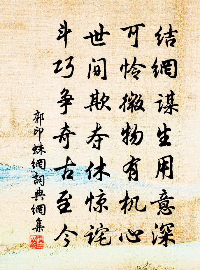 詩詞名句歷史字典書法欣賞書法字典國語詞典說文解字康熙字典古漢語字典標 題 作 者 詩 句 蛛網作者:郭印 朝代:宋代蛛網原文結網謀生用意深,可憐微物有機心。世間欺奪休驚詫,鬥巧爭奇古至今。詩詞問答問:蛛網的作者是誰?答:郭印問:蛛網寫於哪個朝代?答:宋代郭印蛛網書法欣賞蛛網書法作品詩詞推薦久雨新霽蚤過松竹道院復以雨歸因用汪彥章一楊冠卿〔宋代〕一春略無十日晴,灶前濈濈蛙黽生。晨興登視雲霽平,攬衣出門聊意行。東風吹拂酒面醒,花光掠我雙眼明。舉頭以虎臂杖送李任道二首黃庭堅〔宋代〕未衰筋力先扶杖,能救衰年十二三。八百老彭嗟杖晚,可憐矍鑠馬征南。甘寢陳宓〔宋代〕甘寢不易得,何人不貪睡。所以八尺床,惟賢始無愧。萬鍾固可樂,中夜或興喟。誰謂顏巷貧,至寶賞所萃。仲春八日自成都起程度劍閣程公許〔宋代〕蕭寺深居稱,春深殊未知。偶然成遠役,猶幸及芳時。麥流含風軟,花光眩日遲。客行無復恨,隨處可尋詩。十離詩。魚離池薛濤〔唐代〕跳躍深池四五秋,常搖朱尾弄綸鉤。無端擺斷芙蓉朵,不得清波更一游。出自薊北門行李白〔唐代〕虜陣橫北荒,胡星耀精芒。羽書速驚電,烽火晝連光。虎竹救邊急,戎車森已行。明主不安席,按劍心飛揚。推轂螢釋智圓〔宋代〕微蟲稟質有清光,蹤跡難令暗室藏。車胤死來人墮學,秋庭終夜恣飛翔。久雨文同〔宋代〕寒鳩劬劬屋上鳴,欲使此雨何時晴。山中有客抱幽郁,日日起望東方明。今朝晚霞發光焰,喜極再拜當西楹。須臾子陵釣台吳龍翰〔宋代〕峭壁千尋屹曉寒,何年人插釣魚竿。煙霞不受衣冠涴,天地那如蓑笠寬。幸有同肩黃屋貴,不妨伸腳白雲端。能令道傍小憩觀物化楊萬里〔宋代〕蝴蝶新生未解飛,須拳粉濕睡花枝。後來借得風光力,不記如痴似醉時。悟人一言邵雍〔宋代〕百慮謀猶拙,一言迷自開。世間無大事,天下有雄才。唯恐人難得,寧憂道未恢。忌心都去盡,何復病塵埃。與林大夫謝靈壽杖朱翌〔宋代〕萬木山中美木成,古今靈壽得嘉名。龍鱗未到他年化,蝸角先從每節生。禪擬問來須便打,醉思吟後不妨行。使郡正宮 端正好王實甫〔元代〕碧雲天,黃花地,西風緊,北雁南飛。曉來誰染霜林醉?總是離人淚。【雙調】湘妃曲邵元長〔元代〕贈鍾繼先高山流水少人知,幾擬的十鑄子期。繼光賢既解其中意。恨相逢何太遲,示佳編古怪新奇。想達士無地事歌南昌老翁〔宋代〕藍采禾,藍采禾,塵世紛紛事更多。爭如賣藥沽酒飲,歸去深崖拍手歌。龍塘久別乘月再到奉呈同社一首王阮〔宋代〕龍塘疇昔擅雲煙,破月重來倍爽然。浮玉北堂三萬頃,扁舟西子二千年。青山識面爭迎櫂,白鷺知心不避船。華發緱山廟許渾〔唐代〕王子 * 月滿台,玉簫清轉鶴裴回。曲終飛去不知處,山下碧桃春自開。挽劉學諭玗廖行之〔宋代〕學富猶無已,才雄非自成。誨人真不倦,接物有餘情。僅有摳衣便,俄驚逝水傾。丹旌嗟莫挽,忍聽薤歌聲。賞梅感興白玉蟾〔宋代〕千樹梅花明如月,一天月華皎如雪。幽人心似梅花清,梅花亦作如是說。銀色世界生梅花,水晶宮中明月華。醉臥三橋旅邸遇雪方回〔宋代〕醞雲蒸霧暖如烘,一夜南風變北風。不似尋常響窗紙,漸驚分寸壓船蓬。粉妝已斗佳人白,酒面還輸老子紅。記取名句推薦接葉巢鶯,平波卷絮,斷橋斜日歸船。張炎《高陽台·西湖春感》 勸君更盡一杯酒,西出陽關無故人。王維《渭城曲 / 送元二使安西》 世界微塵里,吾寧愛與憎。李商隱《北青蘿》 冰,水為之,而寒於水。荀子《勸學》 相思了無益,悔當初相見。朱彝尊《憶少年·飛花時節》 秋風吹不盡,總是玉關情。李白《子夜吳歌·秋歌》 松竹含新秋,軒窗有餘清。崔元翰《奉和聖制中元日題奉敬寺》 千呼萬喚始出來,猶抱琵琶半遮面。白居易《琵琶行 / 琵琶引》 量入以為出戴聖《禮記·王制》 二人同心,其利斷金。同心之言,其臭如蘭。佚名《易傳·繫辭傳上·第八章》