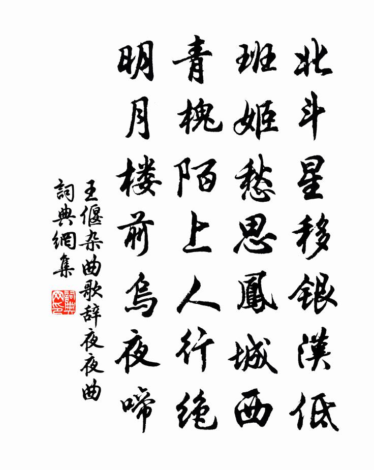詩詞名句歷史字典書法欣賞書法字典國語詞典說文解字康熙字典古漢語字典標 題 作 者 詩 句 雜曲歌辭。夜夜曲作者:王偃 朝代:唐代雜曲歌辭。夜夜曲原文北斗星移銀漢低,班姬愁思鳳城西。青槐陌上人行絕,明月樓前烏夜啼。詩詞問答問:雜曲歌辭。夜夜曲的作者是誰?答:王偃問:雜曲歌辭。夜夜曲寫於哪個朝代?答:唐代問:雜曲歌辭。夜夜曲是什麼體裁?答:樂府王偃雜曲歌辭。夜夜曲書法欣賞雜曲歌辭。夜夜曲書法作品注釋全唐詩:卷26_78詩詞推薦滿路花/促拍滿路花陳允平〔宋代〕離歌泣斷雲,別舞愁飛雪。鳳皇台上望,瓊簫絕。釵分玉燕,寸寸迴腸折。碧空歸雁闊。猶有疏梅,歲寒獨伴高節和謝安國韻王炎〔宋代〕虎豹嗔人上九關,不妨拄笏看雲山。家聲元是封胡後,人物還如晉宋間。解組聞公真有意,折腰顧我亦可顏。故園感舊許琮〔宋代〕捲簾新月在簾鉤,花氣同風過小樓。為憶昨宵燈下事,不將紅燭照梳頭。顧渚行寄裴方舟皎然〔唐代〕我有雲泉鄰渚山,山中茶事頗相關。鶗鴂鳴時芳草死,山家漸欲收茶子。伯勞飛日芳草滋,山僧又是採茶時。由來空明洞王珏〔宋代〕瑤草琪花半已空,洞門寂寂自春風。千秋只鶴無時返,安得蓬萊有路通。南柯子/南歌子佚名〔宋代〕積雪迷松逕,圍爐掩竹扉。床頭一味有蹲鴟。軟火深開香熟、已多時。自得陶朱法,休教懶瓚知。浪傳黃獨正甘肥上蘇子瞻釋仲淵〔宋代〕文章落落昌黎老,風物蕭蕭李謫仙。二子本來為獨擅,使君才力已雙全。郡南亭子宴(一作春宴)張謂〔唐代〕亭子春城外,朱門向綠林。柳枝經雨重,松色帶煙深。漉酒迎山客,穿池集水禽。白雲常在眼,聊足慰人心。人月圓 春夜梁寅〔元代〕三春月勝三秋月,花下惜清陰。錦圍繡陣,香生革履,光動蘭襟。棠梨枝顫,乍驚棲鵲,夜久寒侵。明朝風雨,休寄鶴山魏侍郎陳宓〔宋代〕濂洛遺音喜復鳴,未由會面只心傾。平生格物工夫到,好惡真如月樣明。次韻文潛同游王舍人園黃庭堅〔宋代〕移竹淇園下,買花洛水陽。風煙二十年,花竹可迷藏。九衢流車馬,相值各匆忙。豈有道邊宅,靜居如寶坊。幅巾題壺蕭澥〔宋代〕望斷碧雲無白衣,一春長是獨醒時。煩君捲舌東風裡,休勸飢人食肉糜。訴衷情晏殊〔宋代〕露蓮雙臉遠山眉。偏與淡妝宜。小庭簾幕春晚,閒共柳絲垂。人別後,月圓時。信遲遲。心心念念,說盡無憑,只元夕端居感事四絕句張舜民〔宋代〕十二門開如沸羹,燈光月色逐人行。春城無處無歌舞,一曲未終天又明。風井周惠〔宋代〕寰中風穴不一處,斯井乳化能伏流。暗接高源常秘惜,不離陌路自清幽。土囊空艷高人賦,水品難逢處土收,宴坐移陳州牡丹偶得千葉二本喜作蘇轍〔宋代〕小圃初開清潩岸,名花近取宛丘城。爭言千葉根難認,忽發雙葩眼自明。謫墮神仙終不俗,飛來鸞鳳有餘清。細鋤宴城東莊(一作崔惠詩,一作崔思詩)崔惠童〔唐代〕一月主人笑幾回,相逢相識且銜杯。眼看春色如流水,今日殘花昨日開。重蒙三十六丈大夫德充中大賦九日詩期字韻詩晁說之〔宋代〕平陽樓上重陽日,周覽悲歡孰與期。盛德不應無隱者,大豪寧復有屠兒。未舒鸑鷟青天翼,難識珊瑚碧海枝。莫擬宿懷仁縣南湖,寄東海荀處士劉長卿〔唐代〕向夕斂微雨,晴開湖上天。離人正惆悵,新月愁嬋娟。佇立白沙曲,相思滄海邊。浮雲自來去,此意誰能傳。一水題磨崖碑范成大〔宋代〕浯溪一峰插天齊,上有李唐中興碑。肅宗勳鄴愈烜赫,次山文字真崛奇。我昔為州坐兩載,吏鞅束縛馬就羈。咫尺名句推薦蕭蕭遠樹疏林外,一半秋山帶夕陽。寇準《書河上亭壁》 故人入我夢,明我長相憶。杜甫《夢李白二首·其一》 光陰可惜,譬諸逝水。顏之推《顏氏家訓·勉學篇》 愛而知其惡,憎而知其善。戴聖《禮記·曲禮上》 日射紗窗風撼扉,香羅拭手春事違。李商隱《日射》 三更月。中庭恰照梨花雪。賀鑄《子夜歌·三更月》 食必常飽,然後求美;衣必常暖,然後求麗;居必常安,然後求樂劉向《說苑·反質》 竹外桃花三兩枝,春江水暖鴨先知。蘇軾《惠崇春江晚景 / 惠崇春江曉景》 落霞與孤鶩齊飛,秋水共長天一色。王勃《滕王閣序》 河水縈帶,群山糾紛。李華《弔古戰場文》