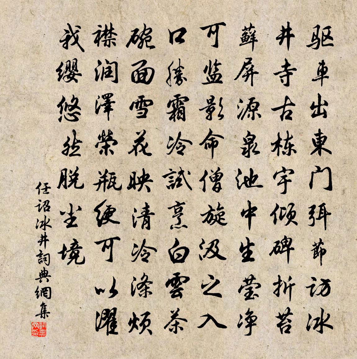 詩詞名句歷史字典書法欣賞書法字典國語詞典說文解字康熙字典古漢語字典標 題 作 者 詩 句 冰井作者:任詔 朝代:宋代冰井原文驅車出東門,弭節訪冰井。寺古棟宇傾,碑折苔蘚屏。源泉池中生,瑩淨可監影。命僧旋汲之,入口勝霜冷。試烹白雲茶,碗面雪花映。清冷滌煩襟,潤澤榮瓶綆。可以濯我纓,悠然脫塵境。詩詞問答問:冰井的作者是誰?答:任詔問:冰井寫於哪個朝代?答:宋代任詔冰井書法欣賞冰井書法作品詩詞推薦張守送羊羔酒將以三絕次韻答之陳造〔宋代〕瓮中別作一家春,羒羜微生得效珍。少貸陶家煎雪水,更論徐邈對賢人。和張秘丞燈夕韻四首劉克莊〔宋代〕牧守二期方奉計,末期君已得民和。不愁米送官倉少,但怪蓮開陸地多。座客共沾眉壽酒,廄人預戒早朝珂。諸公九懷鴟夷子皮高似孫〔宋代〕江欲冷兮丹楓,月將缺兮初鴻。天如仄兮沉兮波,楫有聲兮追風。易莫易兮謀取功,難莫離兮圖終。東山兮誰作,眼兒媚(和八窗叔韻送之)李曾伯〔宋代〕公歸東里我西州。楓荻楚天秋。烏檣轉首,暮雲江樹,落日沙頭。瞿唐此去風濤惡,寧願賈胡留。明年春晚,松江次韻汪翔甫和西城呂全州見過四首方回〔宋代〕驟見累侯印,遄聞趣相裝。相期終古事,未用暫時香。清論玉霏麈,高眠雷撼床。前魚又堪笑,紅袖泣龍陽。八聲甘州·對瀟瀟暮雨灑江天柳永〔宋代〕對瀟瀟暮雨灑江天,一番洗清秋。漸霜風淒緊,關河冷落,殘照當樓。是處紅衰翠減,苒苒物華休。唯有長江水,山家宋自遜〔宋代〕一片青山水四圍,家家有竹護柴扉。養成猿鶴通人語,放去牛羊識路歸。紫蕨甘肥輕鼎味,綠蓑安穩勝朝衣。浮雲費華文輓詩二首魏了翁〔宋代〕謹厚傳燕國,寬和似蜀公。材猷今世楷,論建古人風。閱世心猶壯,憂時鬢已翁。芸芸今有盡,歸去得全終。再次韻奉答子由黃庭堅〔宋代〕蠆尾銀鉤寫珠玉,剡藤蜀繭照松煙。似逢海若談秋水,始覺醯雞守瓮天。何日清揚能覿面,只今黃落又凋年。萬錢太皇太后合春帖子趙湘〔唐代〕殘冰未放溝聲滑,小雨頻催柳色新。晝漏漸長無一字,坐披黃老味天真。同外孫文九新春五絕句蘇轍〔宋代〕築室恨除千本竹,及春先補百株花。隔年預與園夫約,春雨晴時問汝家。春晚方岳〔宋代〕青梅如豆帶煙垂,紫蕨成拳著雨肥。只有小橋楊柳外,杏花未肯放春歸。望夫石唐彥謙〔唐代〕江上見危磯,人形立翠微。妾來終日望,夫去幾時歸。明月空懸鏡,蒼苔漫補衣。可憐雙淚眼,千古斷斜暉。宴安樂公主宅得空字宋之問〔唐代〕英藩築外館,愛主出王宮。賓至星槎落,仙來月宇空。玳梁翻賀燕,金埒倚晴虹。簫奏秦台里,書開魯壁中。短歌示二子陸游〔宋代〕豈不懷榮畏友朋,一生凜凜蹈春冰。任真雖笑拘邊幅,達節寧容出準繩。自喜殘年如白傳,更憐諸子慕崔丞。耄期園中小飲陸游〔宋代〕此老胸中萬頃寬,小園幽徑日追歡。寧教酒欠尋常債,恥就人求本分官。高柳陰濃煙欲暝,叢花紅濕露初漙。要知入白水次韻劉漫其詩劉子翬〔宋代〕南山北山舊經行,諸劉相看如弟兄。一枰圍棋果敵國,五字琢句真長城。濁醪粗飯有餘樂,小几疏簾何太清。我來木蘭花慢劉秉忠〔元代〕到閒人閒處,更何必,問窮通。但遣興喔詩,洗心觀易,散步攜筇。浮雲不堪攀慕,看長空、淡淡沒孤鴻。今古漁虞美人(即事)王質〔宋代〕綠陰夾岸人家住。橋上人來去。行舟遠遠喚相應。全似孤煙斜日、出閶門。浪花拂拂侵沙觜。直到垂楊底。吳江雖少年問白居易〔唐代〕少年怪我問如何,何事朝朝醉復歌?號作樂天應不錯,憂愁時少樂時多。名句推薦兼相愛,交相利。墨子《墨子·15章 兼愛(中)》 雨橫風狂三月暮,門掩黃昏,無計留春住。歐陽修《蝶戀花·庭院深深深幾許》 明日隔山嶽,世事兩茫茫。杜甫《贈衛八處士》 言不中,行不謹,辱也。王通《中說·卷一·王道篇》 傍鄰聞者多嘆息,遠客思鄉皆淚垂。李頎《聽安萬善吹觱篥歌》 渡頭楊柳青青。枝枝葉葉離情。晏幾道《清平樂·留人不住》 芰荷迭映蔚,蒲稗相因依。謝靈運《石壁精舍還湖中作》 江流天地外,山色有無中。王維《漢江臨泛 / 漢江臨眺》 大丈夫當橫屍戰場,奈何狼藉都市。李大師、李延壽《南史·列傳·卷十九》 無言獨上西樓,月如鉤。李煜《相見歡·無言獨上西樓》
