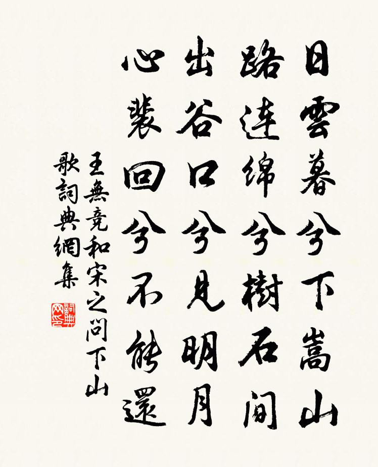 詩詞名句歷史字典書法欣賞書法字典國語詞典說文解字康熙字典古漢語字典標 題 作 者 詩 句 和宋之問下山歌作者:王無競 朝代:唐代和宋之問下山歌原文日雲暮兮下嵩山,路連綿兮樹石間。出谷口兮見明月,心裴回兮不能還。詩詞問答問:和宋之問下山歌的作者是誰?答:王無競問:和宋之問下山歌寫於哪個朝代?答:唐代問:和宋之問下山歌是什麼體裁?答:七古王無競和宋之問下山歌書法欣賞和宋之問下山歌書法作品注釋全唐詩:卷67_2詩詞推薦偈頌十八首釋師體〔宋代〕西土尊師故紙羅,南方歷祖葛藤窠。臨風剔起透青眼,跟腳從頭覷破那。阿呵呵,會也麽,尺水休夸一丈波。幕天秋夕書事劉兼〔唐代〕搖落江天萬木空,雁行斜戛塞垣風。征閨搗月離愁遠,舊館眠雲旅夢通。郢客豈能陪下里,皋禽爭肯戀樊籠。此心水龍吟(雲麓新葺北墅園池)吳文英〔宋代〕好山都在西湖,斗城轉北多流水。屋邊五畝,橋通雙沼,平煙蘸翠。旋疊雲根,半開竹徑,鷗來須避。四時長把酒又和春雨楊萬里〔宋代〕向來一旱鬢成絲,敢道新年雨腳垂。未必催詩真強管,端令學稼失愁思。只今且莫傾三峽,此後時須示一犁。未愛題梨嶺歐陽詹〔唐代〕南北風煙即異方,連峰危棧倚蒼蒼。哀猿咽水偏高處,誰不沾衣望故鄉。晚歸石湖范成大〔宋代〕何須駟馬銜鄉關,只作歸農老圃看。夢裡曾腰綪結佩,年來新著惰游冠。和煙種竹聊醫俗,帶月聞蛙不在官。久矣爛柯山四首。最高頂劉迥〔唐代〕白雲引策杖,苔徑誰往還。漸見松樹偃,時聞鳥聲閒。豁然喧氛盡,獨對萬重山。過郭代公故宅杜甫〔唐代〕豪俊初未遇,其跡或脫略。代公尉通泉,放意何自若。及夫登袞冕,直氣森噴薄。磊落見異人,豈伊常情度。定策辭本州教官王致〔宋代〕年近古稀有,不易升此堂。他日留泉下,須留姓氏香。哭五一弟先輩二首劉克莊〔宋代〕未冠辭家出, * 不肯回。瘦因身久客,貧為性疏財。精力書中去,科名病里來。空傳場屋義,留與鋪家開。喜寶積智軫道人惠書偈張耒〔宋代〕南山老禪翁,白淨如水月。我初獲親近,解此痴腦結。十年歸故里,父老半存滅。逢師百如舊,才若旦夜別。故知望江南/憶江南邵伯溫〔宋代〕百尺長藤垂到地,千株喬木密參天。只在郡城邊。壽鄧子西知縣陽枋〔宋代〕猗猗竹繞鄧家灣,亭亭屋背圍山中。當軒水花日噴薄,覆戶雲葉時斕斑。中有立士金閨客,元洞府生人間見。捧觴宿翠岩寺呈李弘齋簽判裘萬頃〔宋代〕匡廬勝處君曾到,誰是淵明與遠公。幸有和陶詩卷在,好依蓮社此山中。贈蘇味道杜審言〔唐代〕北地寒應苦,南庭戍未歸。邊聲亂羌笛,朔氣卷戎衣。雨雪關山暗,風霜草木稀。胡兵戰欲盡,漢卒尚重圍。雲淨和顏長官百詠貧女朱繼芳〔宋代〕伯鸞興和悵誰從,鳳尾香衾翠謾重。靜對菱花勻淚粉,不知膏沐若為容。贈太師中書令王公輓辭二首蘇頌〔宋代〕族茂仙緱系,恩隆帝渚姻。兩朝全寵遇,一節貫忠純。敦說耽儒術,沖和味道真。樞庭十五載,當寧倚良臣。宜春台李覯〔宋代〕謫官誰住小蓬萊,唯有宜春有古台。千里待看毫末去,萬家攢作畫圖來。雲中羅綺香風落,月底笙歌醉夢回。莫怪八詠樓謝翱〔宋代〕江山此愁絕,寒角夢中吹。飛鳥過帆影,游塵空戟枝。水交明月動,槎洑故州移。已薄齊梁士,猶吟沈約詩。九里松鄧林〔宋代〕松是山靈一手栽,堯天長就棟樑材。龍髯怒起春風急,似怪遊人喝道來。名句推薦鵲橋波里出,龍車霄外飛。任希古《和長孫秘監七夕》 月兒彎彎照九州,幾家歡樂幾家愁。佚名《月兒彎彎照九州》 欲系青春,少住春還去。朱淑真《蝶戀花·送春》 漸老多憂百事忙,天寒日短更心傷。李覯《秋晚悲懷》 歸師勿掩,窮寇莫追。羅貫中《三國演義·第九十五回》 平生端有活國計,百不一試薶九京。黃庭堅《送范德孺知慶州》 道本足於身,切實求來,則常若不足矣王永彬《圍爐夜話·第一一三則》 燈半昏時,月半明時。徐再思《折桂令·春情》 春日遲遲,卉木萋萋。佚名《出車》 法之善惡,莫以文也,乃其行焉;刑之本哉,非罰罪也,乃明罪焉。來俊臣《羅織經·問罪卷第十》