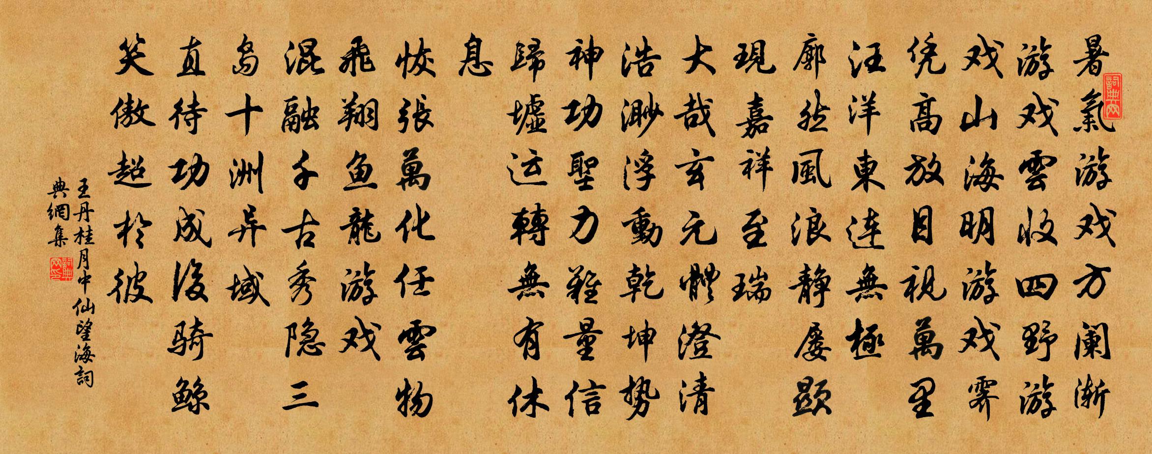詩詞名句歷史字典書法欣賞書法字典國語詞典說文解字康熙字典古漢語字典標 題 作 者 詩 句 月中仙 望海作者:王丹桂 朝代:元代月中仙 望海原文暑氣遊戲方闌,漸遊戲雲收四野遊戲,山海明遊戲霽。憑高放目,視萬里汪洋,東連無極。廓然風浪靜,屢顯現、嘉祥至瑞。大哉玄元體,澄清浩渺,浮動乾坤勢。神功聖力難量,信歸墟運轉,無有休息。恢張萬化,任雲物飛翔,魚龍遊戲。混融千古秀,隱三島、十洲異域。直待功成後,騎鯨笑傲超於彼詩詞問答問:月中仙 望海的作者是誰?答:王丹桂問:月中仙 望海寫於哪個朝代?答:元代問:月中仙 望海是什麼體裁?答:詞王丹桂月中仙 望海書法欣賞月中仙 望海書法作品詩詞推薦和李標王蘇蘇〔唐代〕怪得犬驚雞亂飛,羸童瘦馬老 * 。阿誰亂引閒人到,留住青蚨熱趕歸。喬松程珌〔宋代〕風細吹吟鳳,雷驚起蟄龍。幾年臥空谷,今日享真封。錢氏隱居三首李流謙〔宋代〕遠樹高低見,清溪曲折流。草眠耕後犢,波泛狎余鷗。醒醉無人管,登臨各自愁。扁舟大如葉,爛漫作春遊。萬年春 中秋劉志淵〔元代〕秋夜銀蟾,一天萬里光如洗。清風細。拂拭乾坤,冰瑩無纖翳。星光沉,全露圓明體。白麾底。晃我神遊,親詣攀寄徐拾遺譚用之〔唐代〕長竿一系白龍吟,誰和騶虞發素琴。野客碧雲魂易斷,故人芳草夢難尋。天從補後星辰穩,海自潮來島嶼深。好向留詩李公佐仆〔唐代〕我有衣中珠,不嫌衣上塵。我有長生理,不厭有生身。江南神仙窟,吾當混其真。不嫌市井喧,來救世間人。蘇子西江月陳三聘〔宋代〕詩眼曾逢花面,畫圖還識春嬌。當年風格太妖饒。粉膩酥柔更好。酒暈不溫香臉,玉慵猶怯輕綃。春風別後又秋高病中放言五首韓元吉〔宋代〕長夏空齋冷欲冰,幾愁無米溷鄰僧。途窮誰為一舉手,計拙自宜三折肱。風靜鳶飛猶跕跕,日斜蚊聚已{甍瓦換羽題抱膝庵王柏〔宋代〕一室方方丈,名標抱膝新。有書宜勘古,無學可留賓。靜坐神明固,清談滋味真。傳家名刻在,長對草廬人。宿吳匡山破寺皎然〔唐代〕雙峰百戰後,真界滿塵埃。蔓草緣空壁,悲風起故台。野花寒更發,山月暝還來。何事池中水,東流獨不回。刺桐朱繼芳〔宋代〕刺桐依客舍,晴綠上窗紗。昨夜還飛葉,來時未作花。鴉寒驚月色,人老惜年華。今度逢搖落,歸心一倍加。望蓬萊王哲〔元代〕未入道,休要執中迷。先且牢擒劣馬子,切須縛住耍猿兒。款款做修持。如省悟,勘破女男妻。自在假身常鍛鍊,贈江州李十使君員外十二韻白居易〔唐代〕我本江湖上,悠悠任運身。朝隨賣藥客,暮伴釣魚人。跡為燒丹隱,家緣嗜酒貧。經過剡溪雪,尋覓武陵春。豈有次子泉韻葛起耕〔宋代〕一聲鶗鴃又春休,風簸榆錢滿地流。燕子不積壓花落盡,等閒飛過柳連樓。朝中措 拋俗王丹桂〔元代〕宦途好似水,東流得失幾時休。選甚王侯黎庶,無常限到難留。爭如解放名韁鎖,且免了閒愁。異日三丹結正,攜尾犯·夜雨滴空階柳永〔宋代〕夜雨滴空階,孤館夢回,情緒蕭索。一片閒愁,想丹青難貌。秋漸老、蛩聲正苦,夜將闌、燈花旋落。最無端處,鴛鴦湖棹歌 之九十九朱彝尊〔清代〕歸人萬里望邱為,白酒黃壺瓠作卮。 來往棹歌無不可,西溪東泖任吾之。禪人並化主寫真求贊釋正覺〔宋代〕妙明絕思,廓靜無涯。智空三際,性融二儀。借功光歷歷,借伴老垂垂。文彩縱橫成底事,機關不初不掛梭絲。句陳璹〔宋代〕活計魚暇蟹,此事屬漁舟。送行歌顧況〔唐代〕送行人,歌一曲,何者為泥何者玉。年華已向秋草里,春夢猶傳故山綠。名句推薦吾本乘興而行,興盡而返,何必見戴!劉義慶《世說新語·任誕》 兄弟不睦,則子侄不愛顏之推《顏氏家訓·兄弟篇》 不見穿針婦,空懷故國樓。孟浩然《他鄉七夕》 梅以曲為美,直則無姿;龔自珍《病梅館記》 春風只在園西畔。薺菜花繁胡蝶亂。嚴仁《玉樓春·春思》 假令風歇時下來,猶能簸卻滄溟水李白《上李邕》 兼聽則明,偏信則暗。司馬光《資治通鑑·唐紀八》 何方可化身千億,一樹梅花一放翁。陸游《梅花絕句·其一》 逐流牽荇葉,緣岸摘蘆苗。儲光羲《江南曲四首》 怕歌愁舞懶逢迎。妝晚托春酲。陸游《朝中措·代譚德稱作》